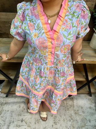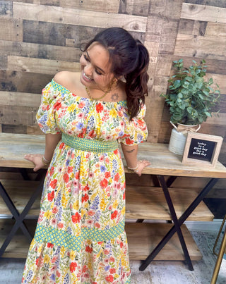Peach Love Yellow Floral Stripe Bubble Slv Maxi Dress