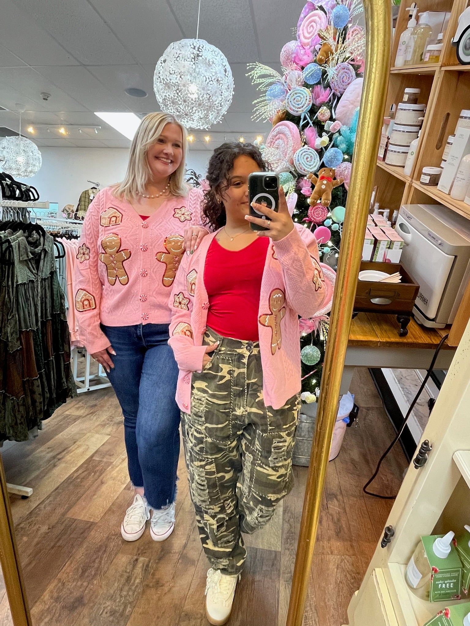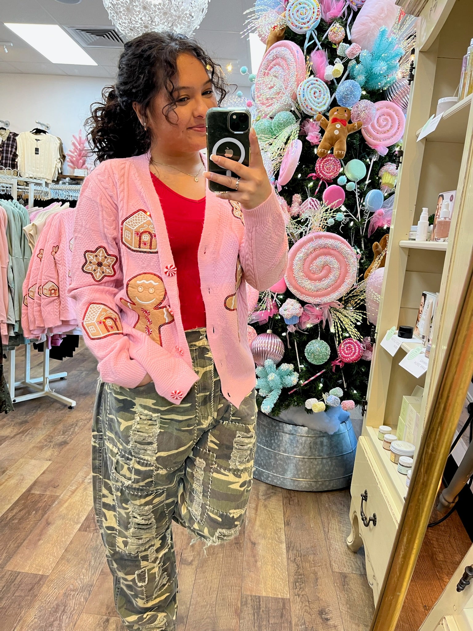 Wrap yourself in cozy charm with this delightful pink cable knit cardigan! Featuring a whimsical gingerbread-inspired design and adorable peppermint buttons that add a festive pop of color, this top is perfect for holiday gatherings or everyday warmth. The soft, textured knit hugs you in all the right ways while the playful details make it an instant conversation starter. Layer it over your favorite tee or wear it solo for effortless style that feels like a warm hug from a friend.