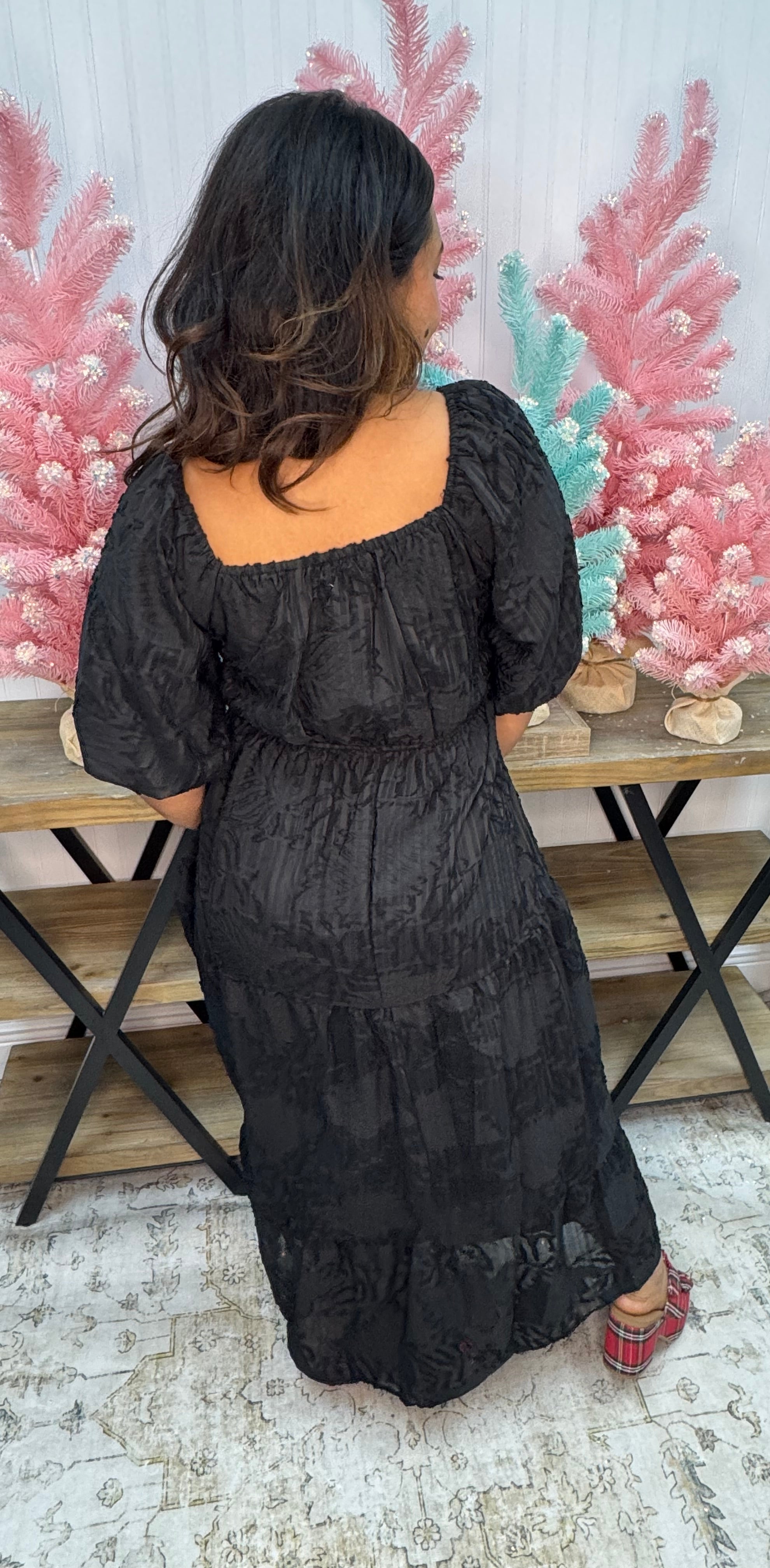 Bring playful elegance to your wardrobe with the Polagram Black Textured Tiered Puff Sleeve Midi Dress. Featuring voluminous puff sleeves and a flirty tiered skirt, its textured fabric adds a twist of charm. This dress balances fun and sophistication effortlessly, making it your go-to for both casual outings and special occasions.