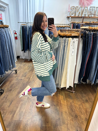 Peach Love Cream & Green Stripe Contrast Placket Sweatshirt