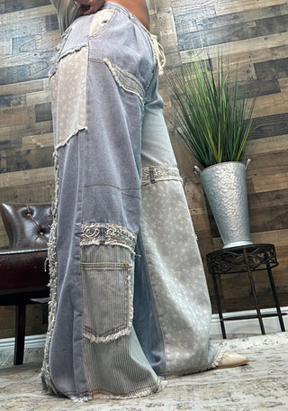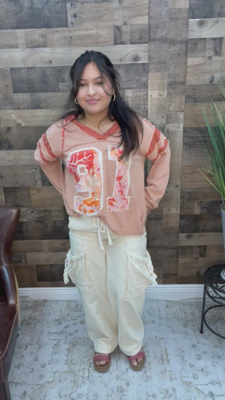 POL Charcoal Peace Long Slv Patchwork Top