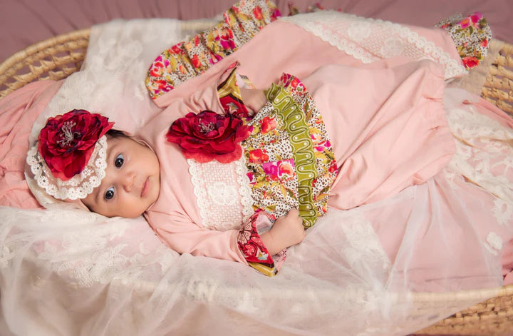 Haute Baby is the epitome of Southern charm! This pink infant gown features gorgeous lace, fun fabric rufles, and a cute flower to finish. Perfect for pictures!