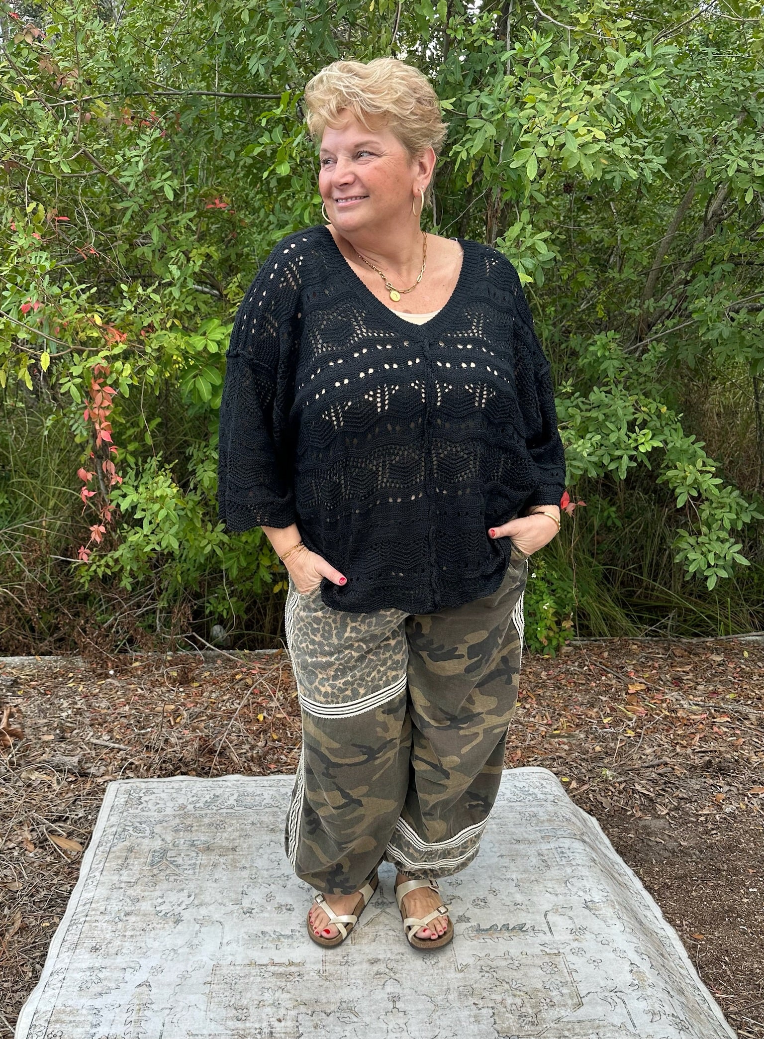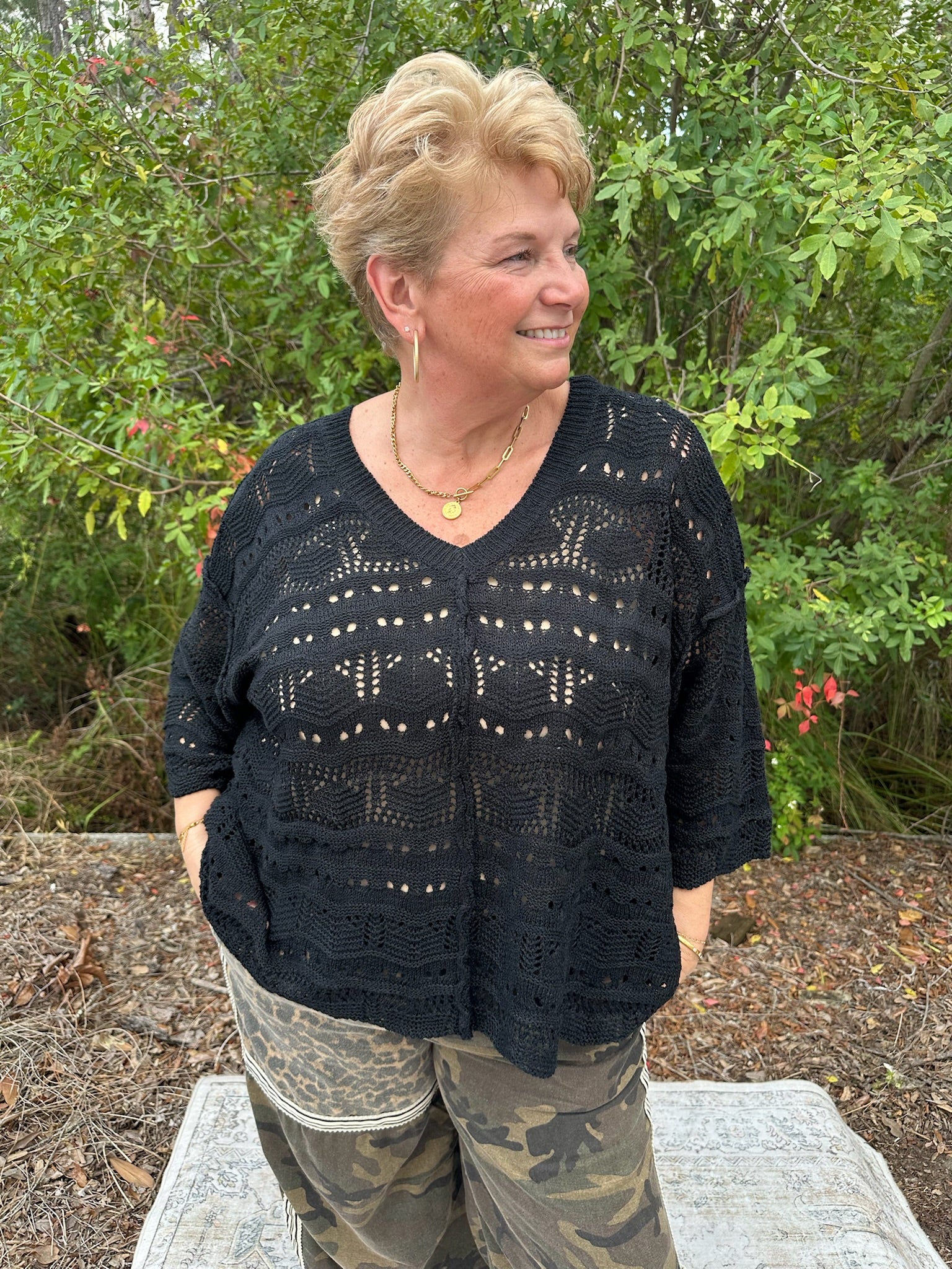 Crochet never looked so chic! This POL black top features delicate short sleeves and a charming scalloped edge that adds instant texture and movement. The intricate crochet knit creates an airy, romantic vibe perfect for layering or wearing solo. Effortlessly versatile, it pairs beautifully with everything from denim to skirts. A wardrobe essential that feels both cozy and undeniably stylish.✨ Welcome to The Gypsy Belle Boutique! ✨