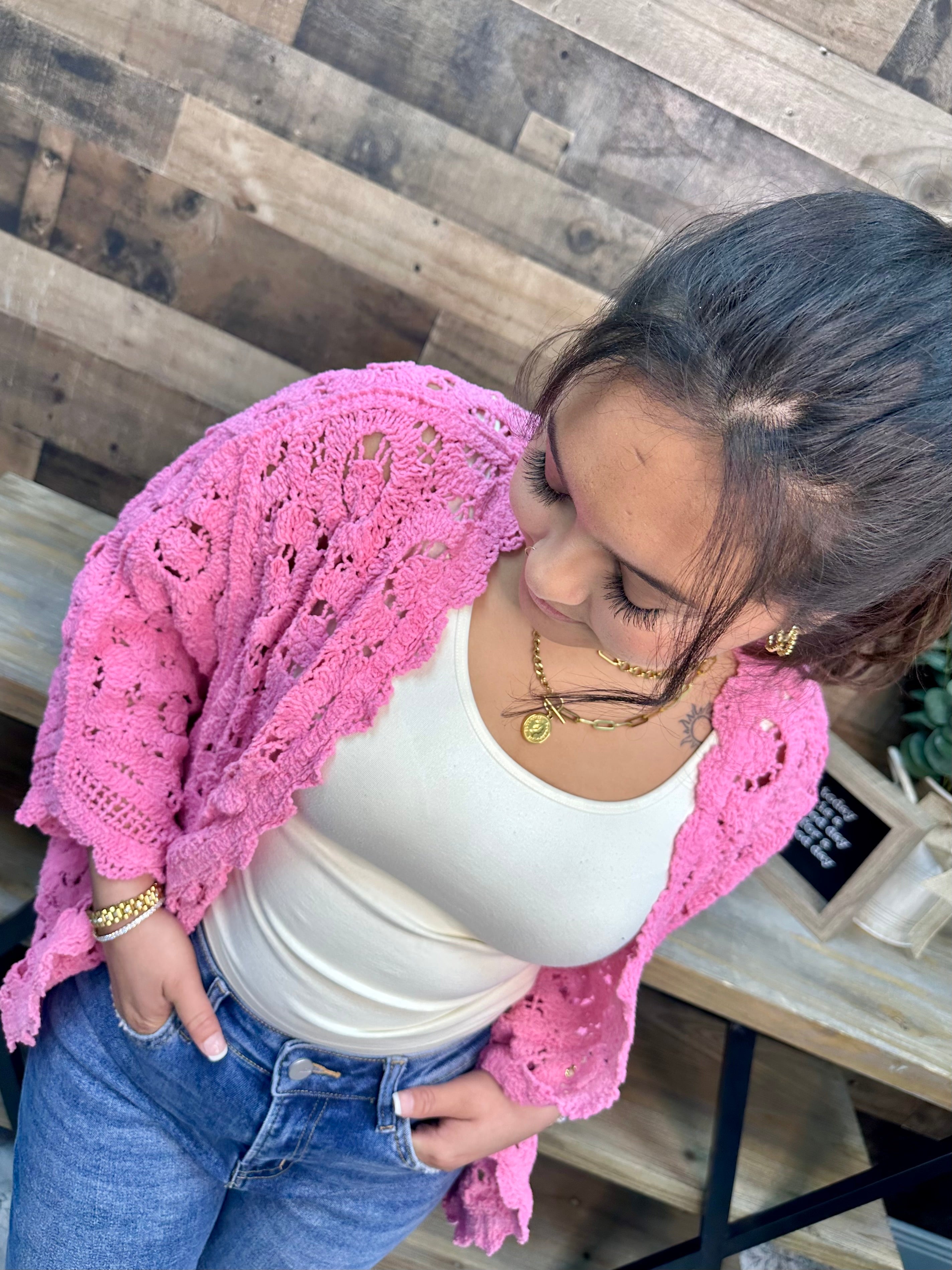 Wrap yourself in cozy charm with the POL Bubblegum Pink Chenille Crochet Cardigan Shrug. Its soft chenille texture and warm pink hue make it the perfect playful layering piece to brighten up any outfit. Whether draped over a tee or styled with your favorite dress, this shrug adds a comfy, chic vibe with a touch of handcrafted flair. Embrace cuddly comfort and effortless style in one adorable package! This ONE SIZE cardigan fits up to a 1X/2X.