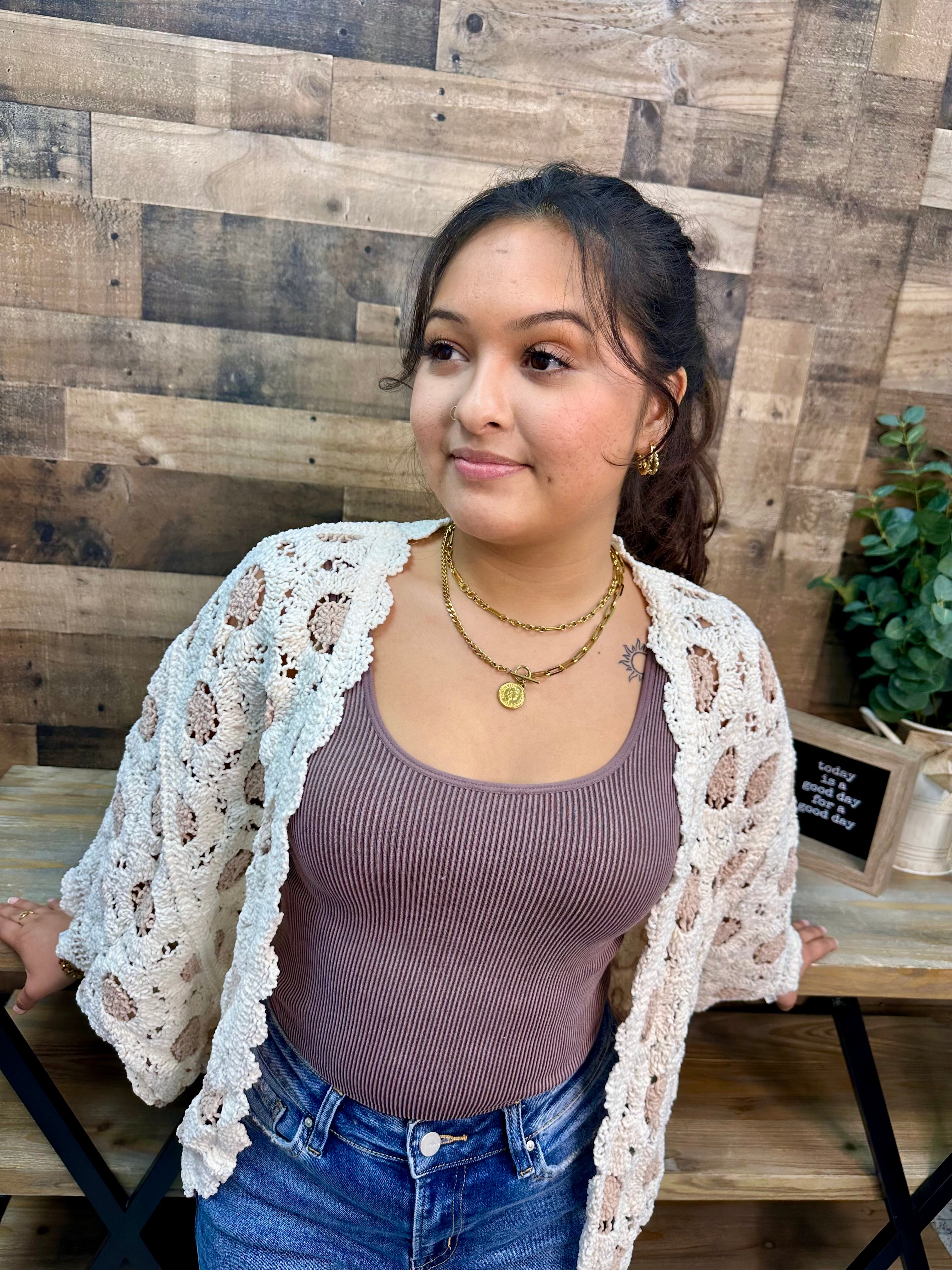 Wrap yourself in cozy charm with the POL Cream & Latte Chenille Crochet Cardigan Shrug. Its soft chenille texture and warm latte hue make it the perfect playful layering piece to brighten up any outfit. Whether draped over a tee or styled with your favorite dress, this shrug adds a comfy, chic vibe with a touch of handcrafted flair. Embrace cuddly comfort and effortless style in one adorable package! This ONE SIZE cardigan fits up to a 1X/2X.