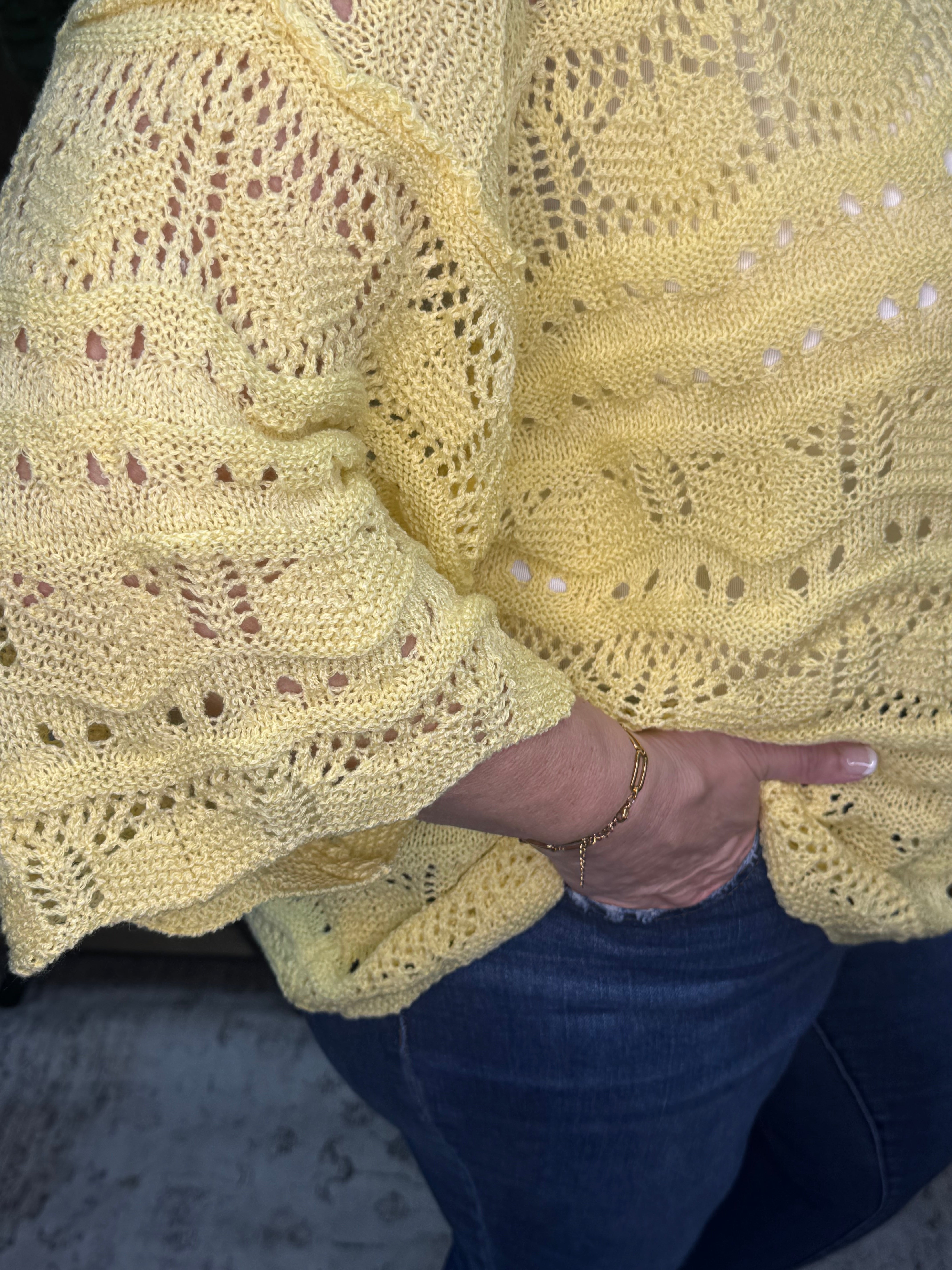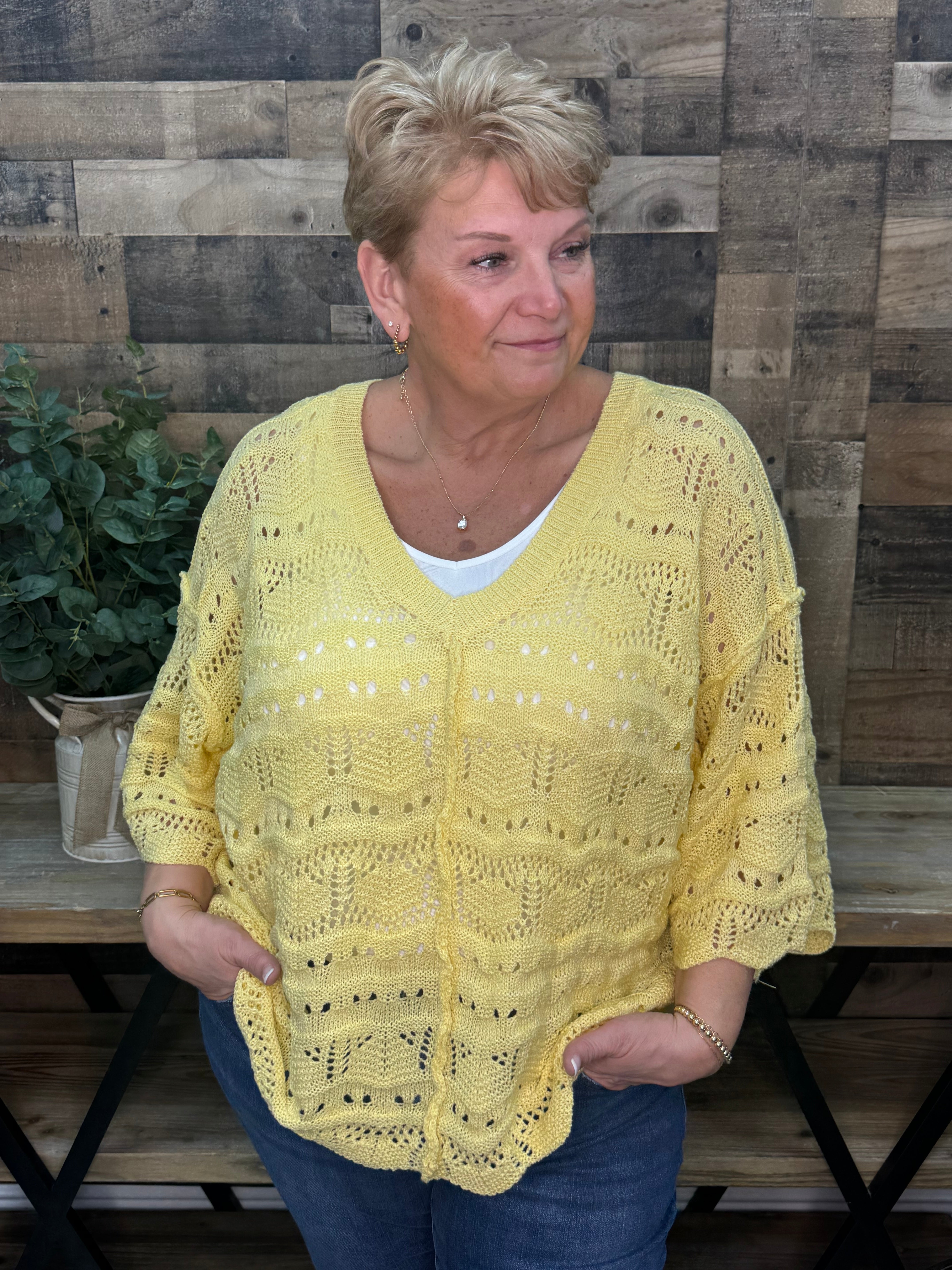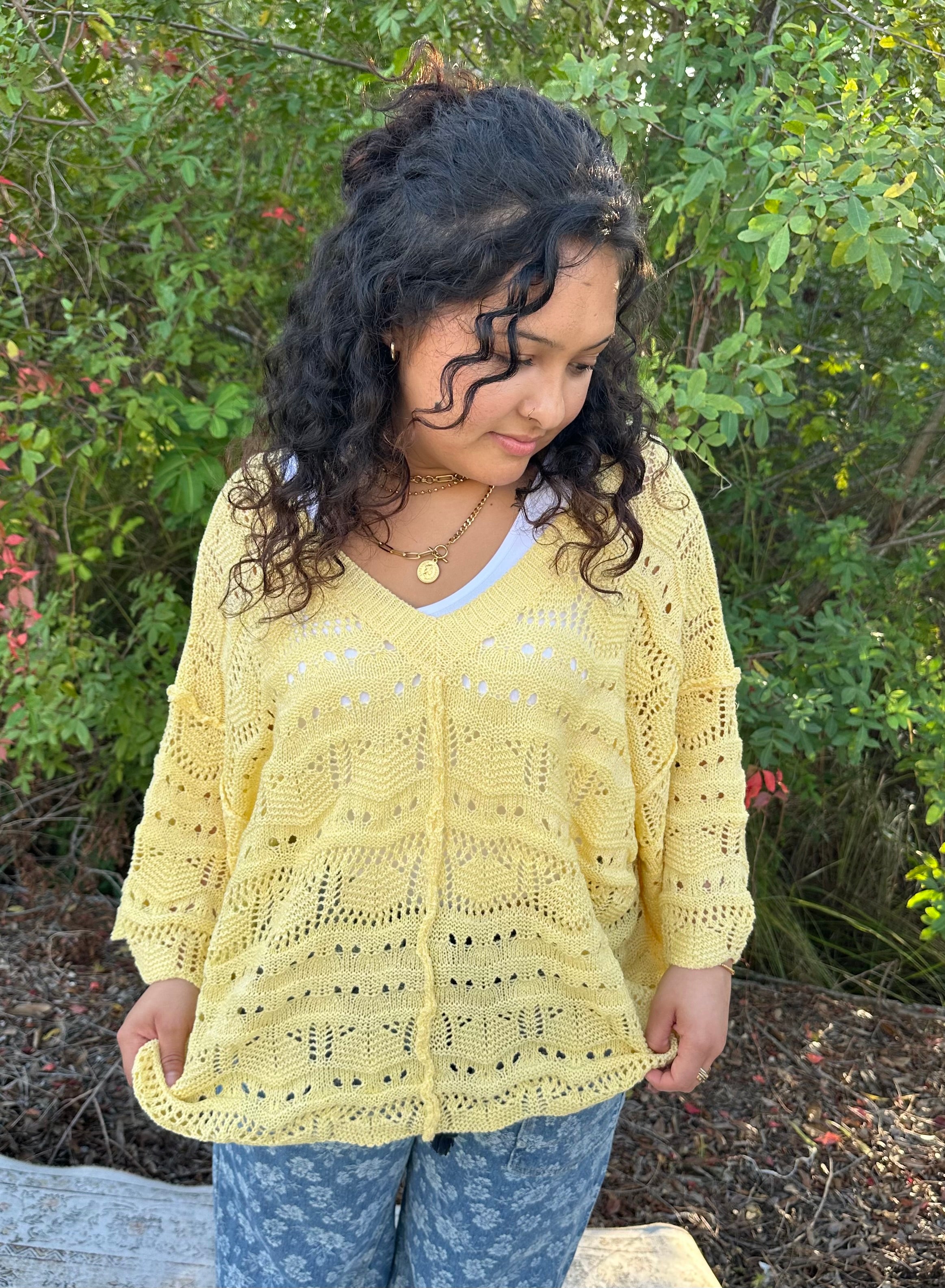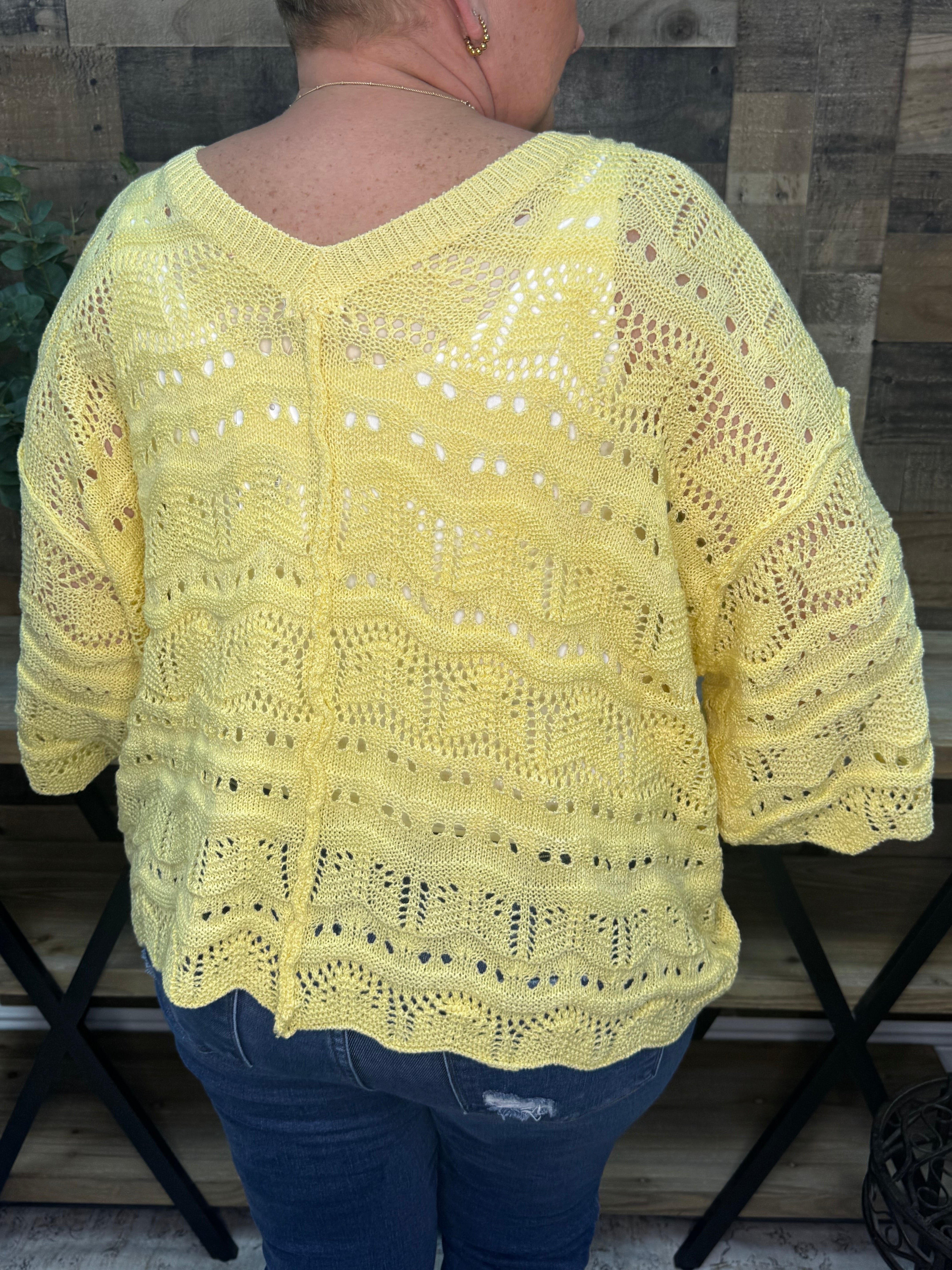 Crochet never looked so chic! This POL dandelion yellow top features delicate short sleeves and a charming scalloped edge that adds instant texture and movement. The intricate crochet knit creates an airy, romantic vibe perfect for layering or wearing solo. Effortlessly versatile, it pairs beautifully with everything from denim to skirts. A wardrobe essential that feels both cozy and undeniably stylish.✨ Welcome to The Gypsy Belle Boutique! ✨