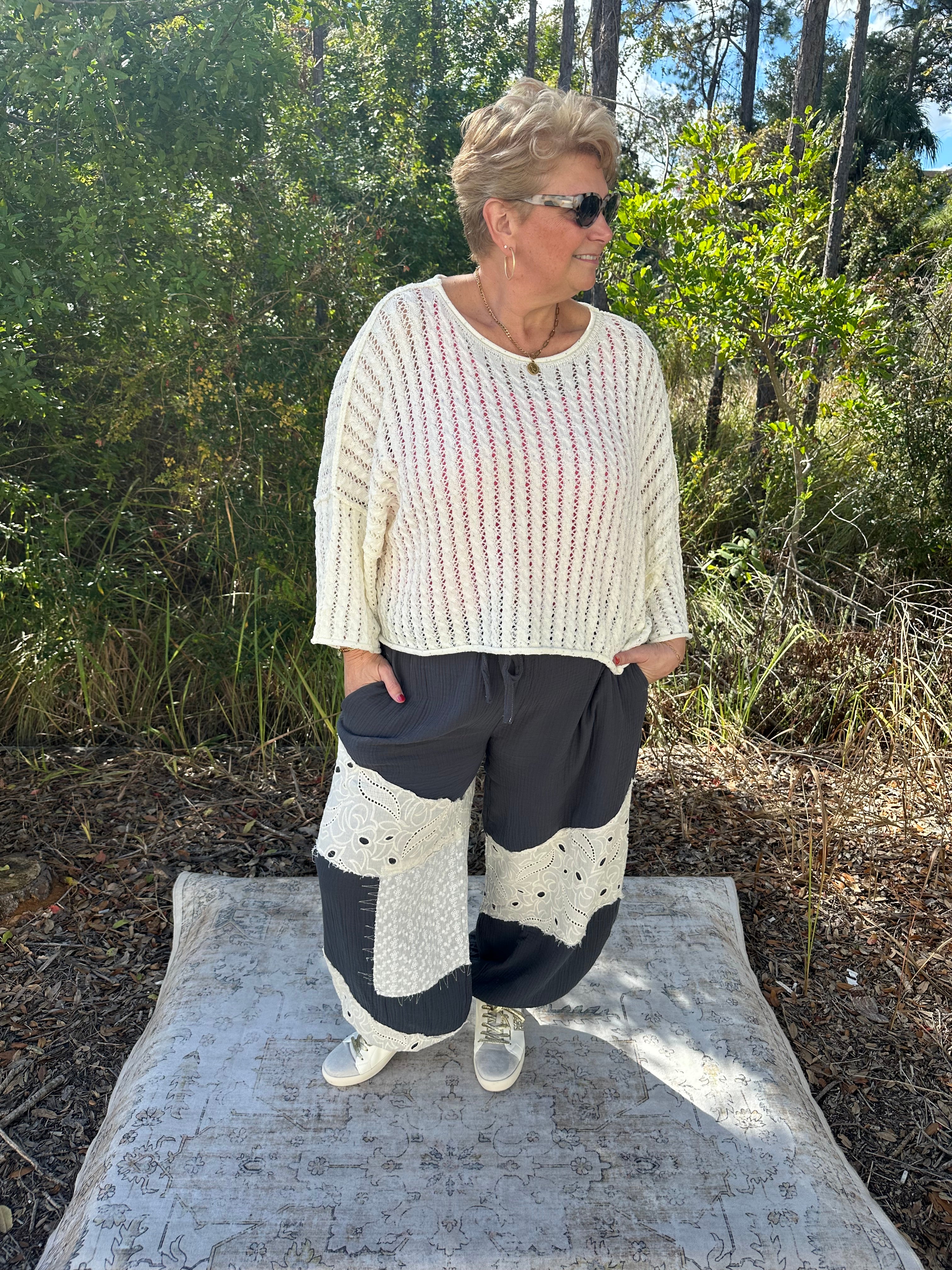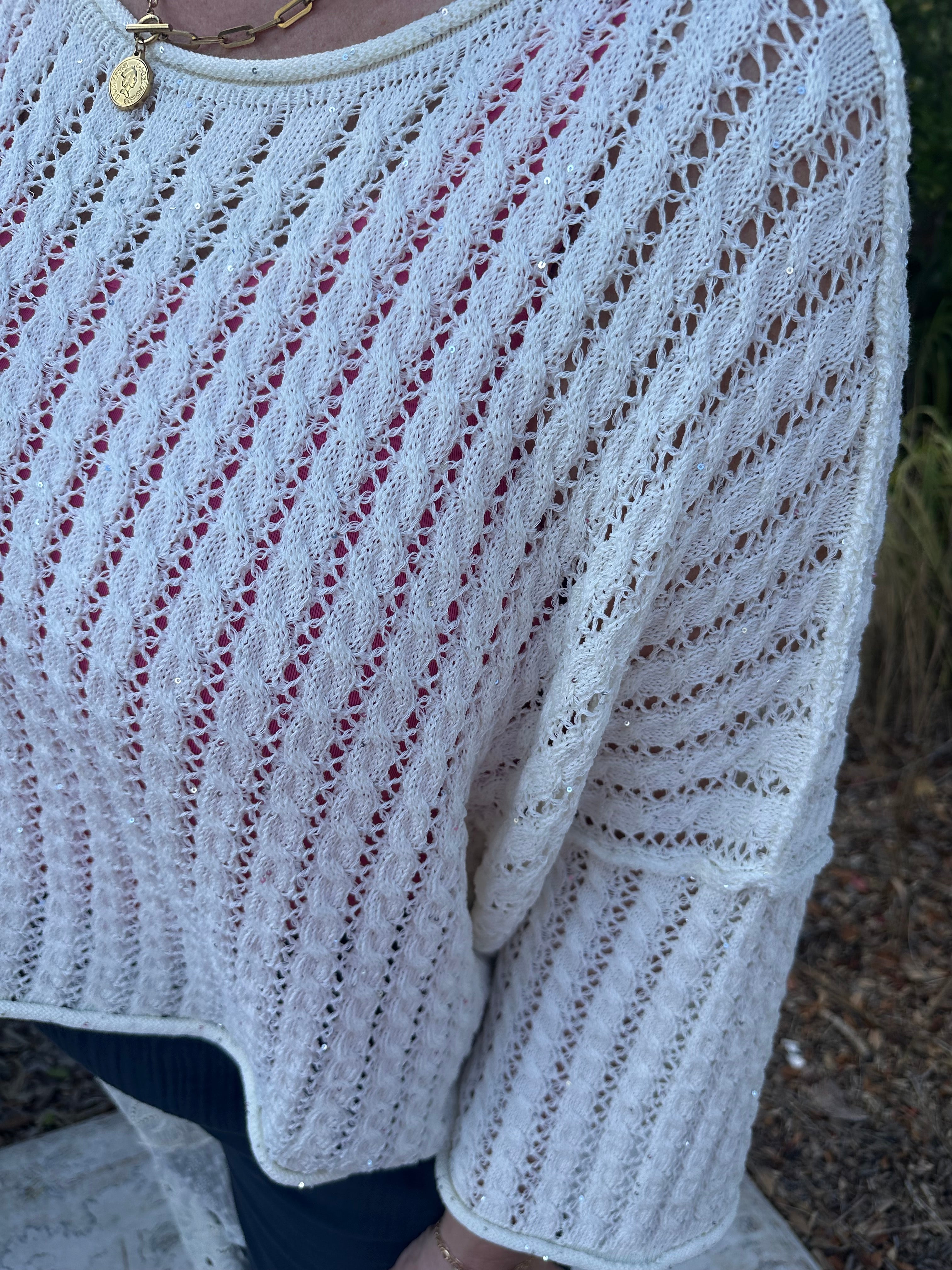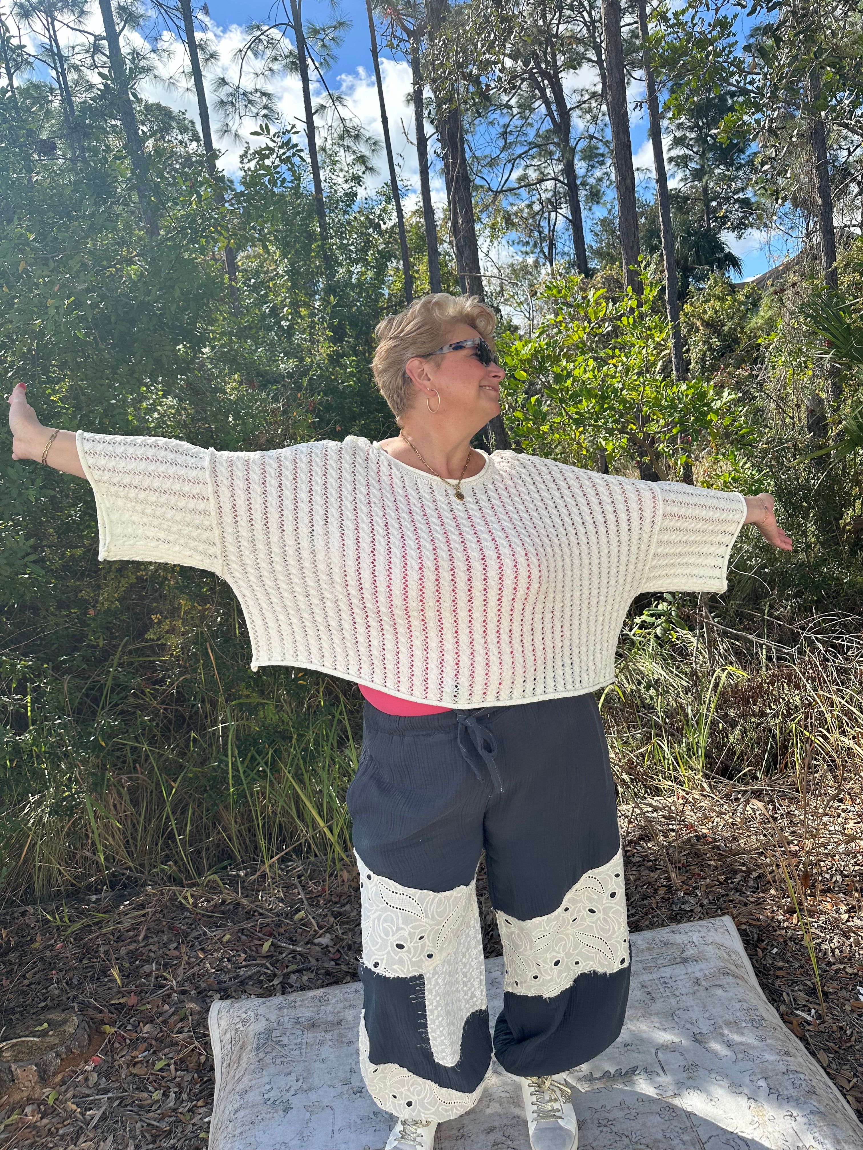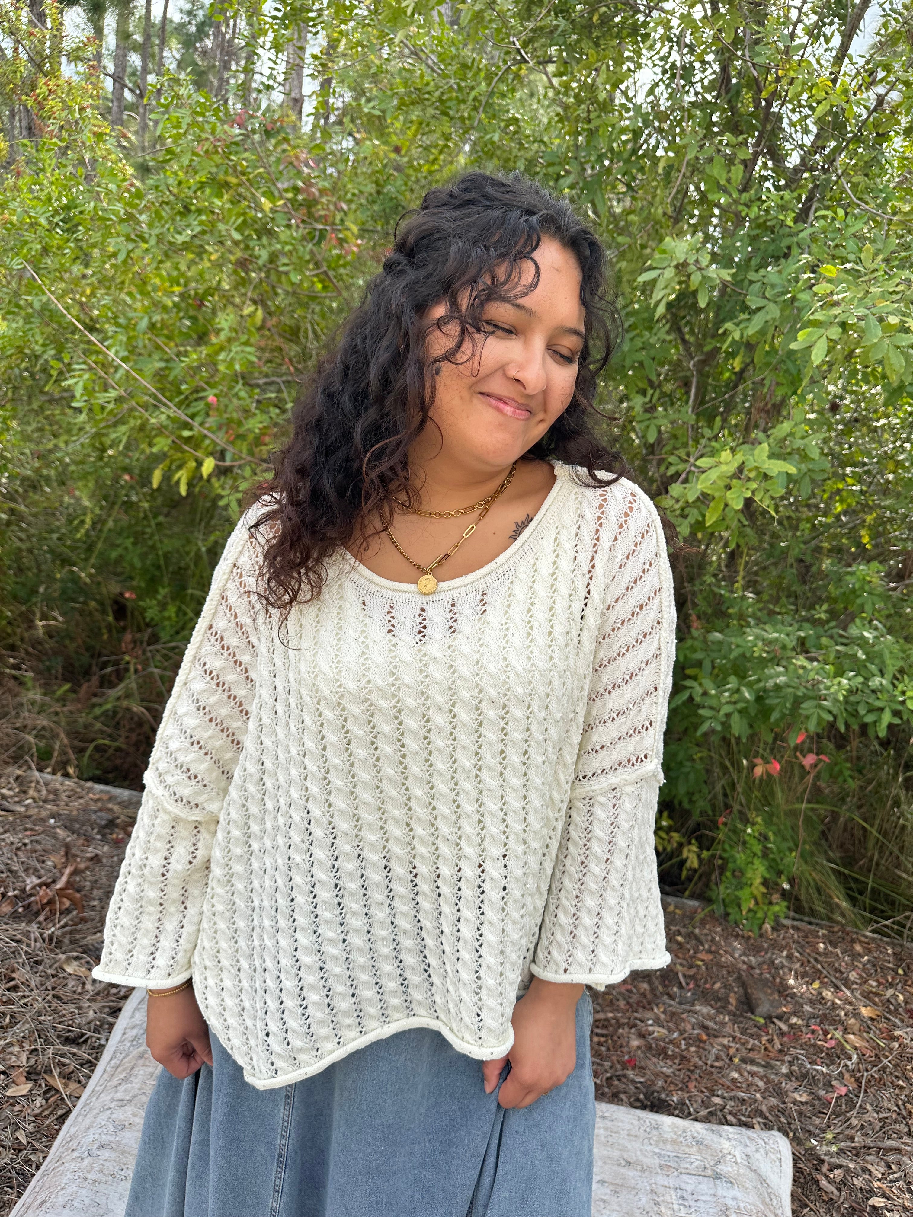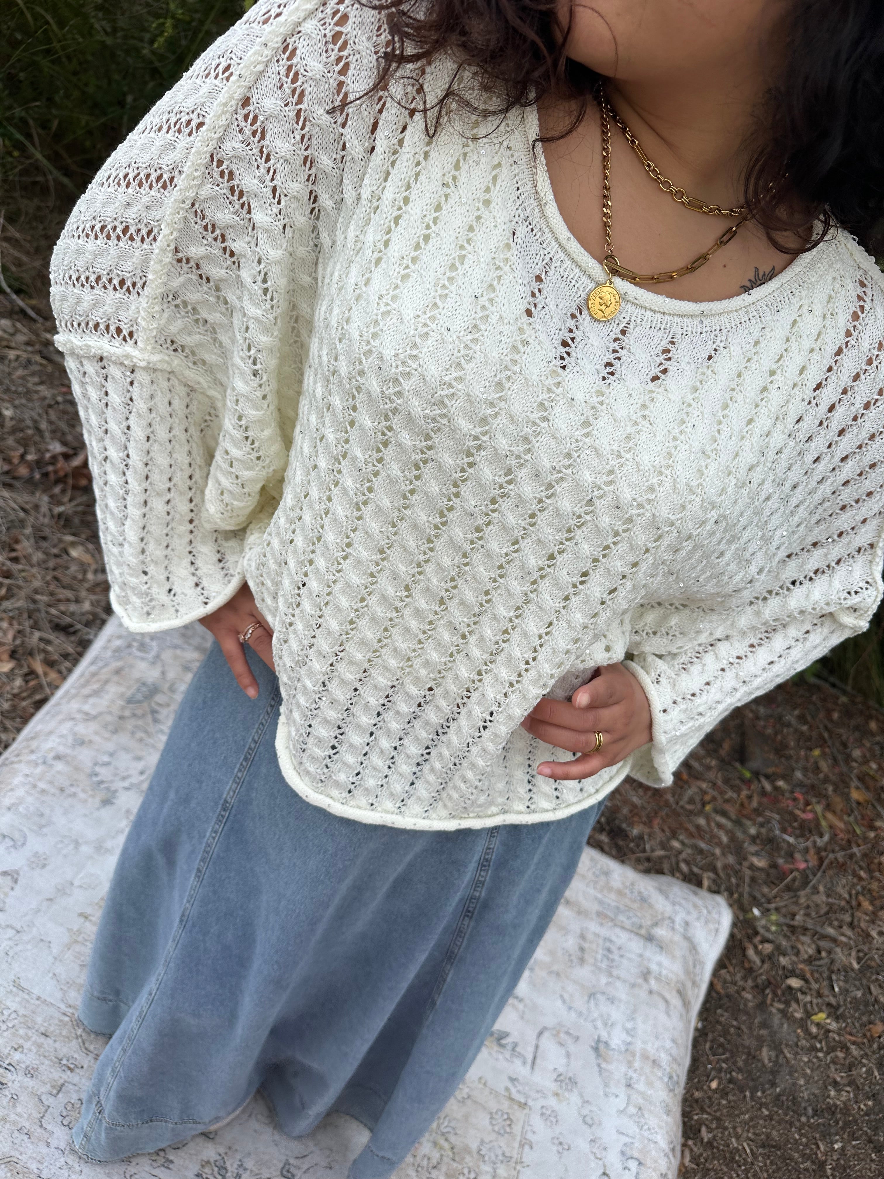 Effortlessly chic meets cozy vibes with this ivory crochet top. The dreamy openwork pattern keeps things breezy while the drop shoulder silhouette adds that laid-back, off-duty cool factor. Perfect for layering over a slip or wearing solo for maximum texture appeal. Short sleeves make it ideal for transitional weather, and the neutral ivory shade pairs with literally everything in your closet. Grab yours and let your style do the talking.