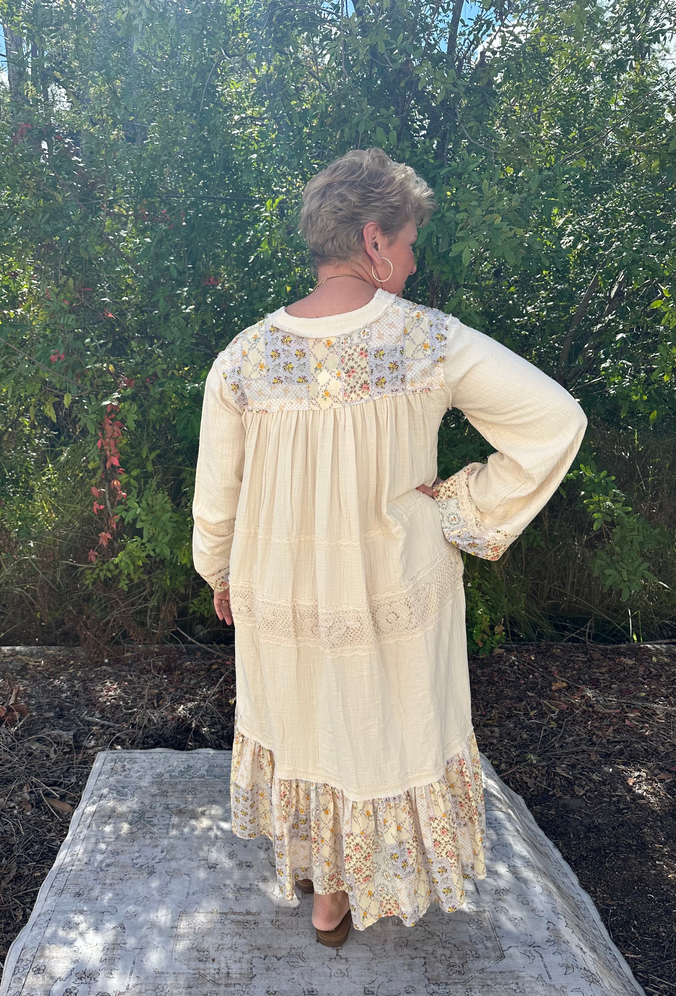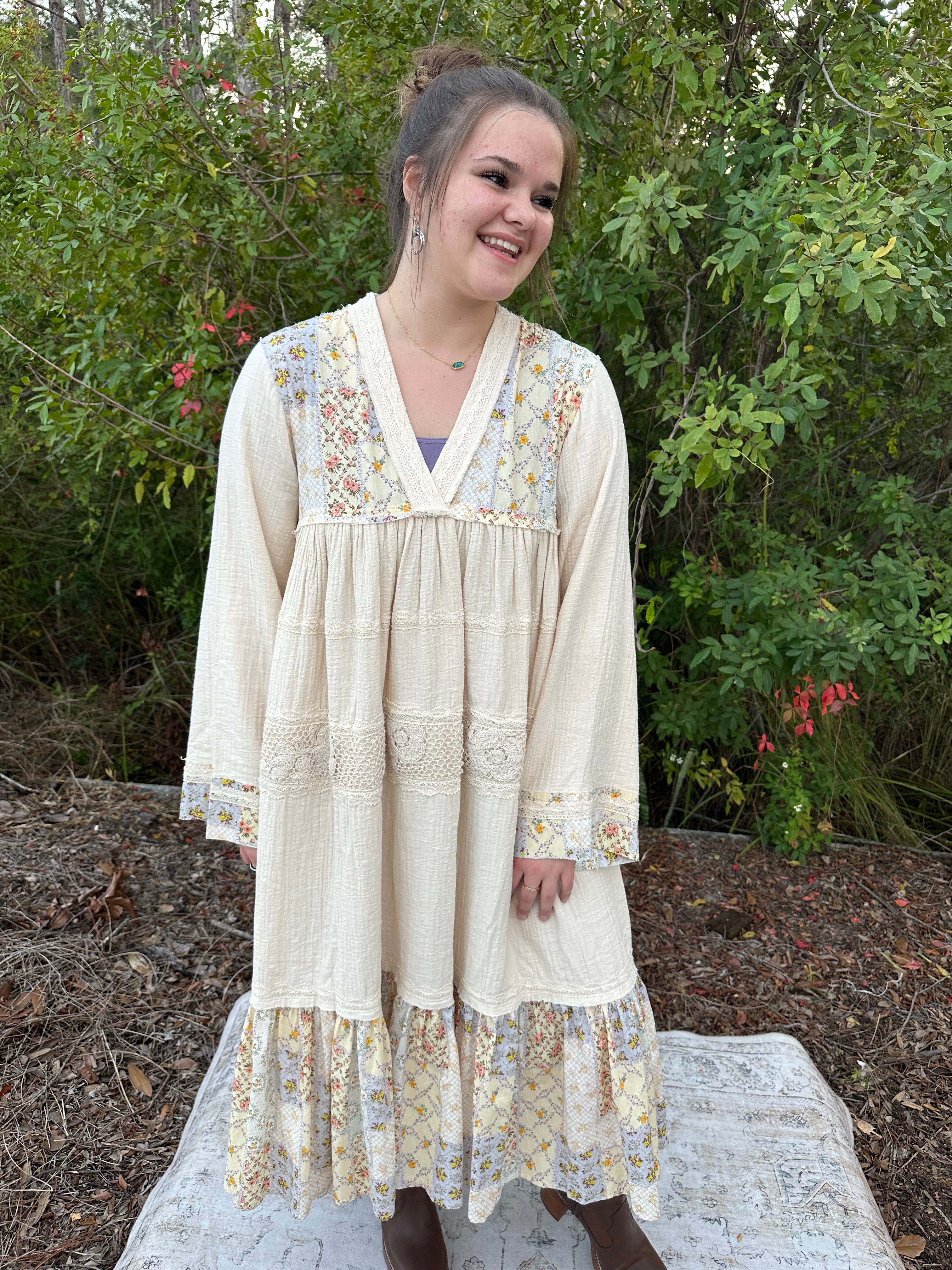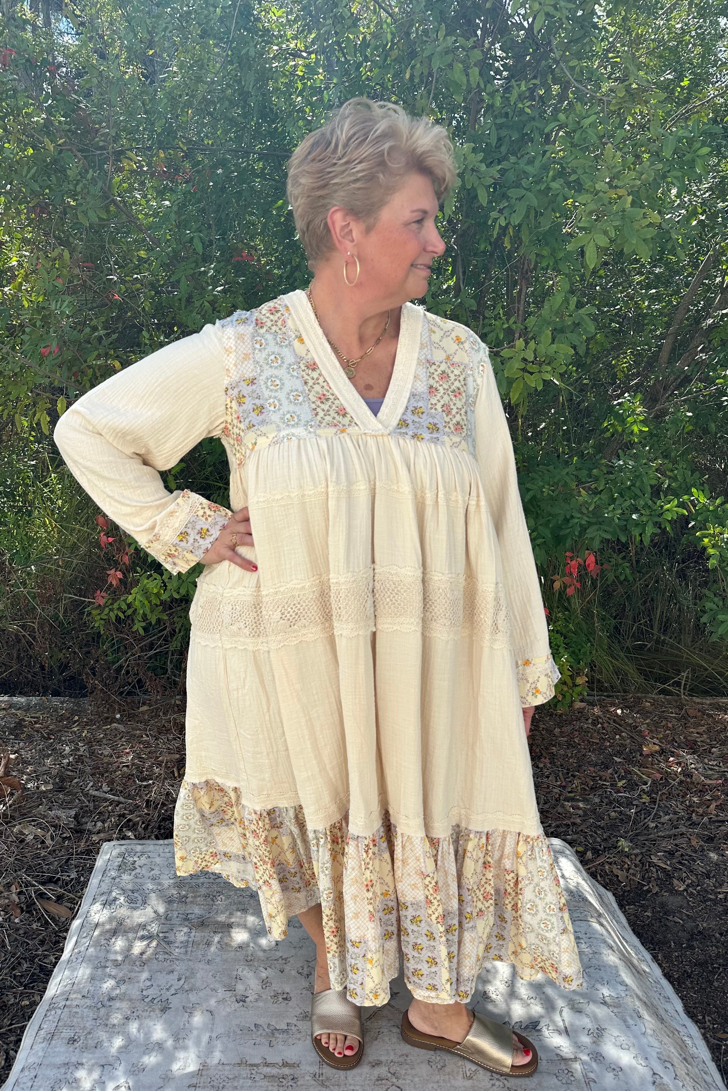 Effortless bohemian charm meets everyday comfort in this POL cotton gauze dress. Featuring delicate tiered layers that create beautiful movement and romantic crochet trim detailing, it's the perfect piece for layering through seasons or wearing solo. Long sleeves offer versatile coverage, while the airy gauze fabric keeps you feeling light and breezy. Whether you're heading to brunch, a casual date, or weekend adventures, this dress brings that carefree, wandering-spirit vibe to any occasion.