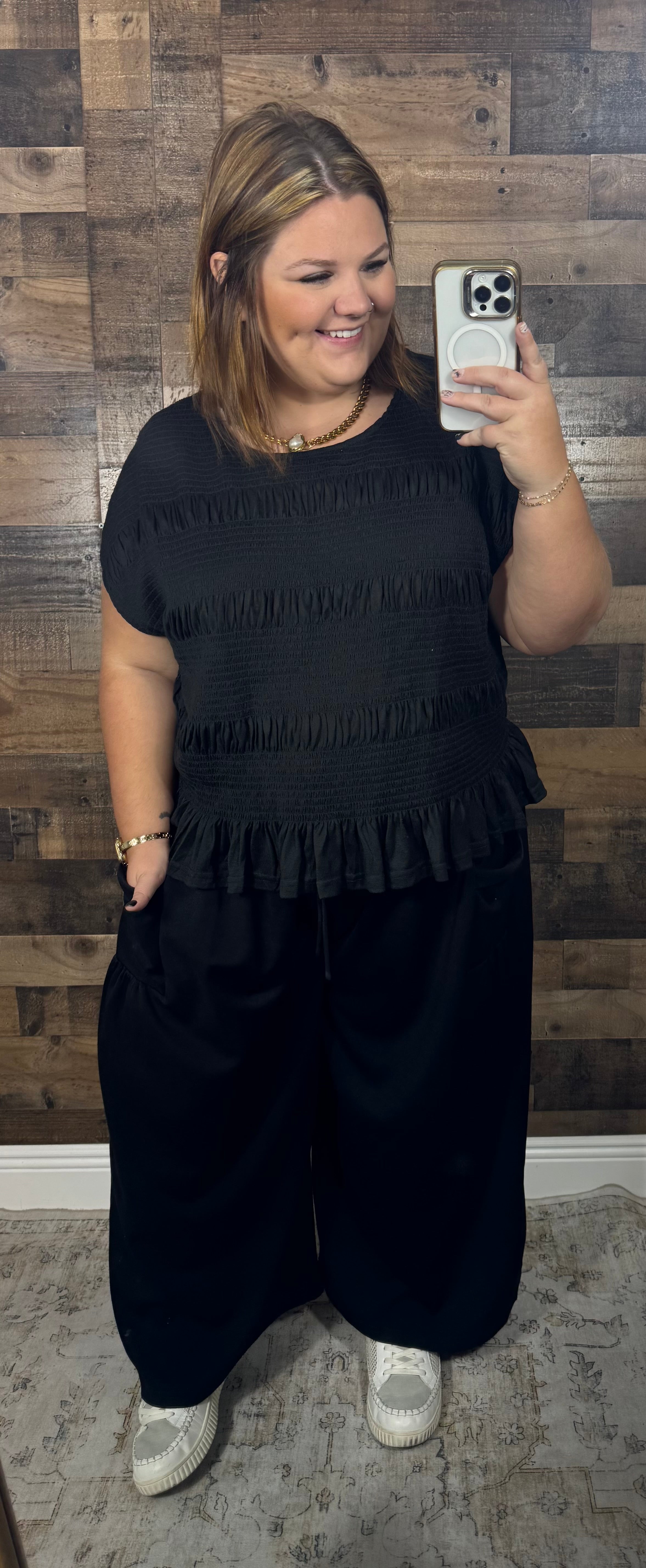 Davi & Dani Ruched BLACK Ruffle Pant & Short Sleeve Top Set