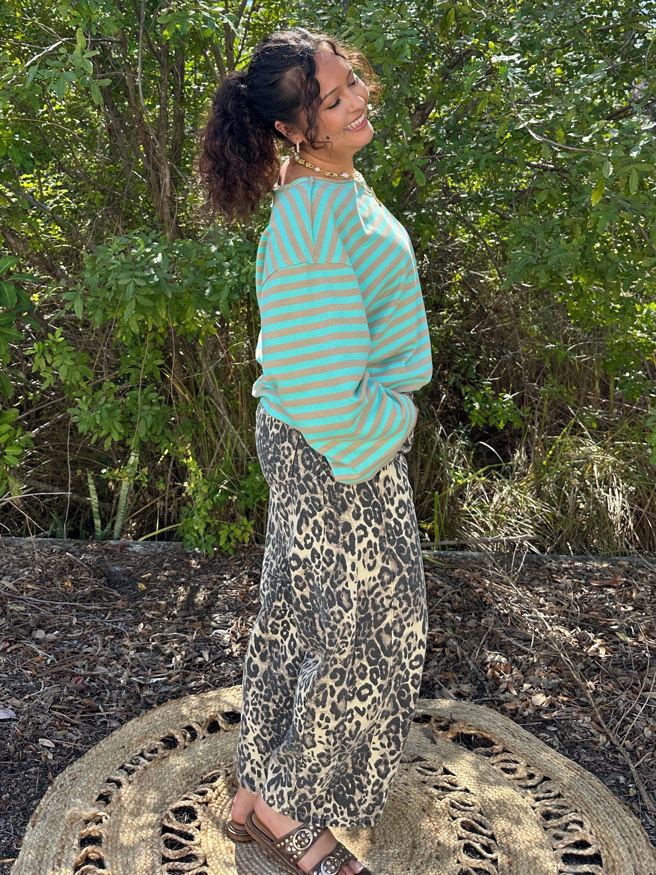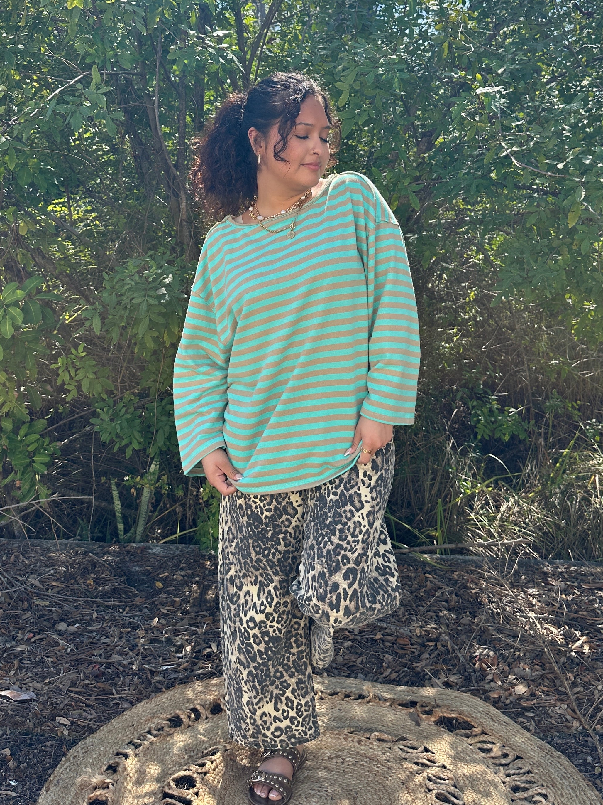 Cool, casual, and just the right amount of cute. This mint and beige striped top is made from the softest French terry that feels like your favorite weekend sweatshirt — but looks a whole lot more put-together. The raw edge details give her that perfectly imperfect vibe we can't get enough of, and the color combo is fresh as a spring morning, sugar. She's the top you throw on when you want to look like you have it all figured out but also want to be comfortable enough to curl up on the porch with a good book. Dress her up with white jeans and wedges or keep it easy with leggings and sneakers — either way, she's a winner.