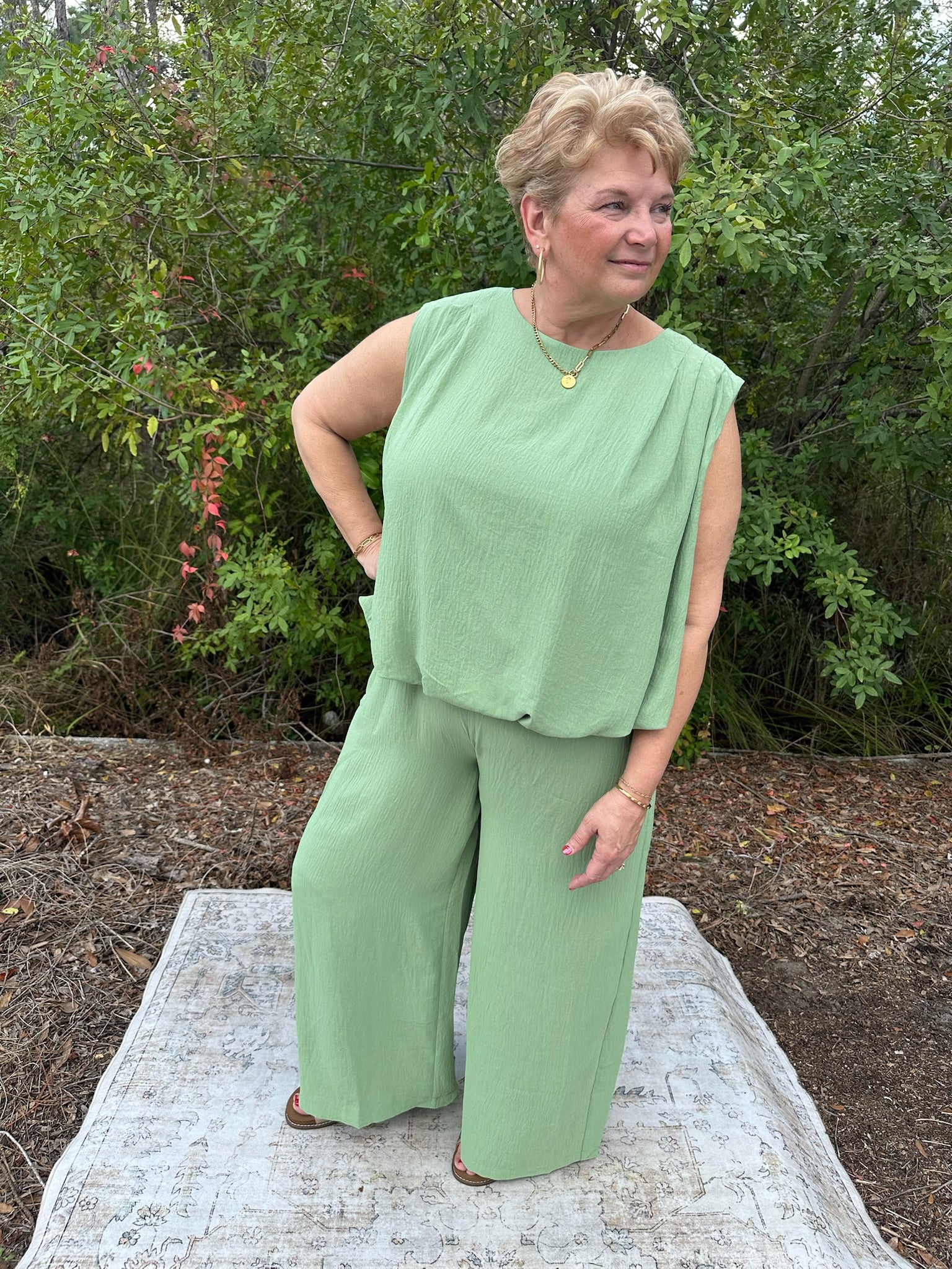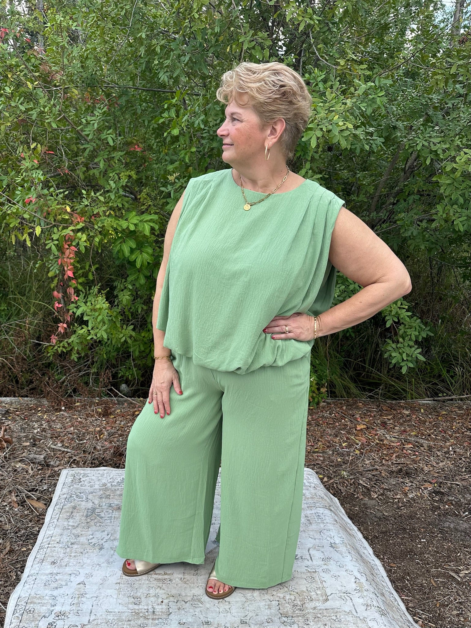 Effortless style meets comfort in this chic two-piece set. The sleek green sleeveless top pairs perfectly with relaxed wide-leg pants for a look that transitions seamlessly from day to night. Lightweight fabric keeps you cool and comfortable, while the minimalist silhouette flatters every frame. Whether you're dressing up for brunch or keeping it casual, this versatile set is your go-to for looking put-together without the fuss.