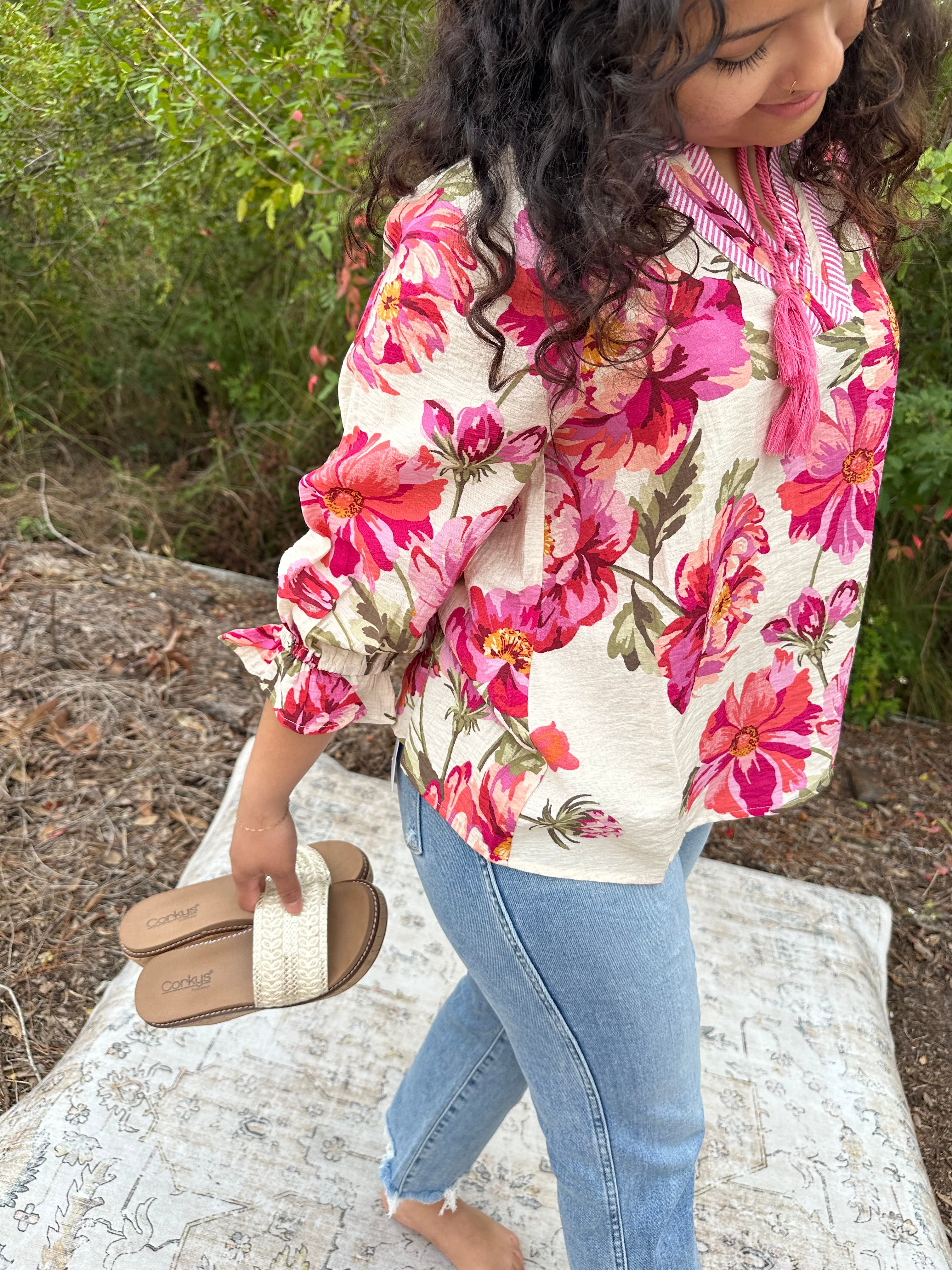 Embrace your romantic side with this charming Oddi floral top that's equal parts sweet and spirited. Delicate pink blooms dance across soft fabric, while bold stripe contrast at the cuffs or hem adds just the right amount of sass. Perfect for date nights, brunch dates, or whenever you want to feel effortlessly feminine with a cheeky twist. Mix it with your favorite denim for an instant vibe upgrade.