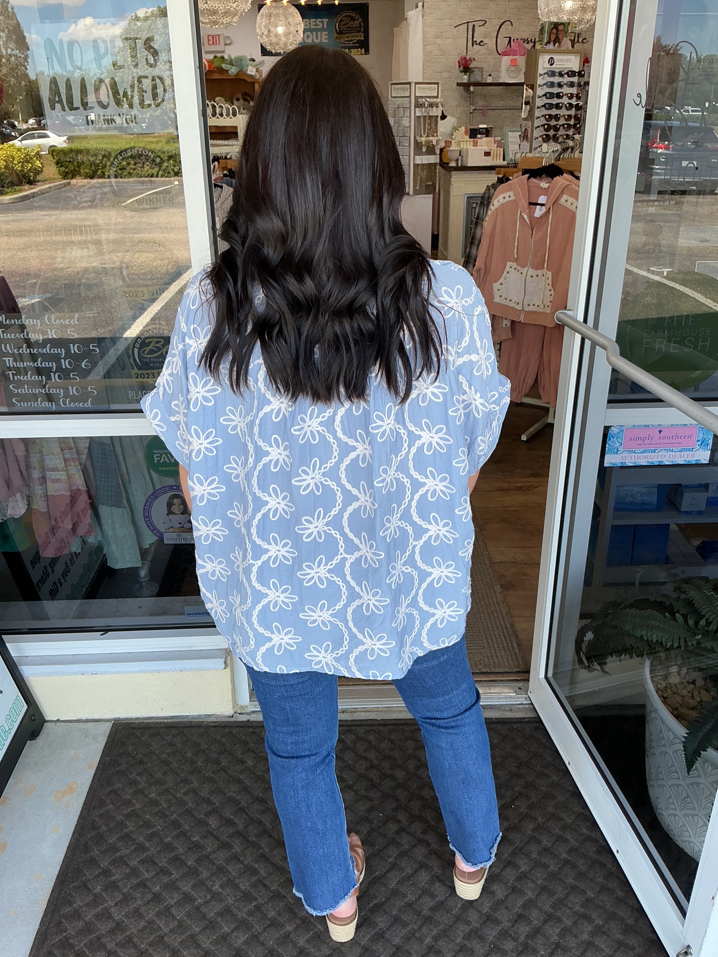 This playful button-down top brings vintage charm to your wardrobe with its soft woven fabric and delicate allover floral embroidery. The relaxed, boxy fit and dolman sleeves make it effortlessly comfy, while the bold contrast placket adds a fun, modern twist. Finished with a sharp collar, it’s the perfect standout piece to brighten up your everyday outfits.