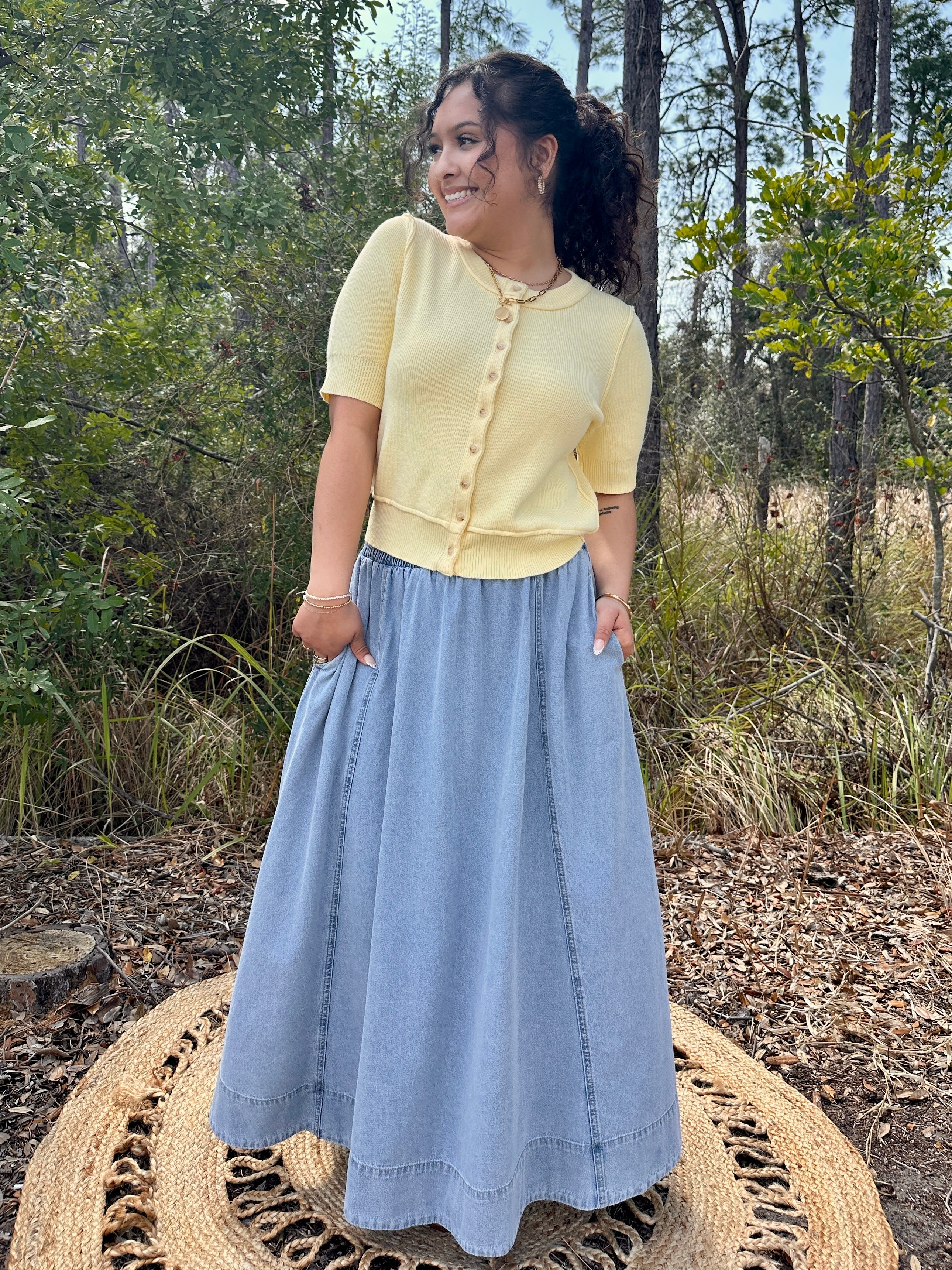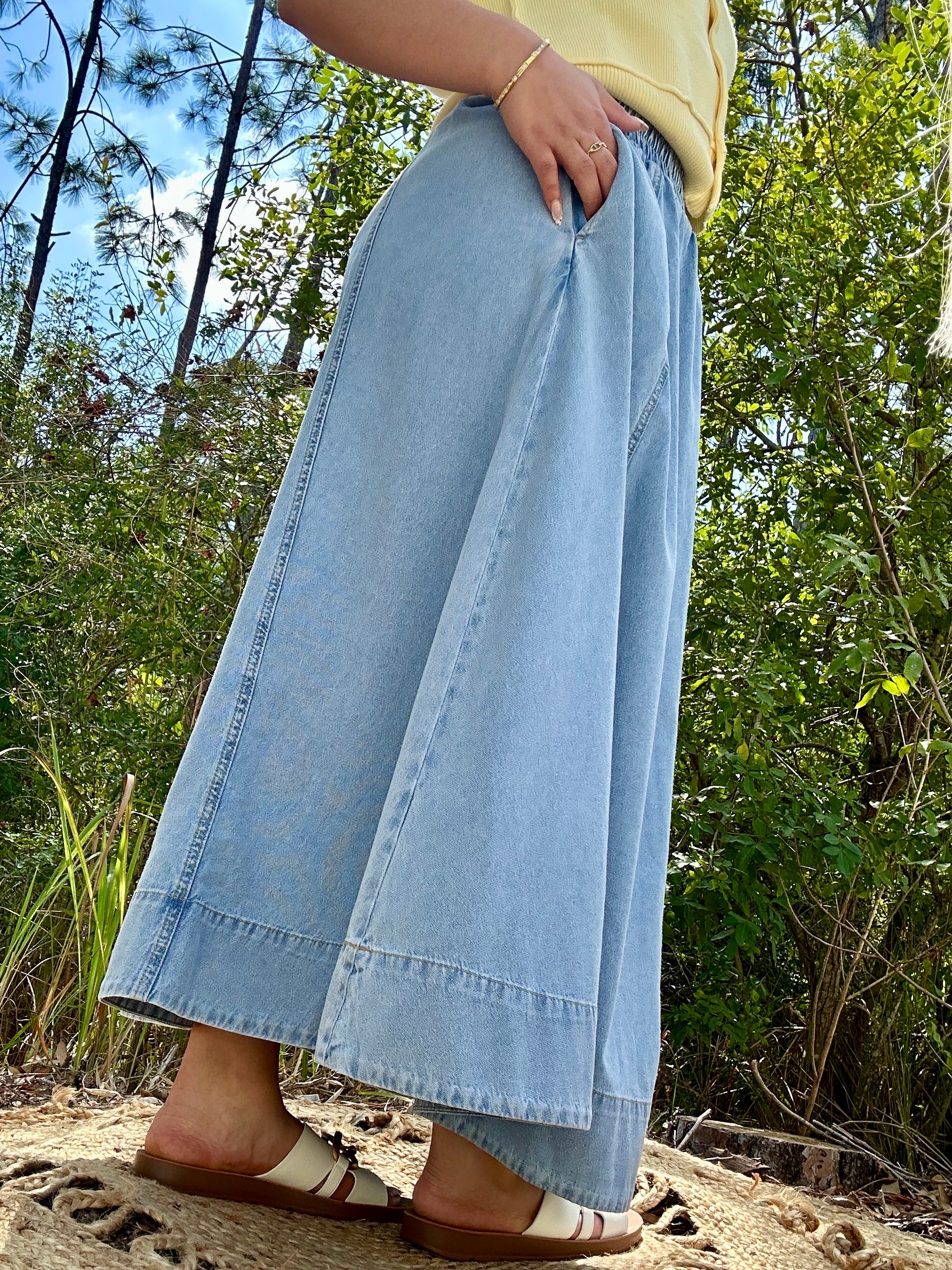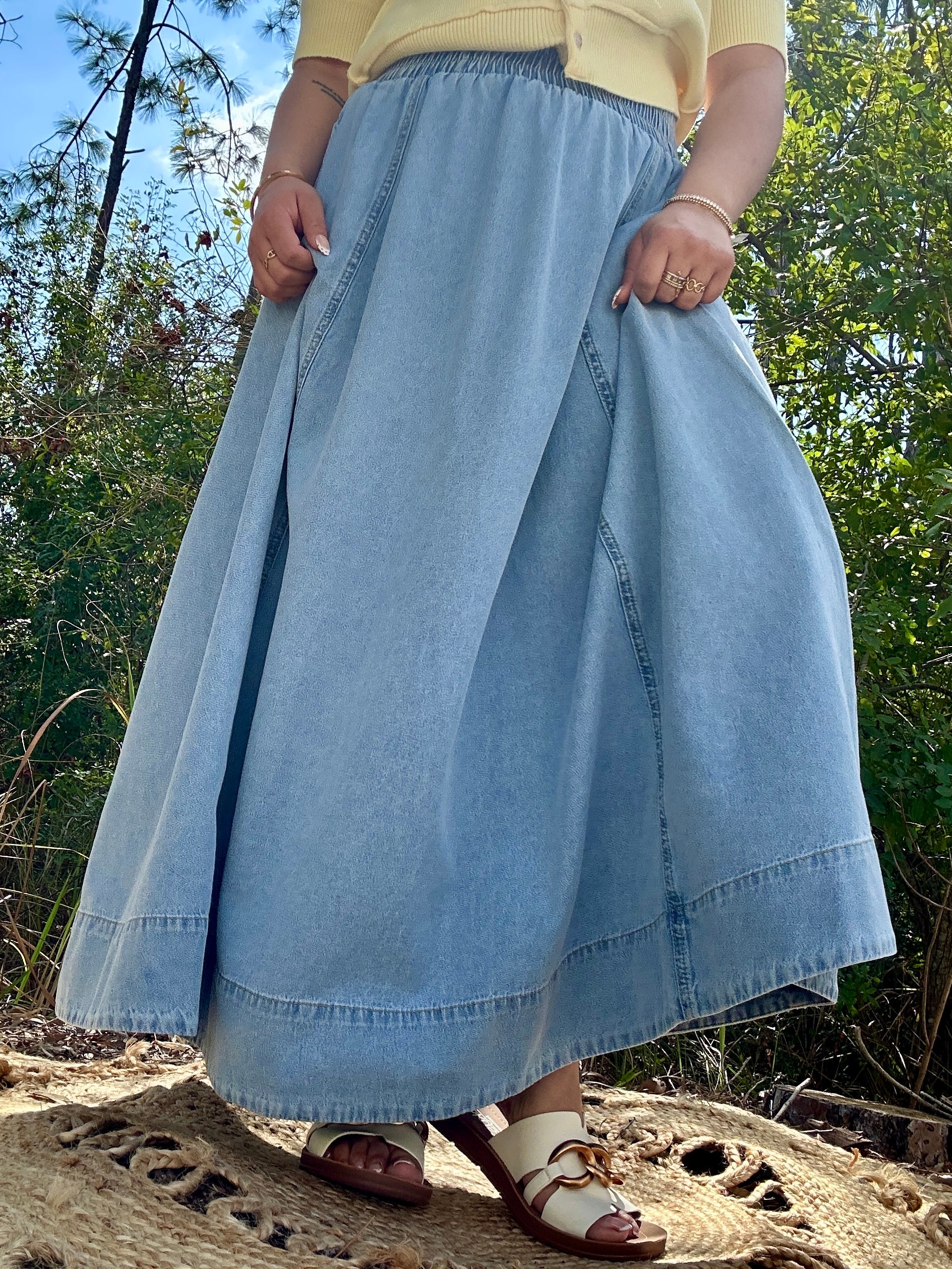 Well, hello there, gorgeous. If you've been searching for that perfect denim skirt that moves with you from morning coffee to a sunset stroll down Main Street — sugar, you just found her. This washed light denim maxi has the kind of easy, flowy silhouette that makes you feel like yourself on your very best day. The elastic waist hugs you in all the right places (no fussing with buttons after brunch, thank you very much), and yes ma'am — she has pockets. Real ones. Pair her with your favorite blouse or a simple tee and you've got an outfit that looks like you tried, even when you didn't have to. Timeless, comfortable, and endlessly flattering — this one's going straight to the front of your closet.