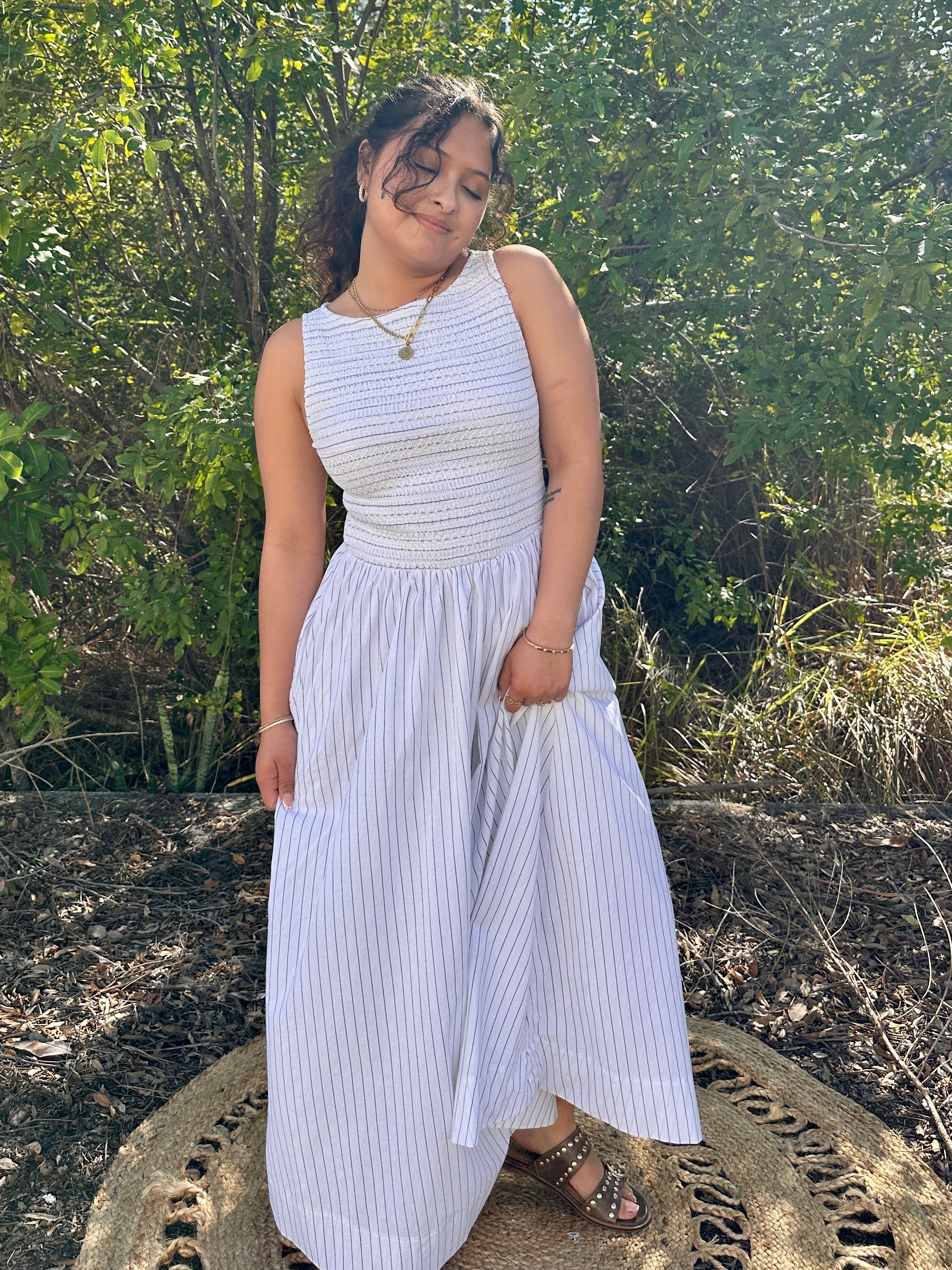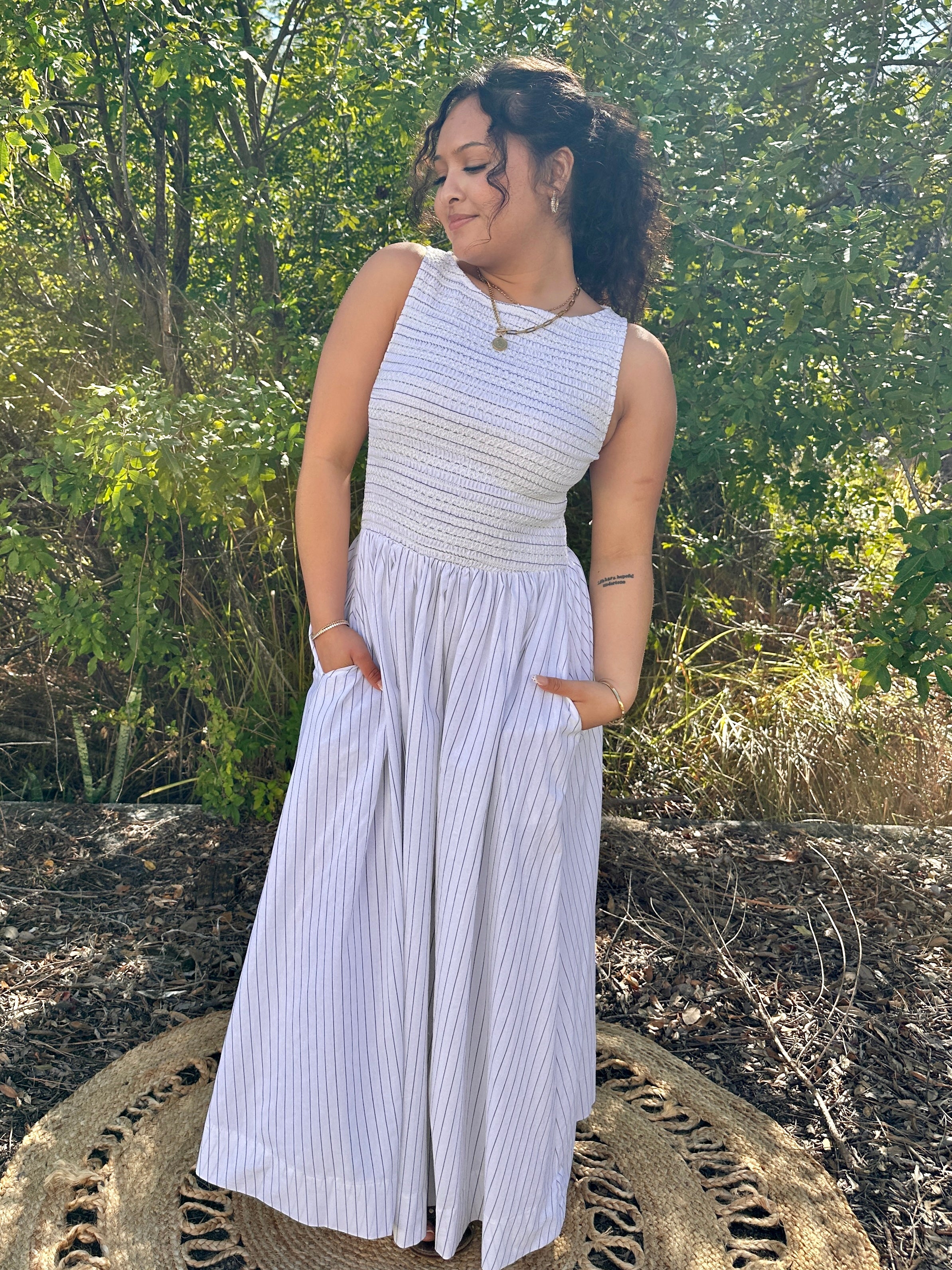 White & Black Pinstripe Smocked Sleeveless Midi Dress