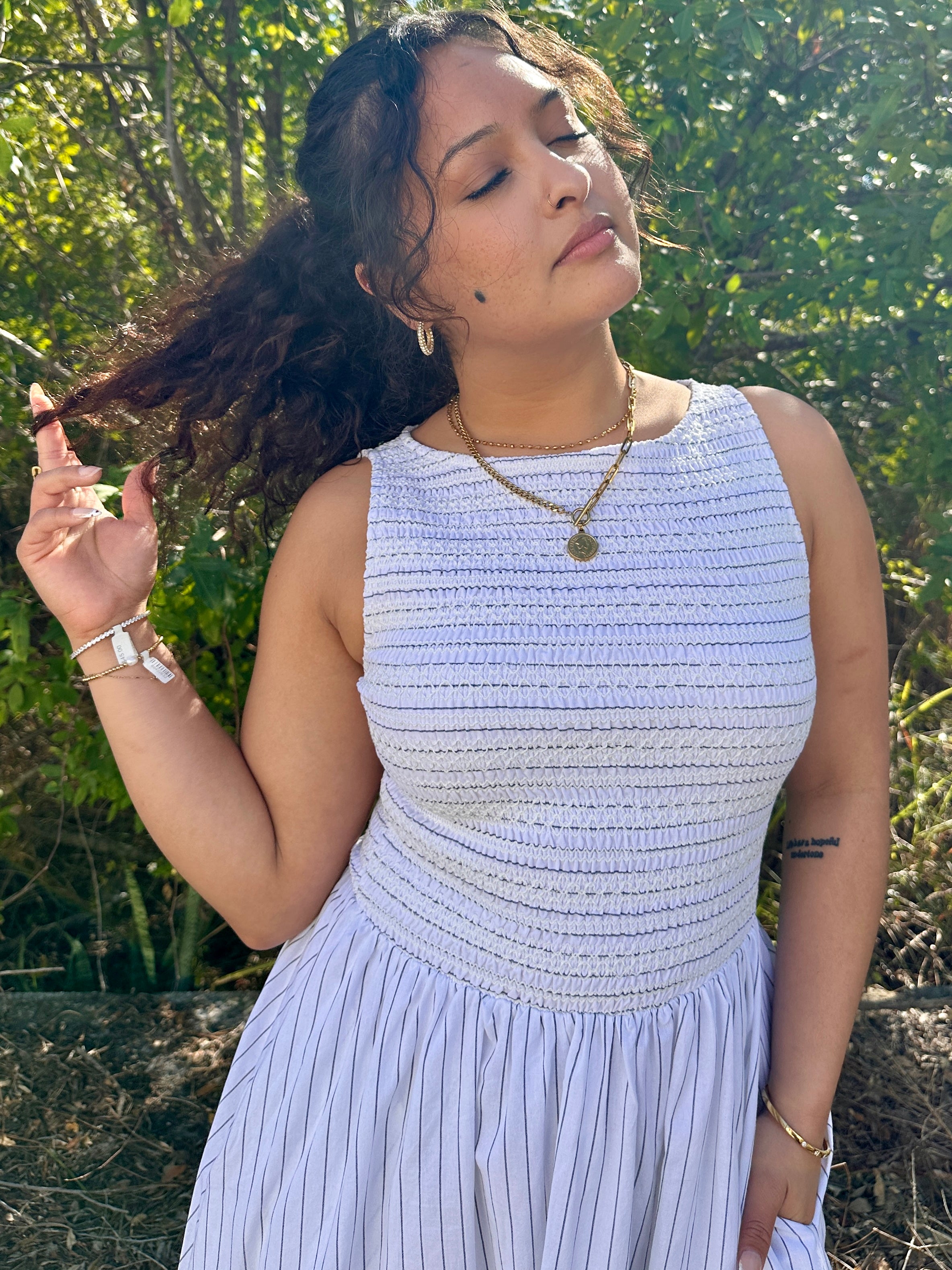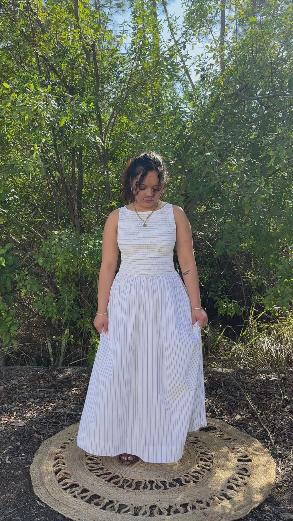 Classic pinstripes with a modern twist — and enough comfort to wear her all day long. This sleeveless midi dress takes that timeless white and black stripe and gives her a fresh, feminine feel with a beautifully smocked bodice that hugs and flatters without a single uncomfortable moment. The midi length is sophisticated and universally flattering, and the sleeveless design keeps you cool when the sun is doing its thing. She's the dress that works just as hard as you do — office meetings, church on Sunday, brunch with the girls, or even a summer wedding with the right accessories. Throw on a denim jacket for casual days or a statement necklace for something elevated. She's a wardrobe workhorse in the prettiest possible way.
