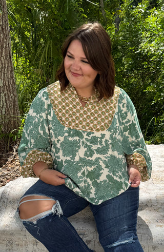 Sew In Love Embroidered Blue Button Top w/ Contrast Placket