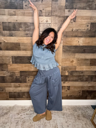 Davi & Dani Ruched BLUE Ruffle Pant & Short Sleeve Top Set