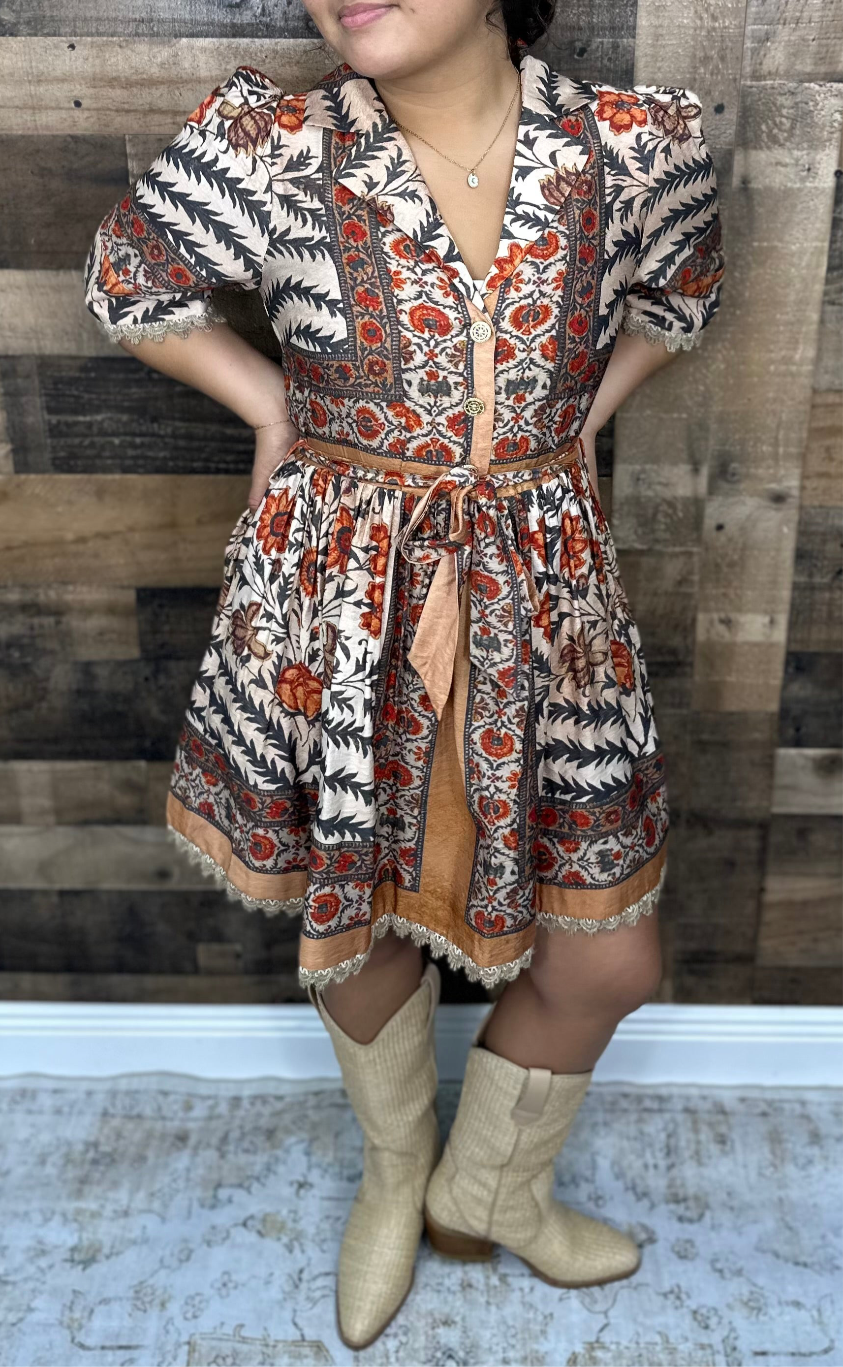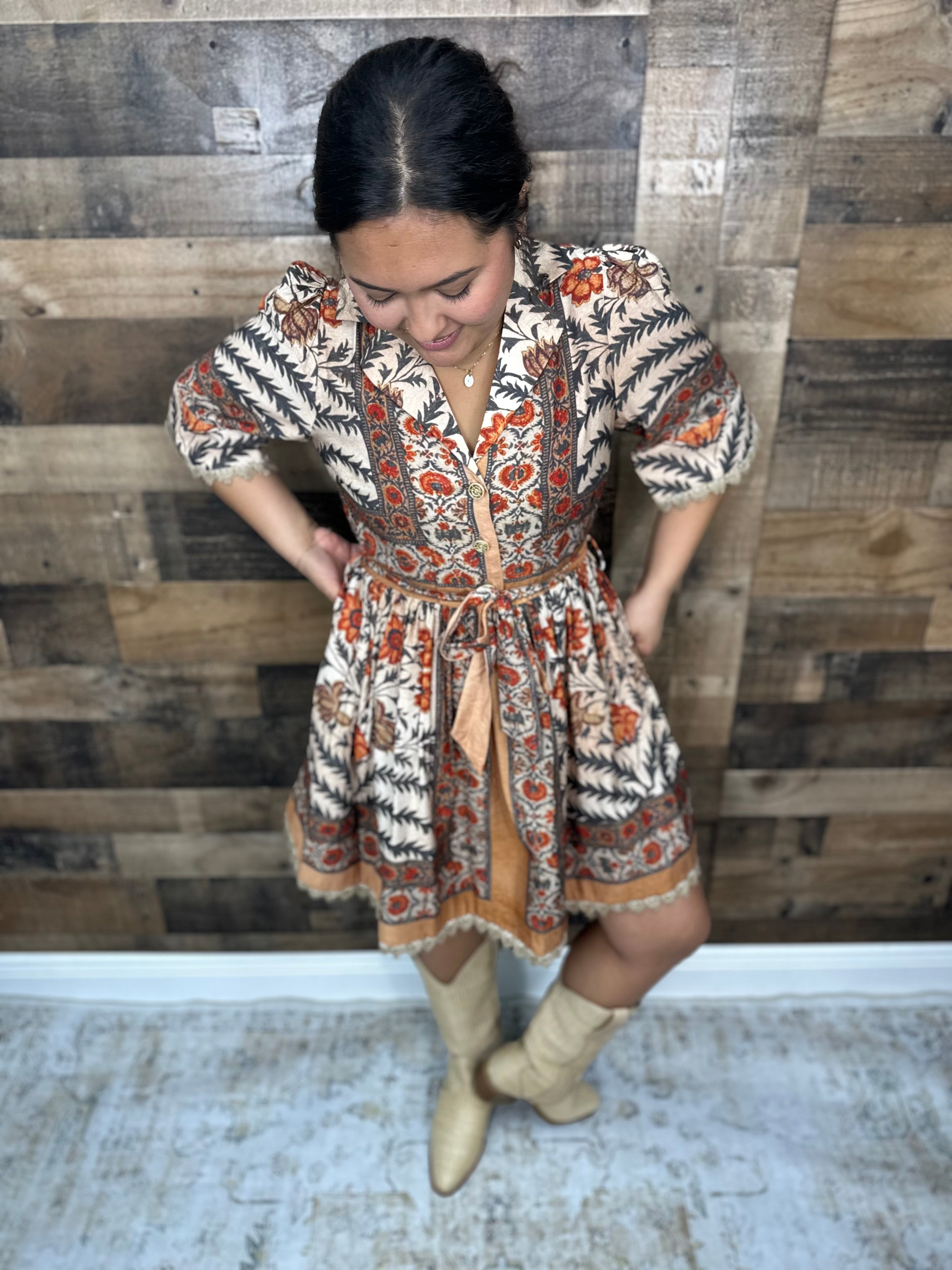 This playful mini dress features a charming charcoal and rust botanical print with short puff sleeves and delicate lace trims at the sleeves and hem. The button-front closure and elasticated back waist offer a flattering fit. Complete with handy side pockets, this dress perfectly combines style and function for your next Fall  adventure.