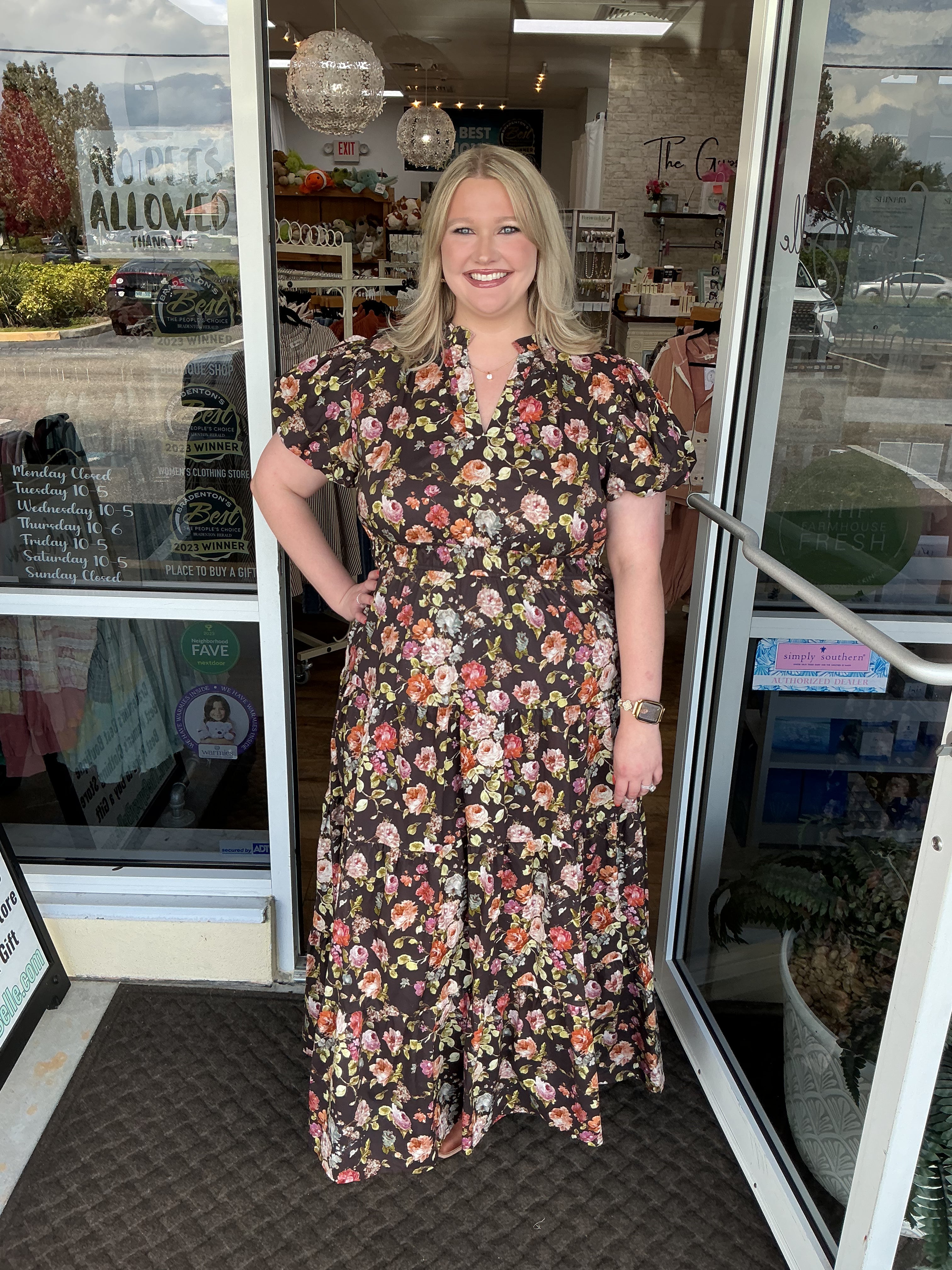 The Entro Dk Brown Floral Tiered Midi Dress is a playful and feminine choice for any occasion. Featuring short bubble puff sleeves and a flattering double elasticated waist, this pullover dress offers both comfort and style. Its tiered midi length paired with a charming floral print adds a fun, flirty vibe perfect for fall days or casual outings.