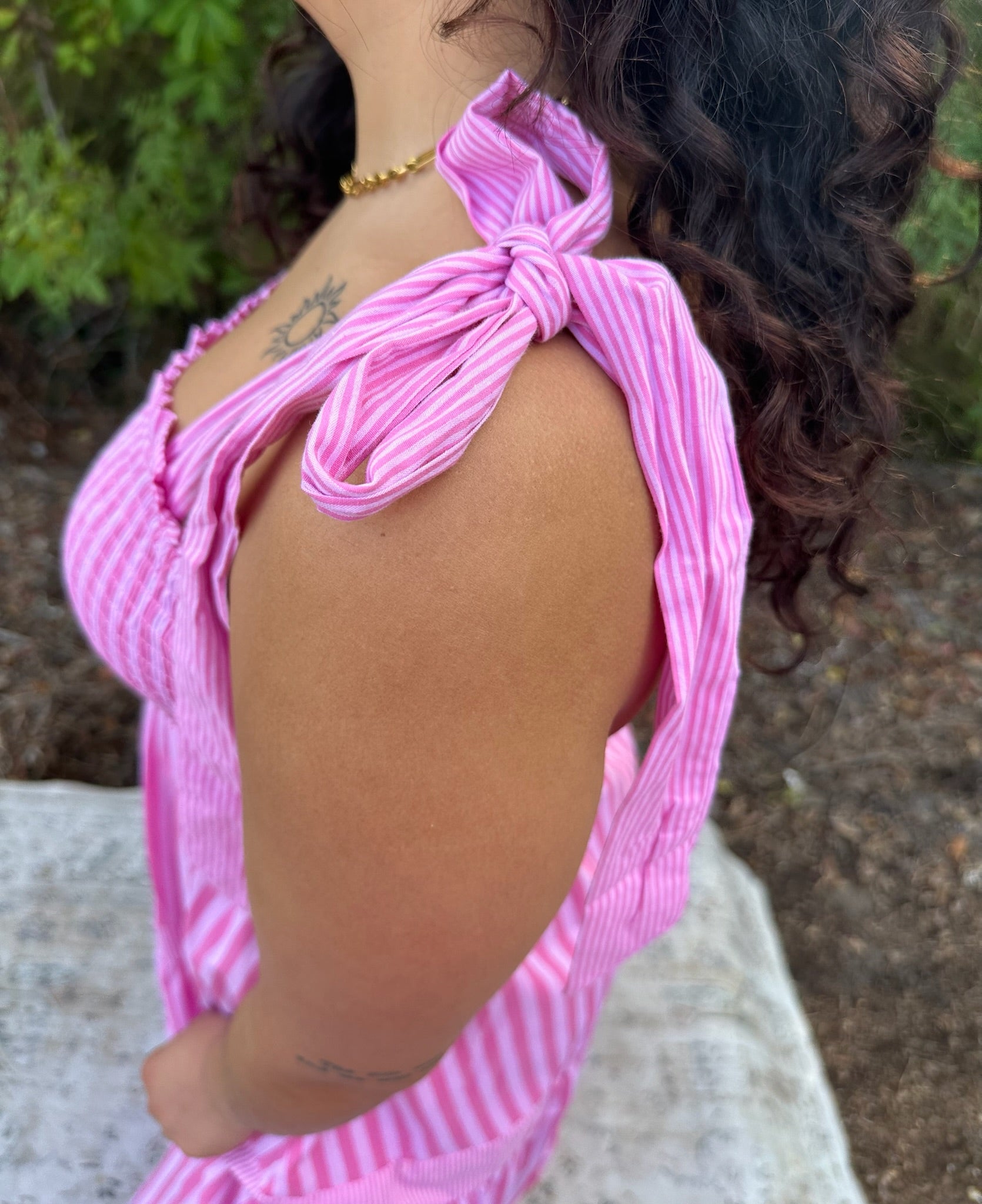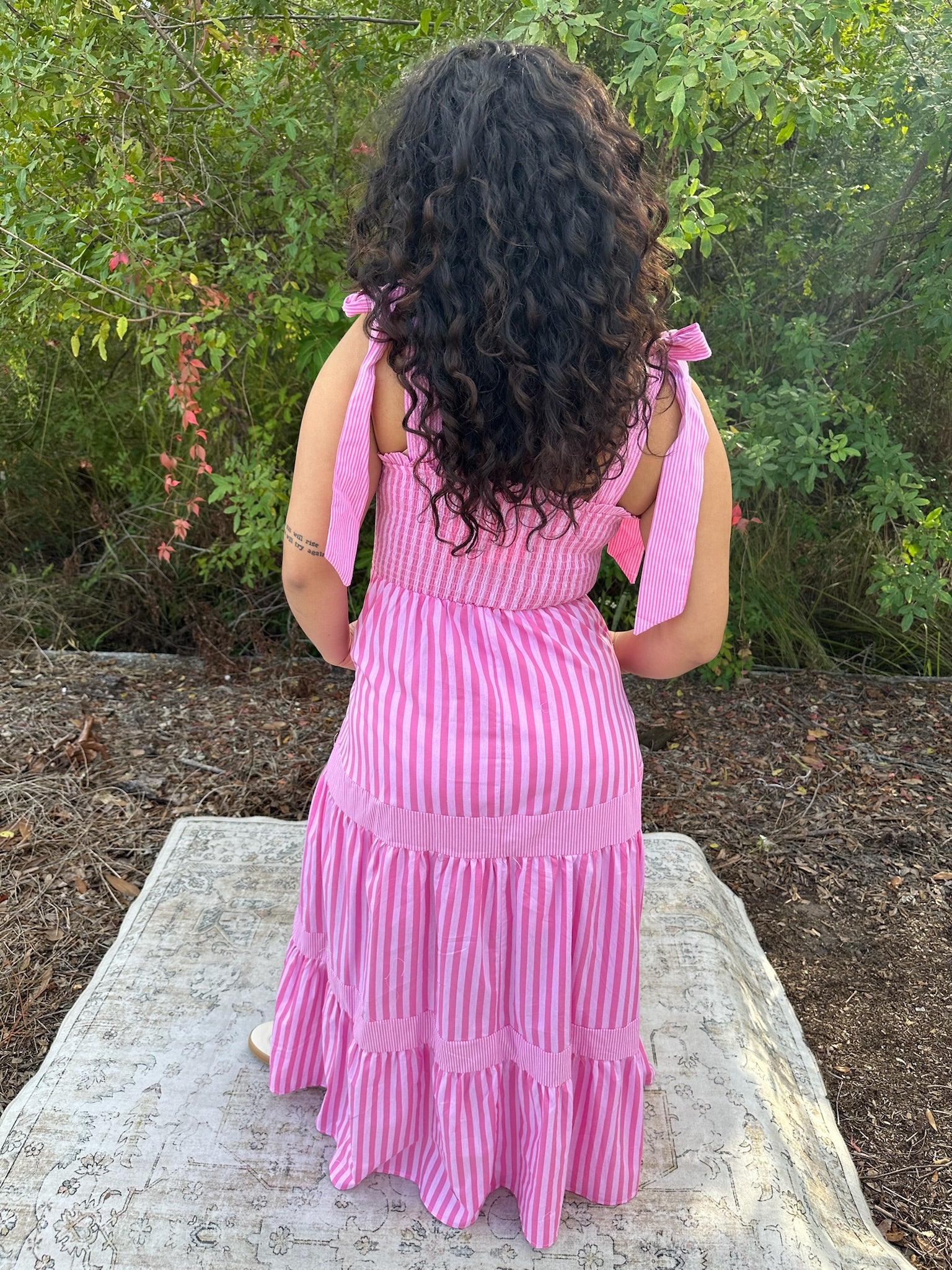 Slip into effortless Florida vibes with this charming maxi dress featuring a playful mix of pink stripes. The tie-shoulder detail adds a flirty touch that's perfect for casual outings or breezy evenings. Flowing fabric keeps you cool and comfortable while the maxi length offers versatile styling—dress it up with sandals for a beach day or pair with sneakers for laid-back weekend adventures. A wardrobe essential that brings color and personality to your everyday rotation.