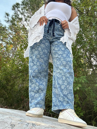 Peach Love Gypsy Fit Pink & Blue Floral Patchwork Printed Twill Denim Barrel Pants