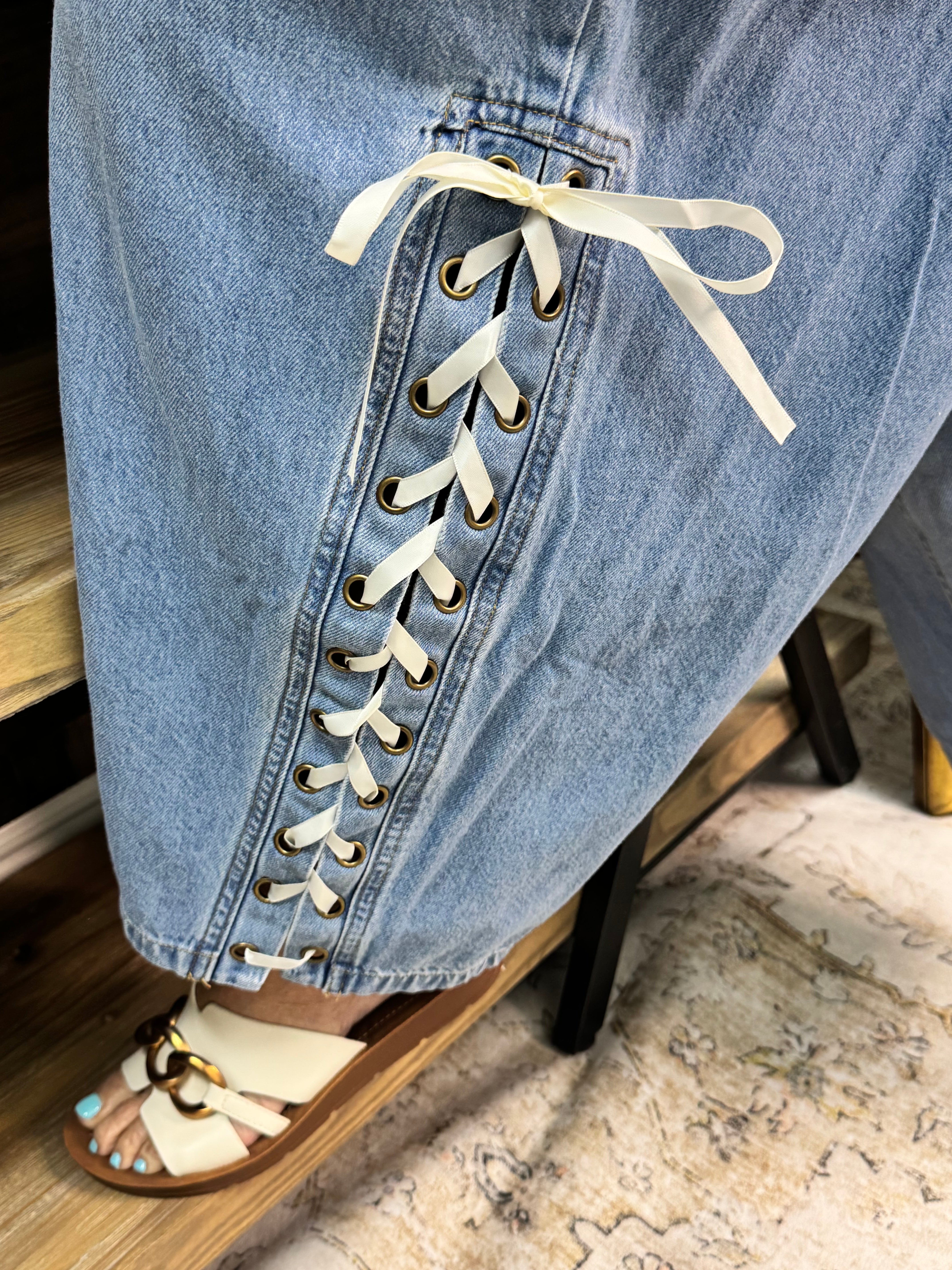 Up your style game with our Side Slit Lace Up Denim Gypsy Fit Jeans! These barrel leg jeans feature a unique lace-up design and convenient side slits. Perfect for adding a touch of edgy flair to any outfit. Get ready to slay in these trendy jeans