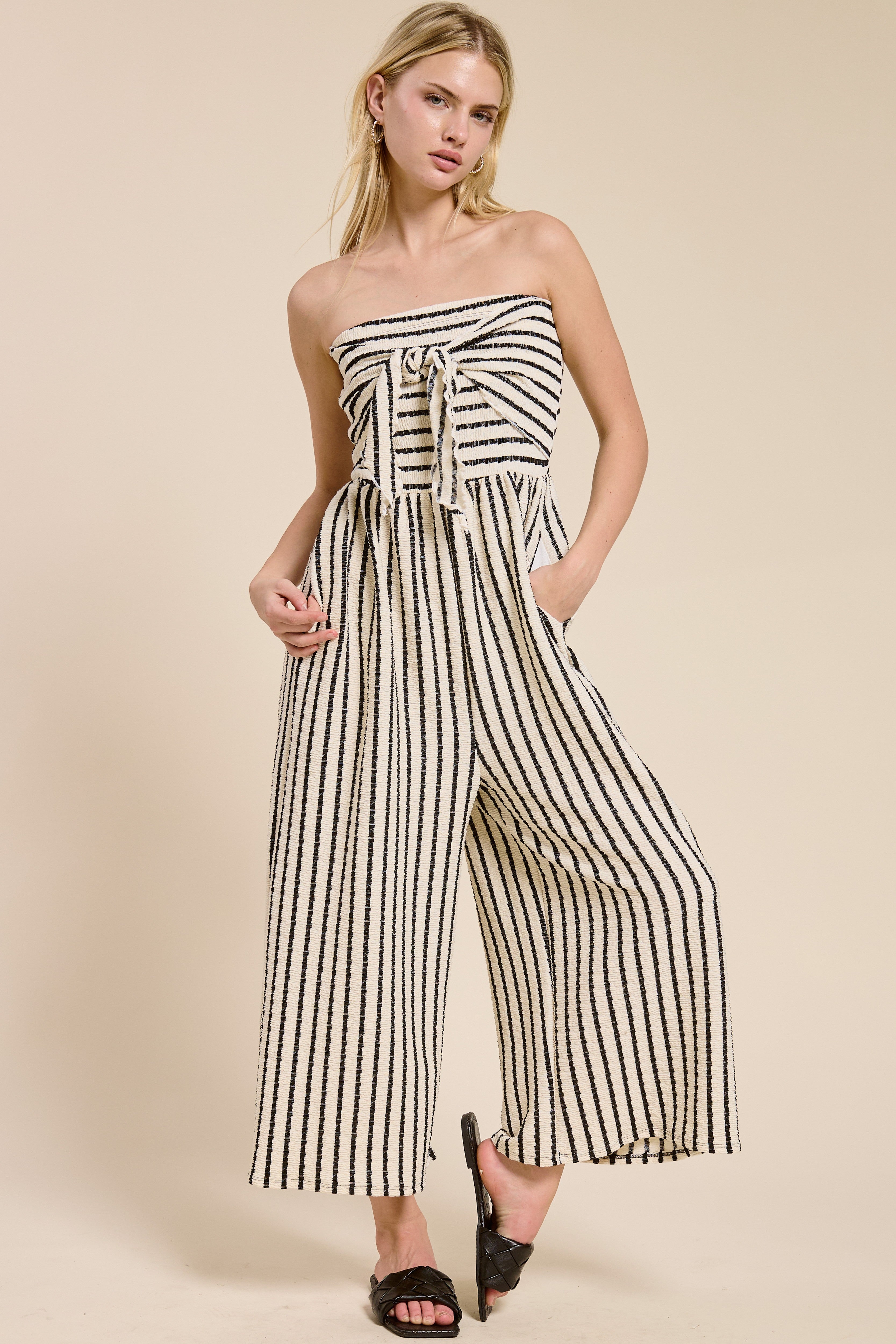 Oh honey, talk about a showstopper! The Black & Ivory Stripe Strapless Jumpsuit is servin' up all the chic, put-together vibes with zero effort. Those bold black and ivory stripes paired with the adorable tie-front bow detail at the bust? Absolutely darlin'. The strapless neckline keeps things flirty and fun, while the wide-leg silhouette gives you that breezy, flowy feel that's perfect for warm weather. Whether you're headed to a rooftop dinner, a girls' night out, or a summer wedding, this jumpsuit is the one-and-done outfit that'll have everyone askin' where you got it. Just add heels or wedges and go, gorgeous!