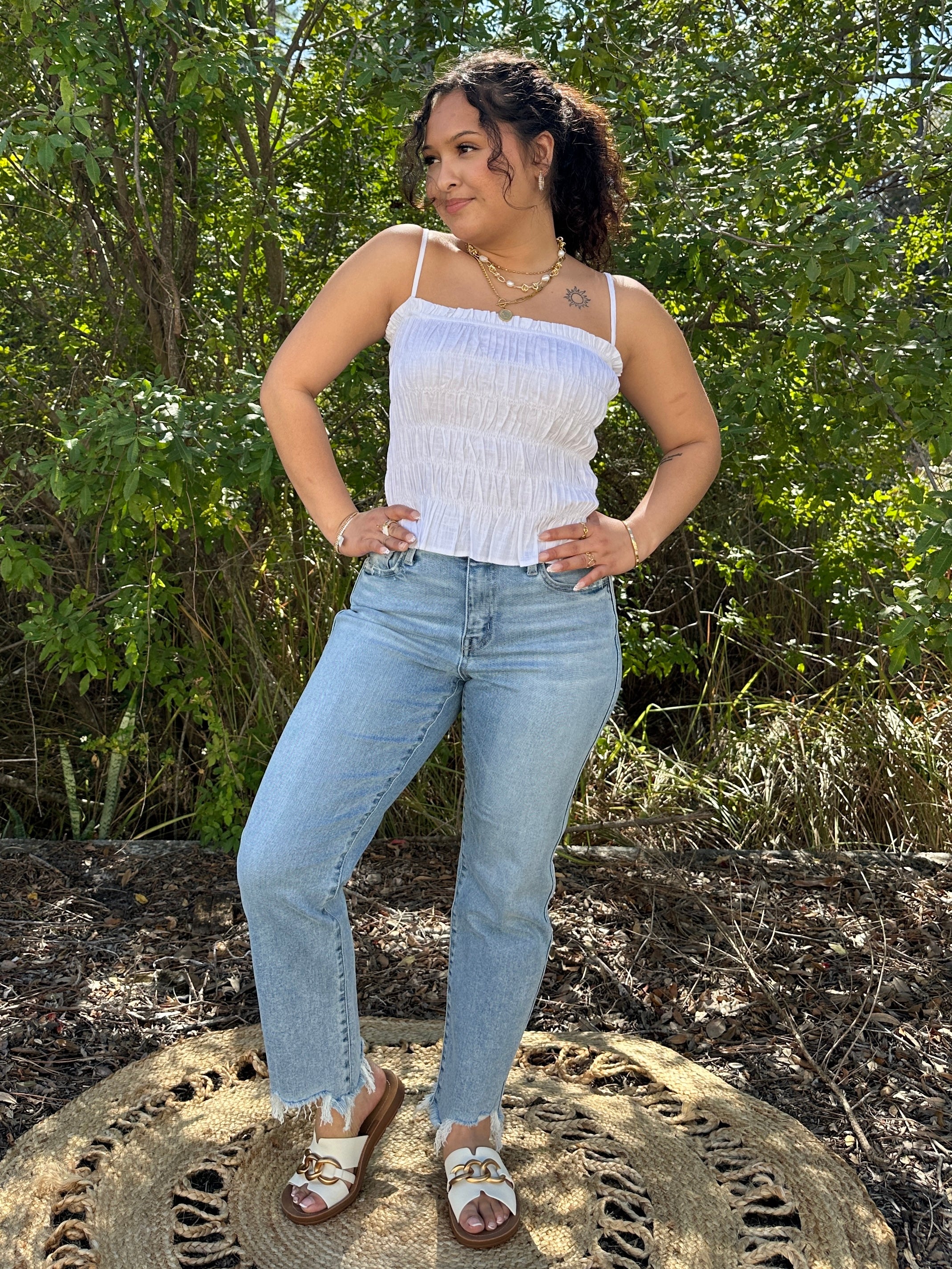 The top that goes with everything — and we truly mean everything. This White Linen Blend Wide Smocked Layering Top has a wide, relaxed fit with beautiful smocked detailing that gives her shape without squeezing. The linen blend fabric keeps things light and breathable, and the clean white color is the ultimate blank canvas for all your favorite accessories and bottoms. Wear her with printed pants for a statement look, pair her with denim for classic ease, or tuck her into a skirt when you want something a little more polished. She's the kind of top that quietly holds your whole outfit together — the unsung hero of your wardrobe. Grab her now and you'll wonder how you ever got dressed without her.
