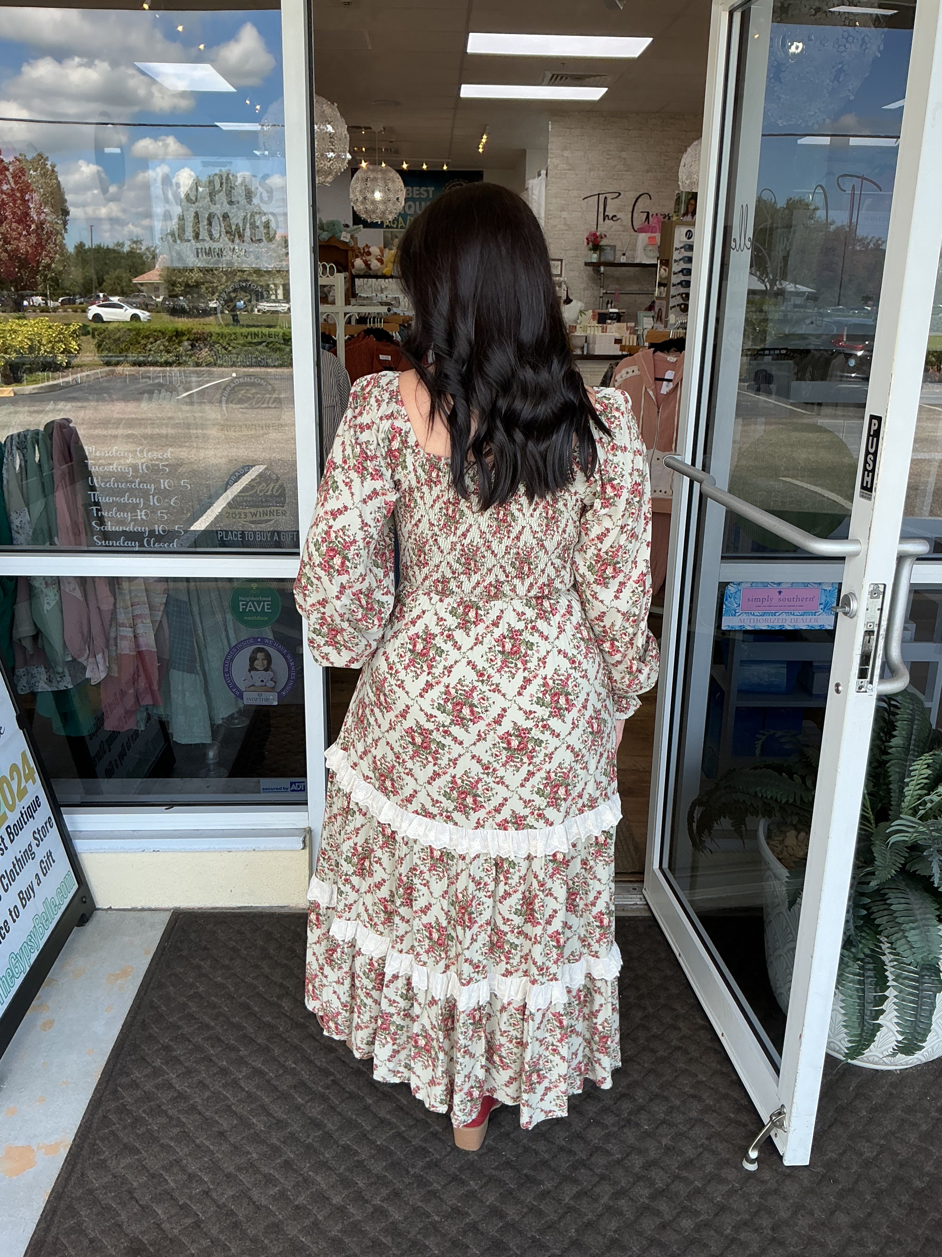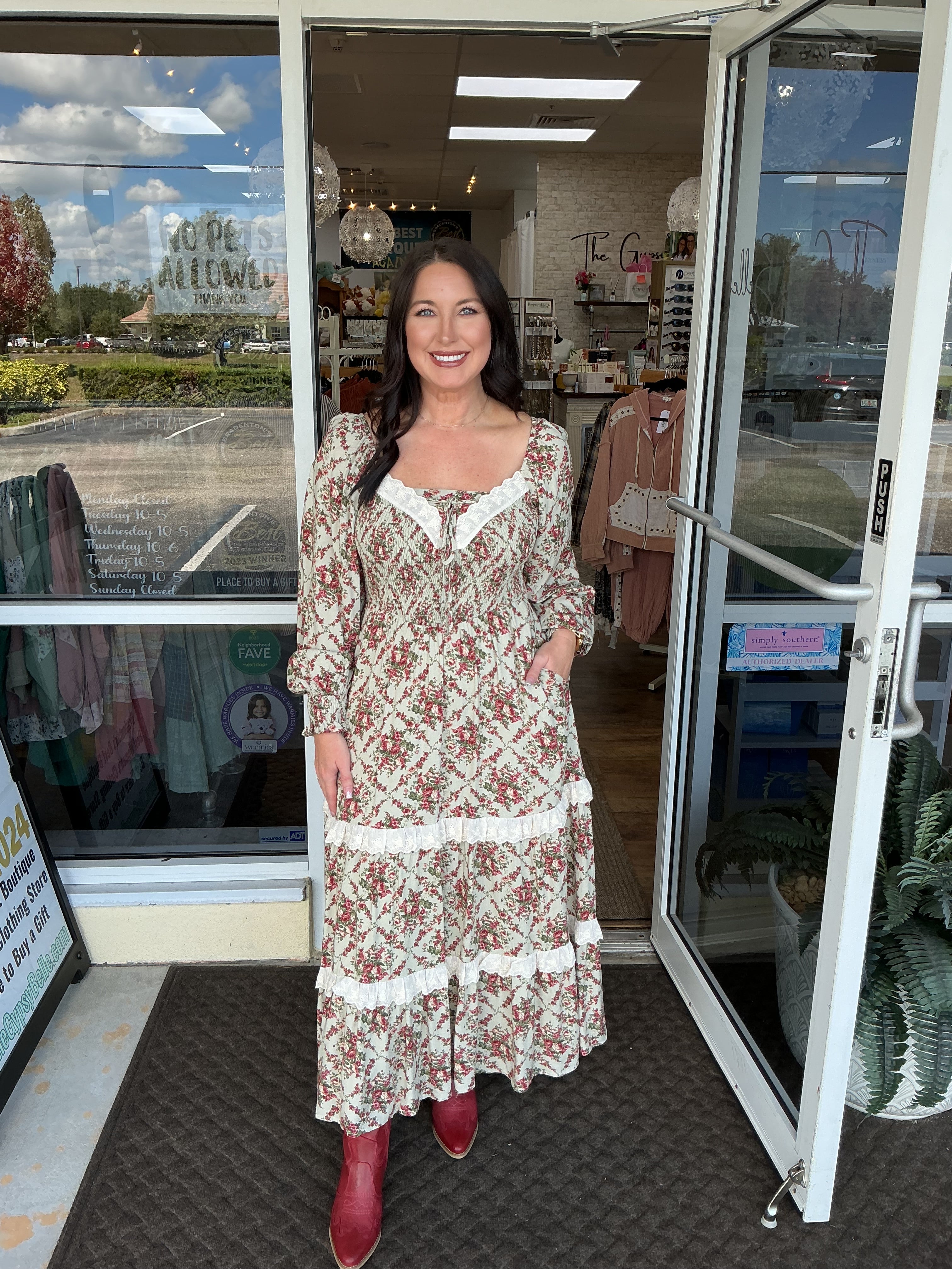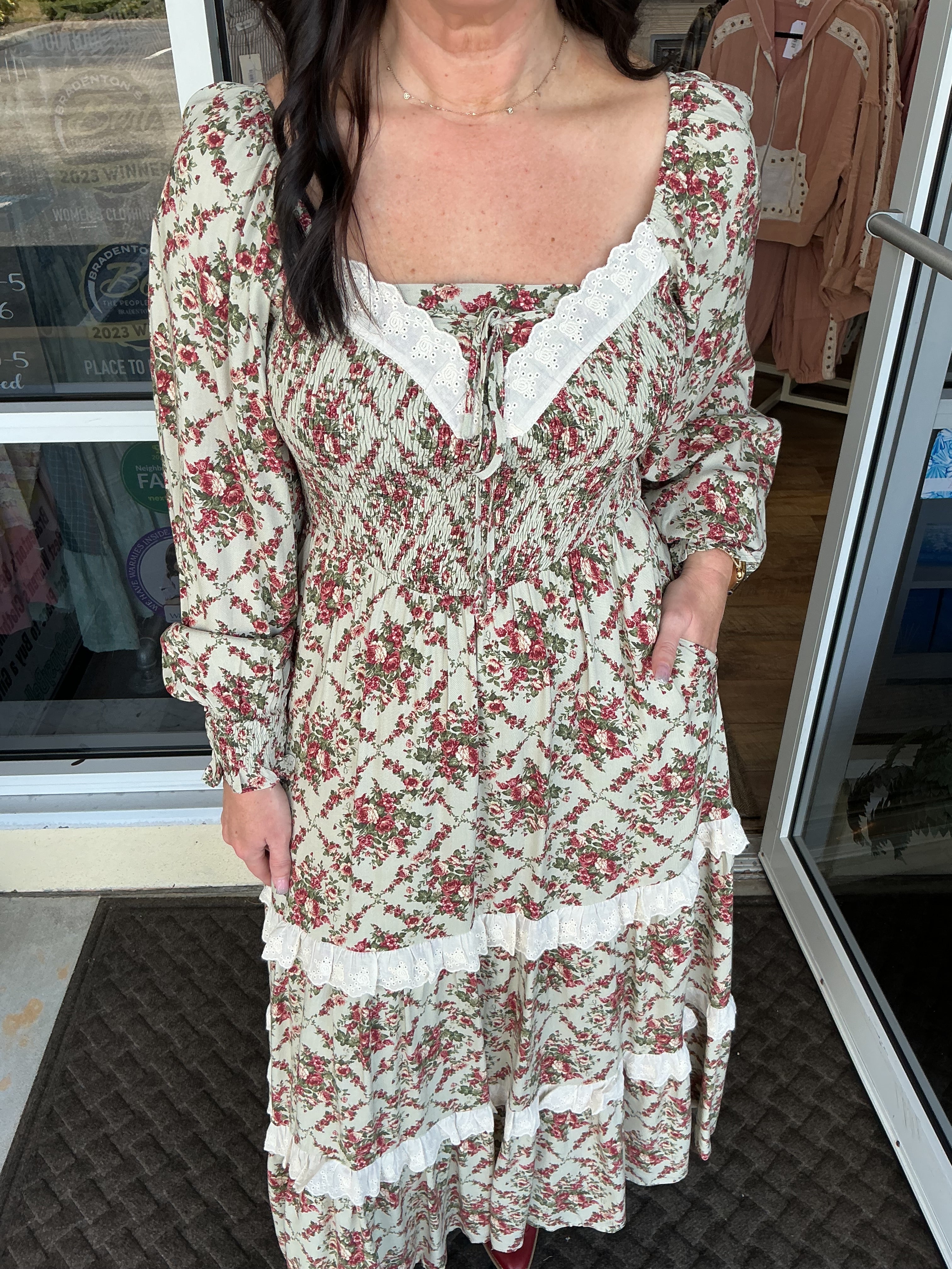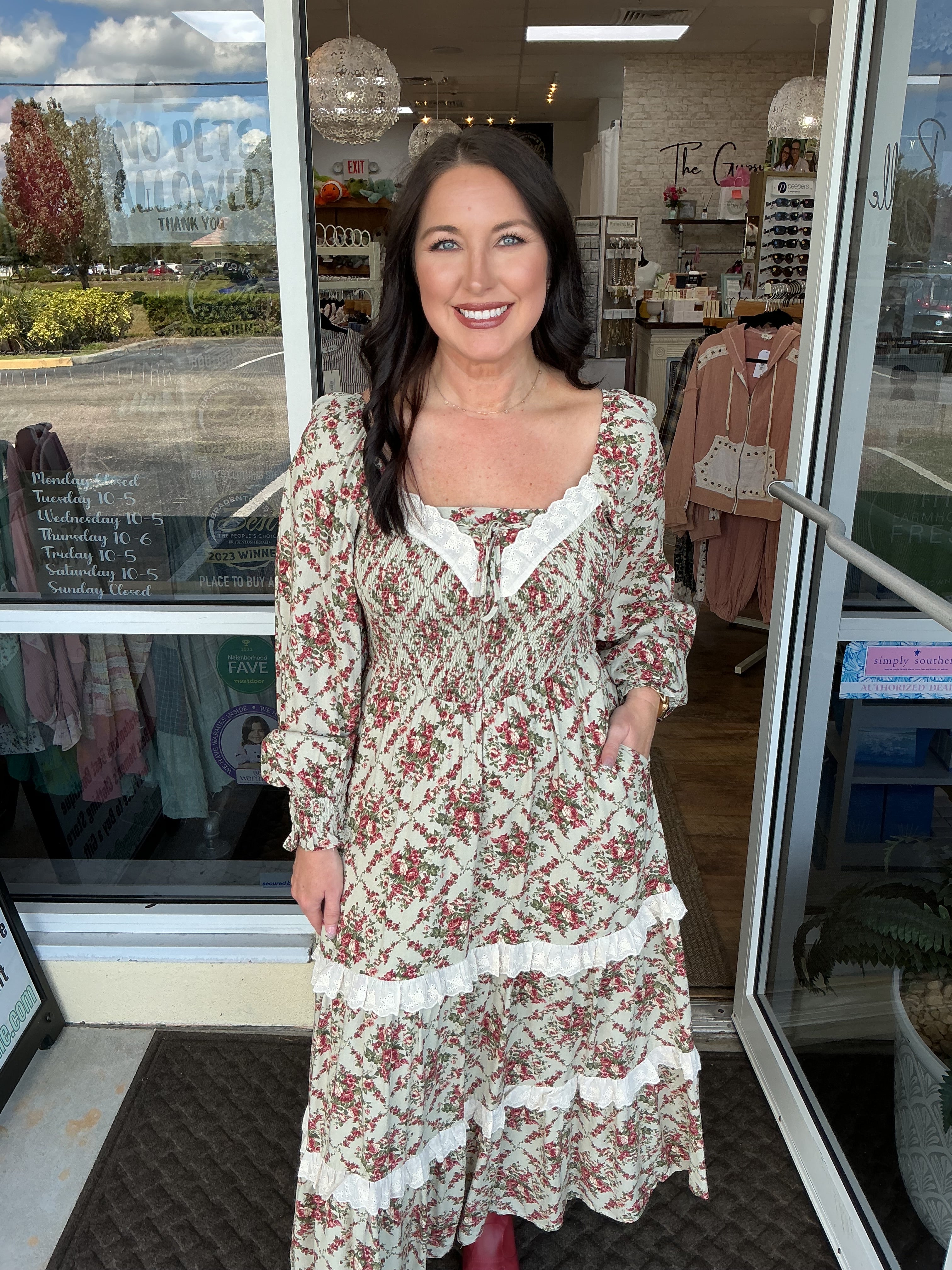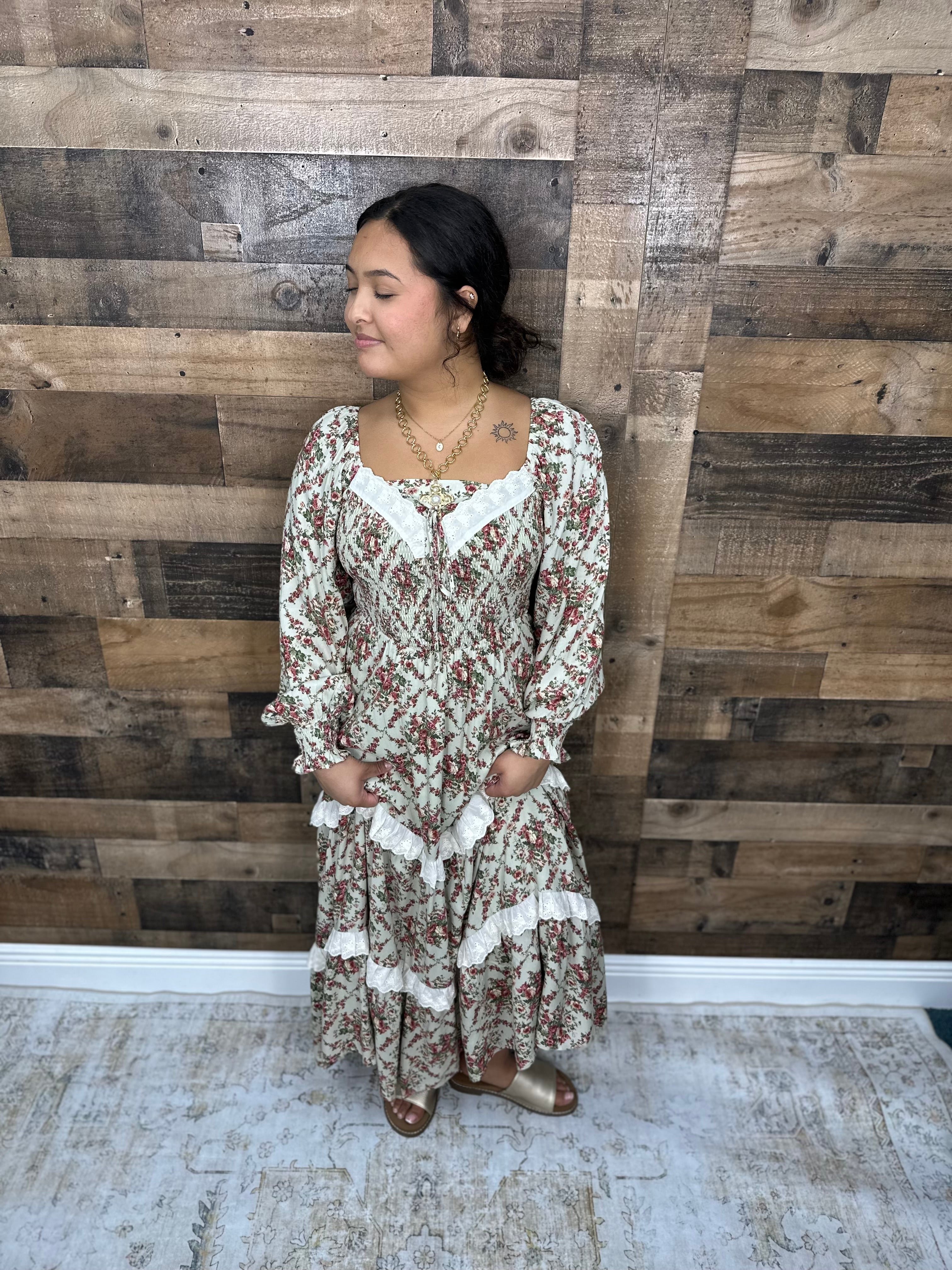 Float into romance with the Forte Lt Sage Victorian Floral Maxi Dress. Its lightweight woven fabric feels soft and breezy, lined for extra comfort. The smocked bodice hugs your curves in all the right places, while delicate eyelet lace trims add a charming, vintage flair. Long puff sleeves with elastic cuffs bring playful volume, and the tiered maxi skirt sways gracefully as you move. Perfect for Fall!