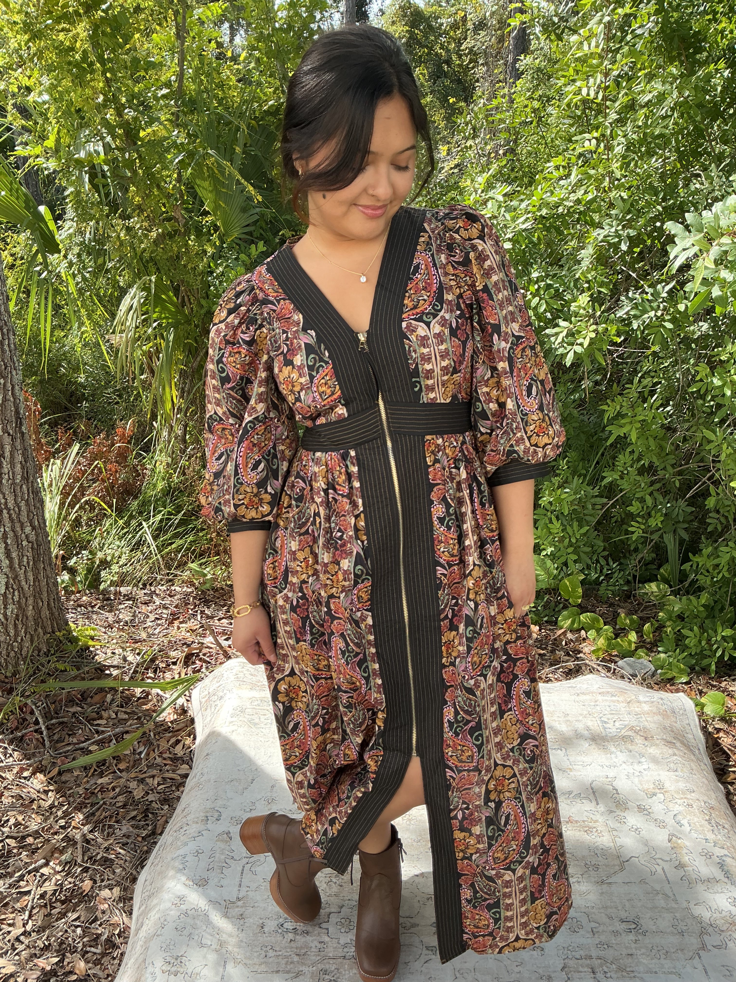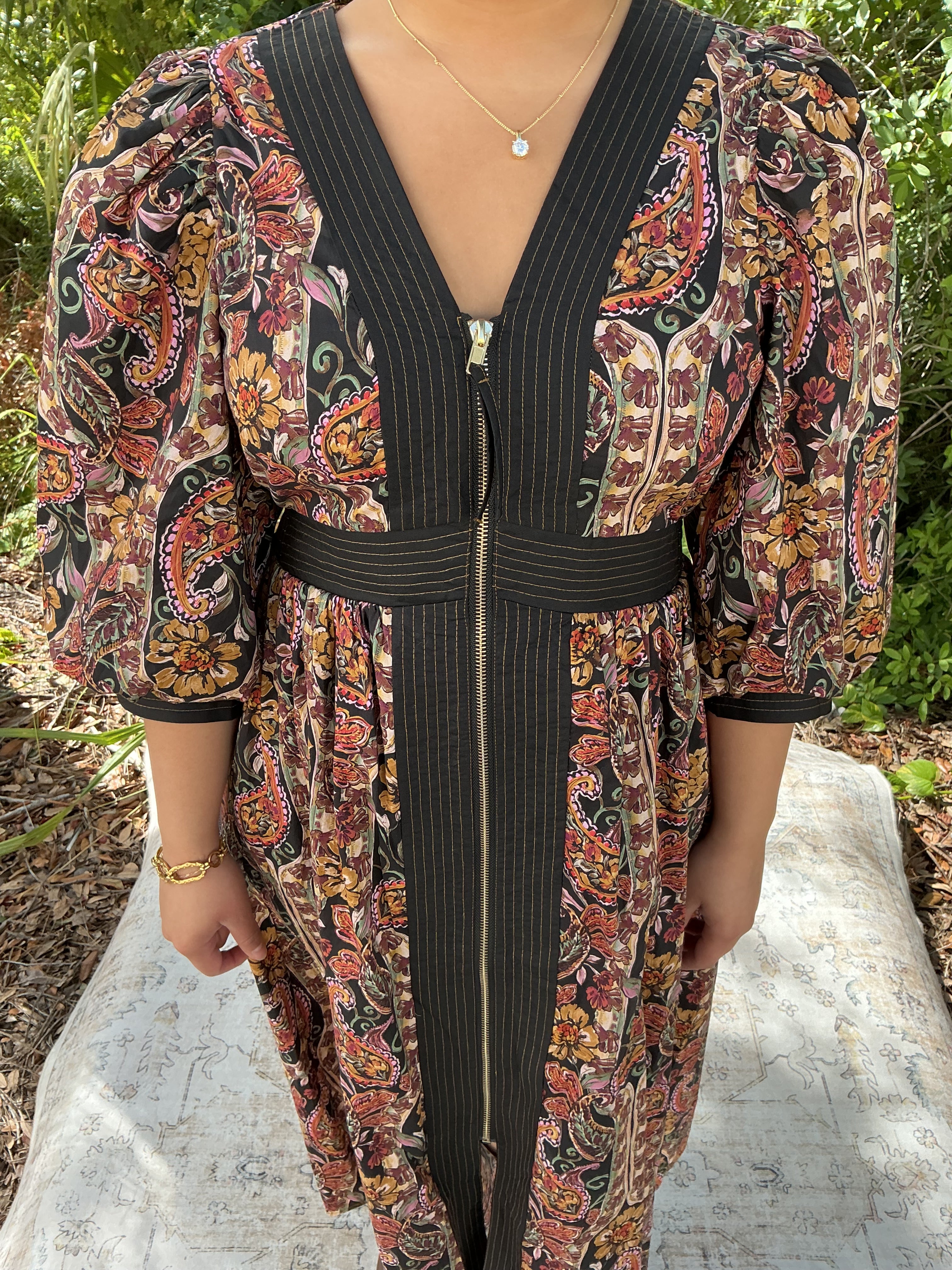 Entro Black & Jewel Tone Paisley Zip Front Midi Dress