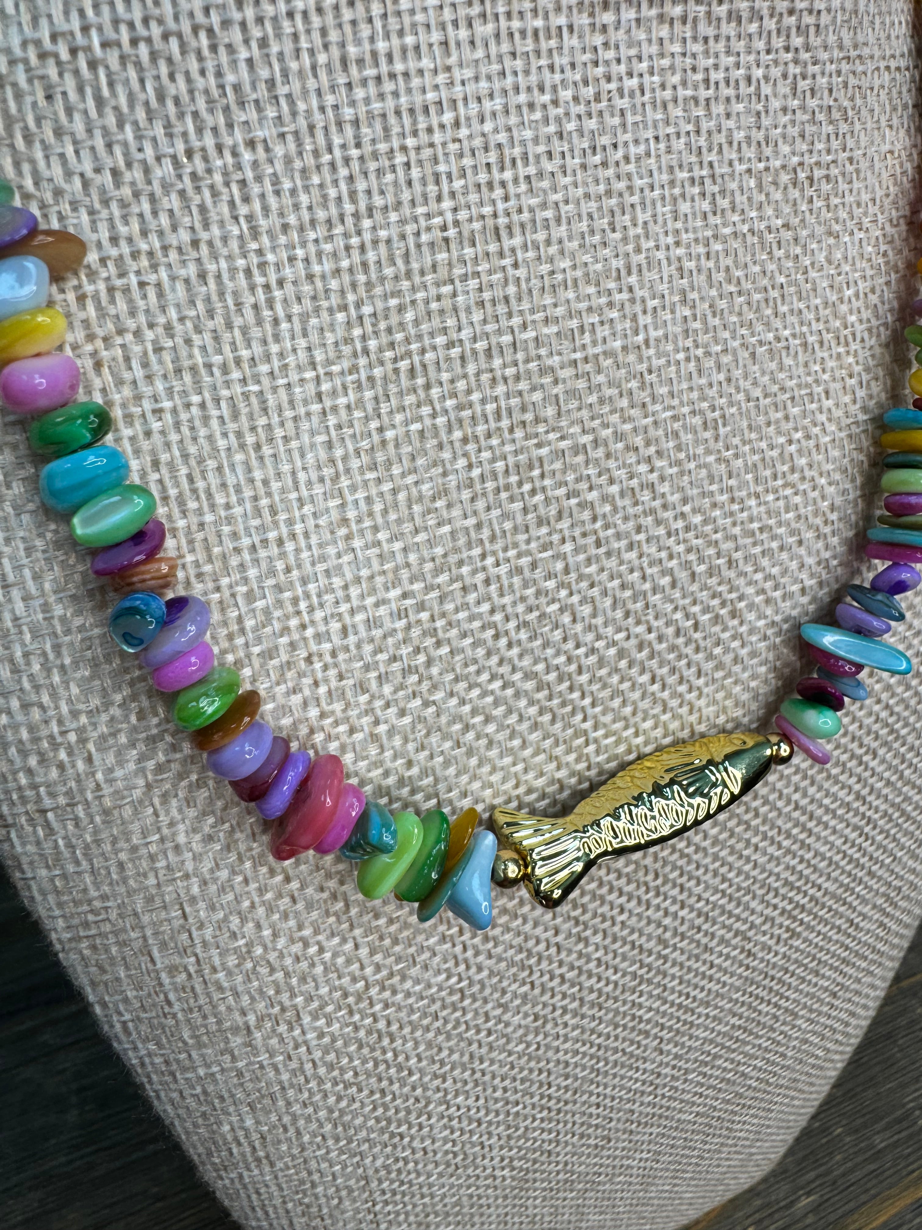 • Dive into whimsy with this charming Ocean of Color Fish Necklace. Featuring a delicate gold-tone fish centerpiece surrounded by cheerful pastel beads, this playful piece brings coastal vibes to any outfit. The adjustable 17" length with a 2" extender ensures the perfect fit for layering or wearing solo. A fun accessory that celebrates color and personality.