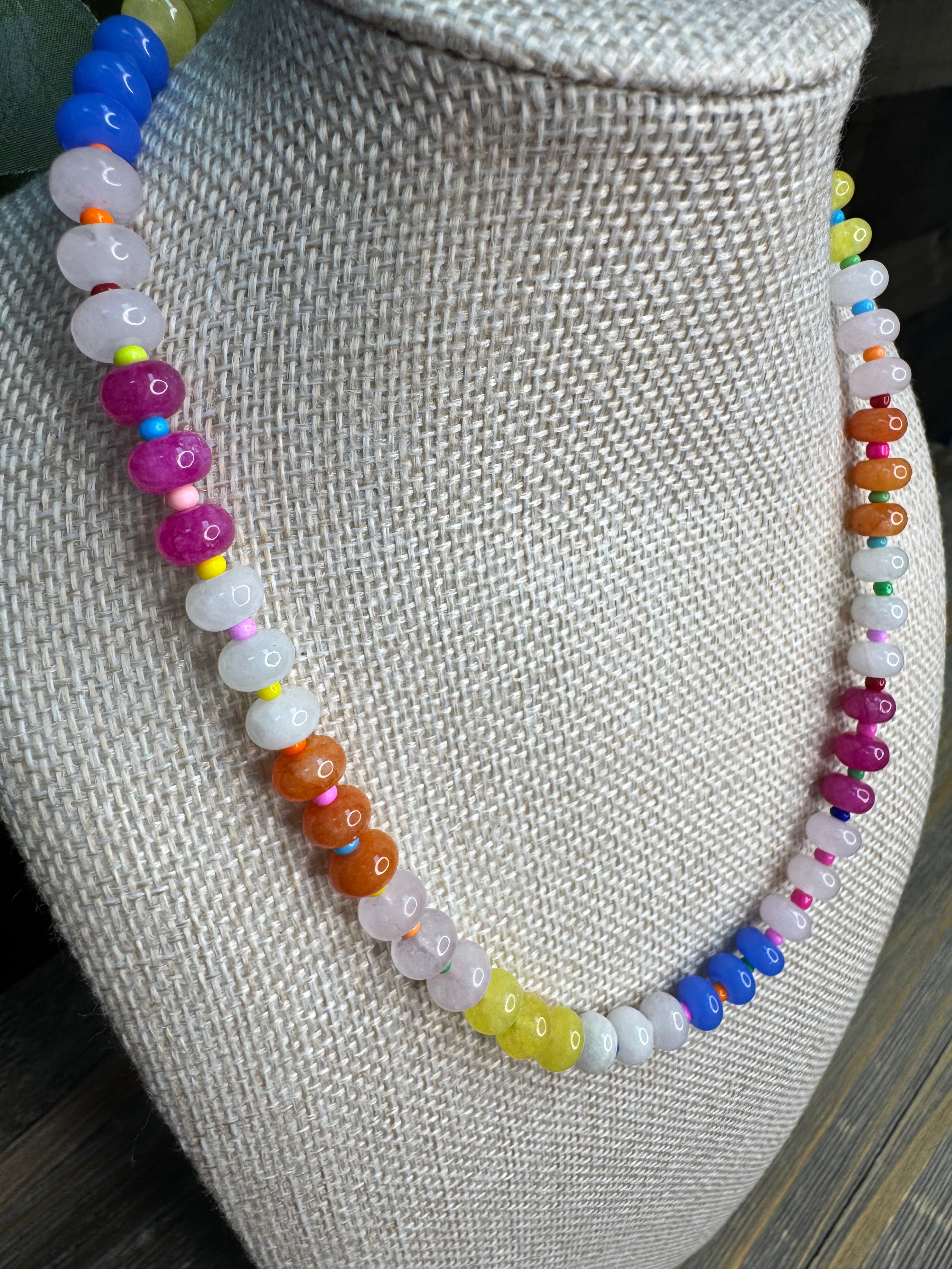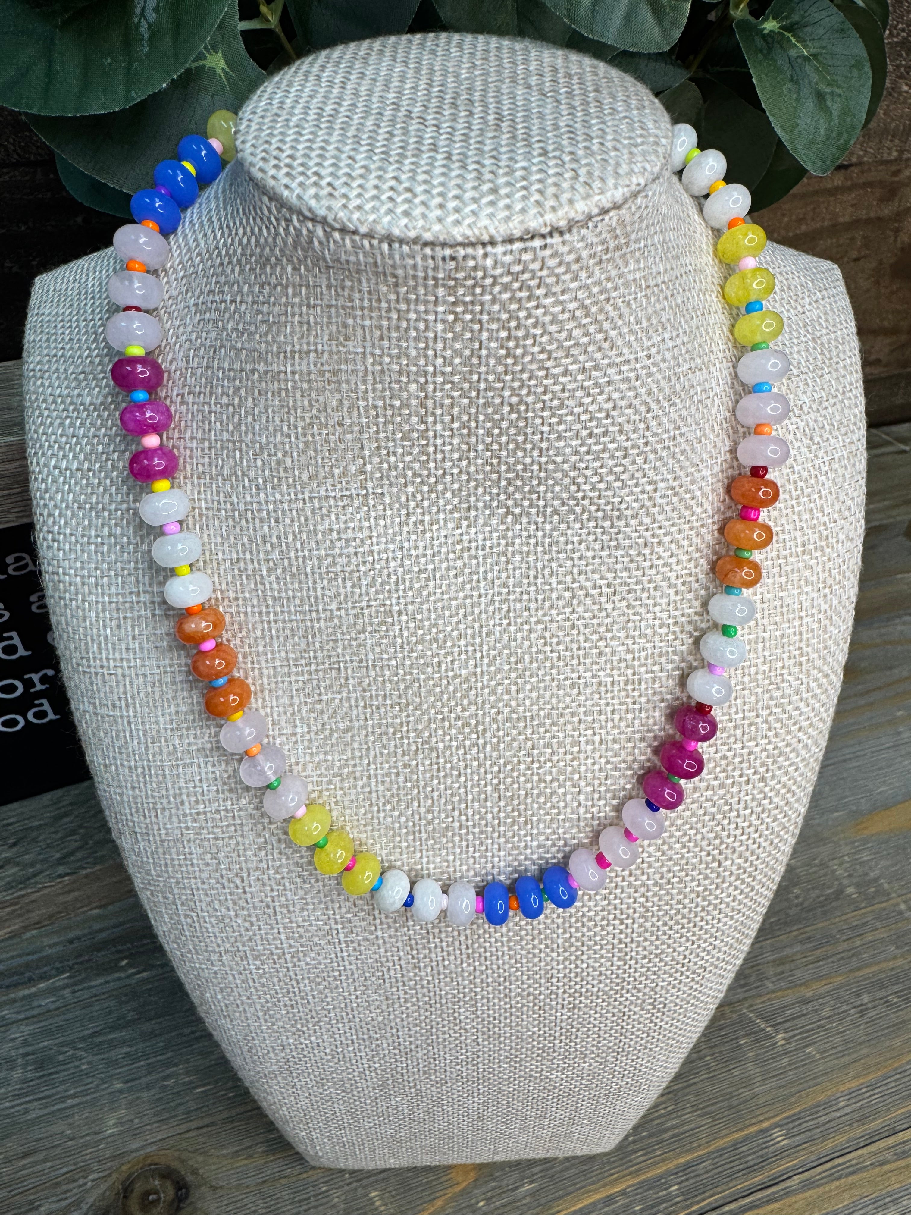 Bring back the fun with this Nostalgic Vibrant Gemstone Necklace—a grown-up twist on a childhood favorite. Bursting with bold, jewel-toned colors that pop, this 16" necklace (with 2" extender) captures that sweet candy-inspired aesthetic with a sophisticated edge. Perfect for adding a splash of color and whimsy to your everyday look or making a playful statement at any occasion. Wear your nostalgia with style.
