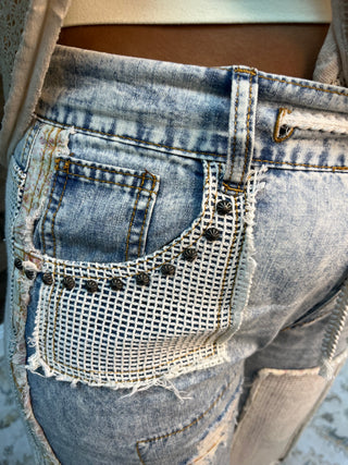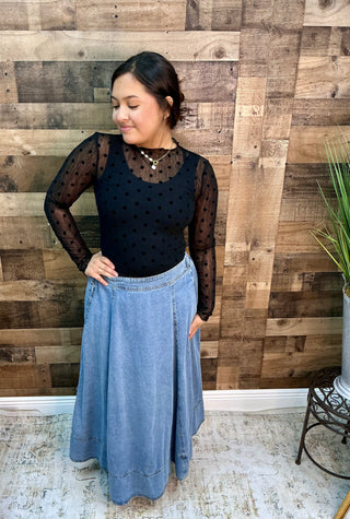 Washed Denim Favorite Flair Midi Skirt w/ Contrast Stitch