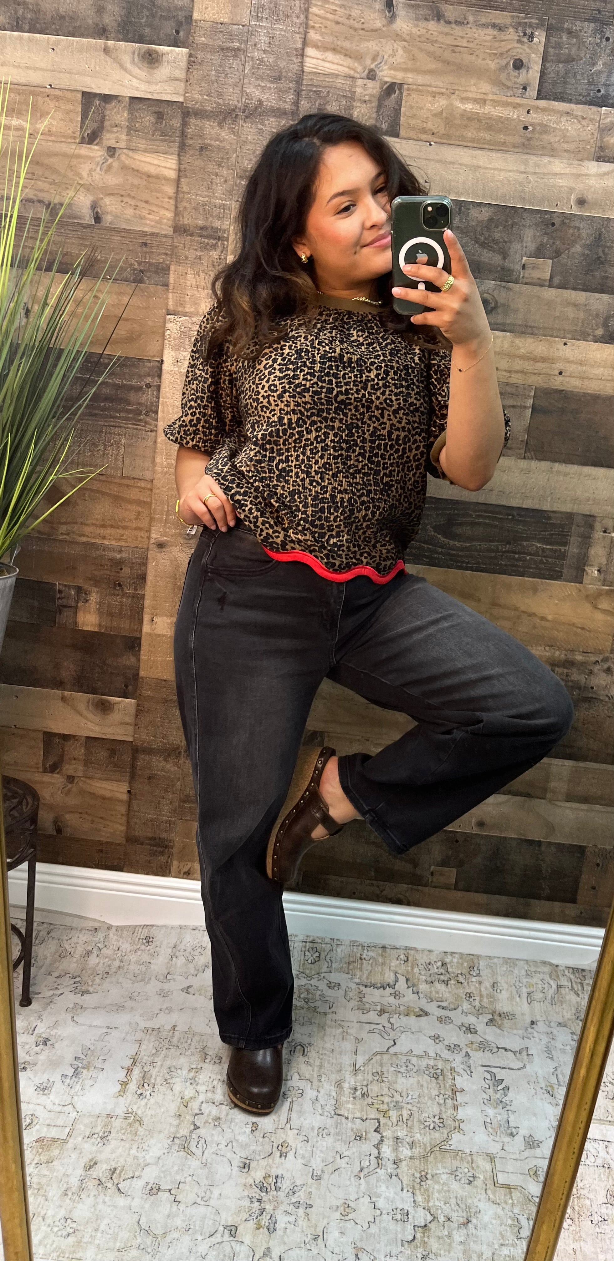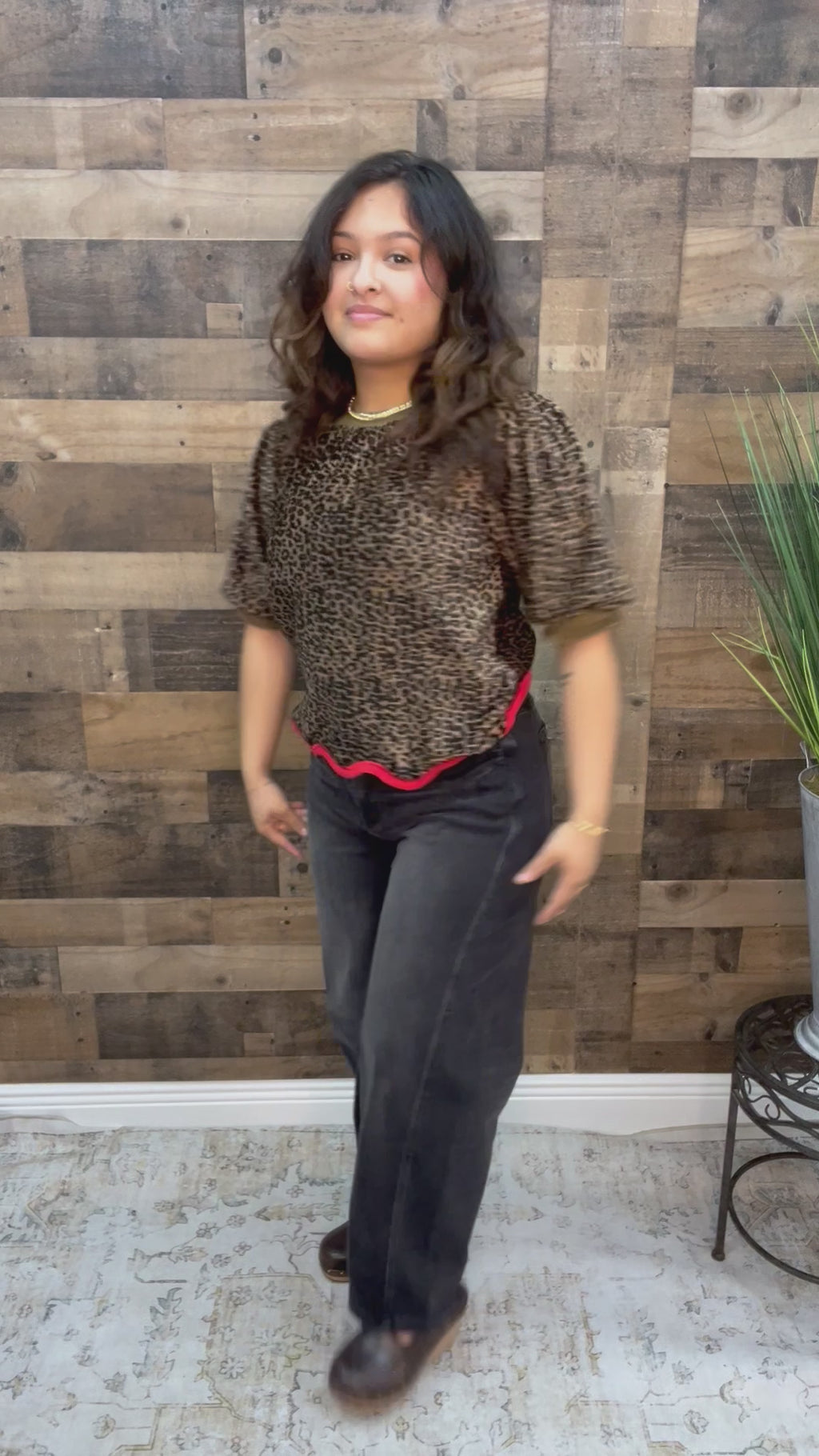 Add a wild twist to your wardrobe with this VOY Brown Leopard top featuring a playful red contrast wavy hem. Its bold print and fun detailing make it perfect for standing out while staying comfy and stylish. Let your outfit roar with personality!