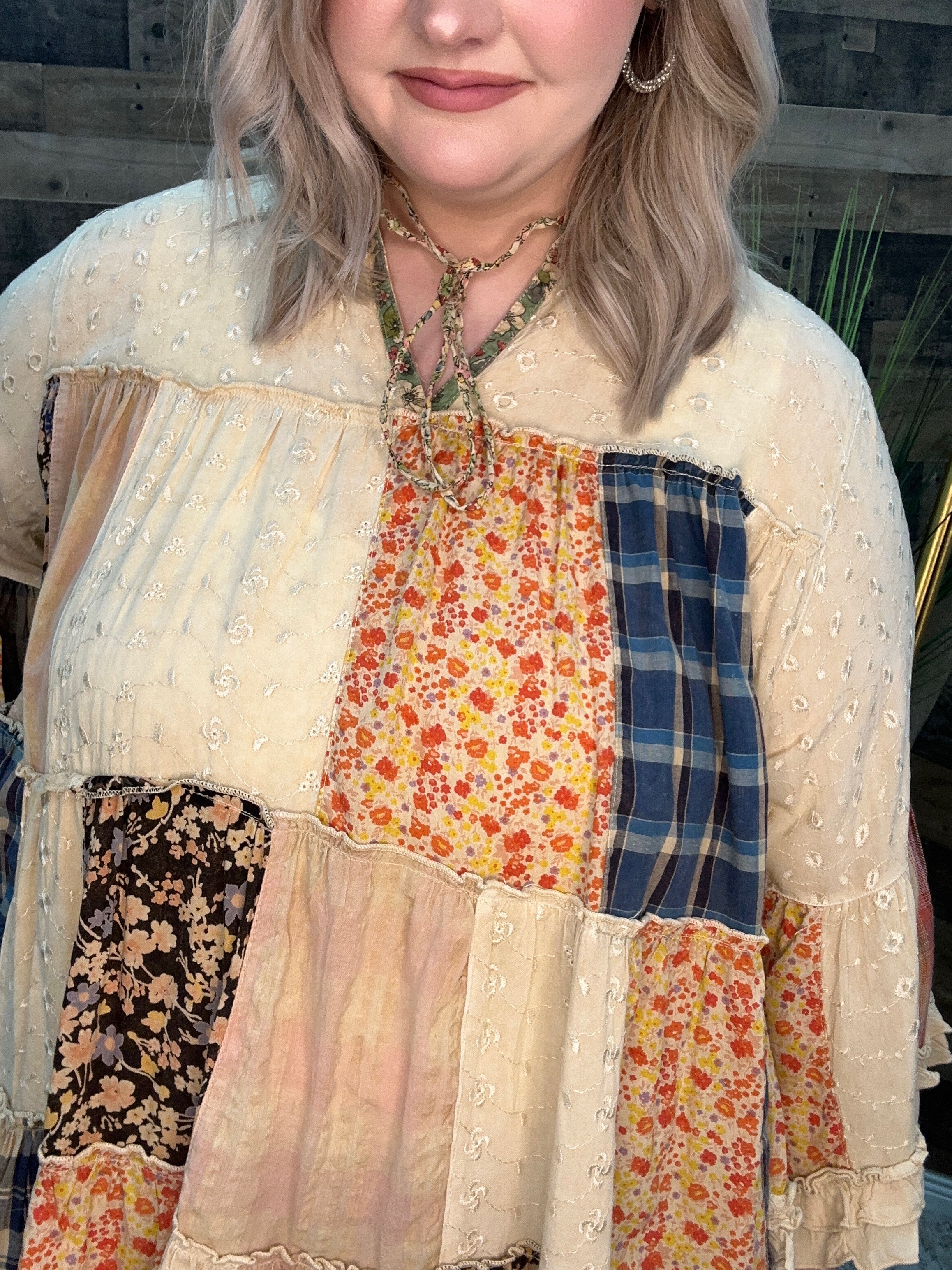 Embrace effortless charm with this vintage-inspired top featuring breathable fabrics for all-day ease. Its relaxed silhouette invites carefree movement, while the classic round neckline and 3/4 sleeves offer timeless style perfect for layering or wearing solo. Crafted with creative patchwork—combining rayon embroidery, eclectic prints, cotton denim, and checks—it brings an artsy, textured flair to your outfit. Whether paired with denims, palazzos, or skirts, it’s your go-to for brunch dates, casual dinners, or spirited evenings out. Let your wardrobe playfully come alive with this uniquely stylish piece. Due to the Handcrafted Patchwork nature, each piece is truly one-of-a-kind with unique placement of prints and fabrics.