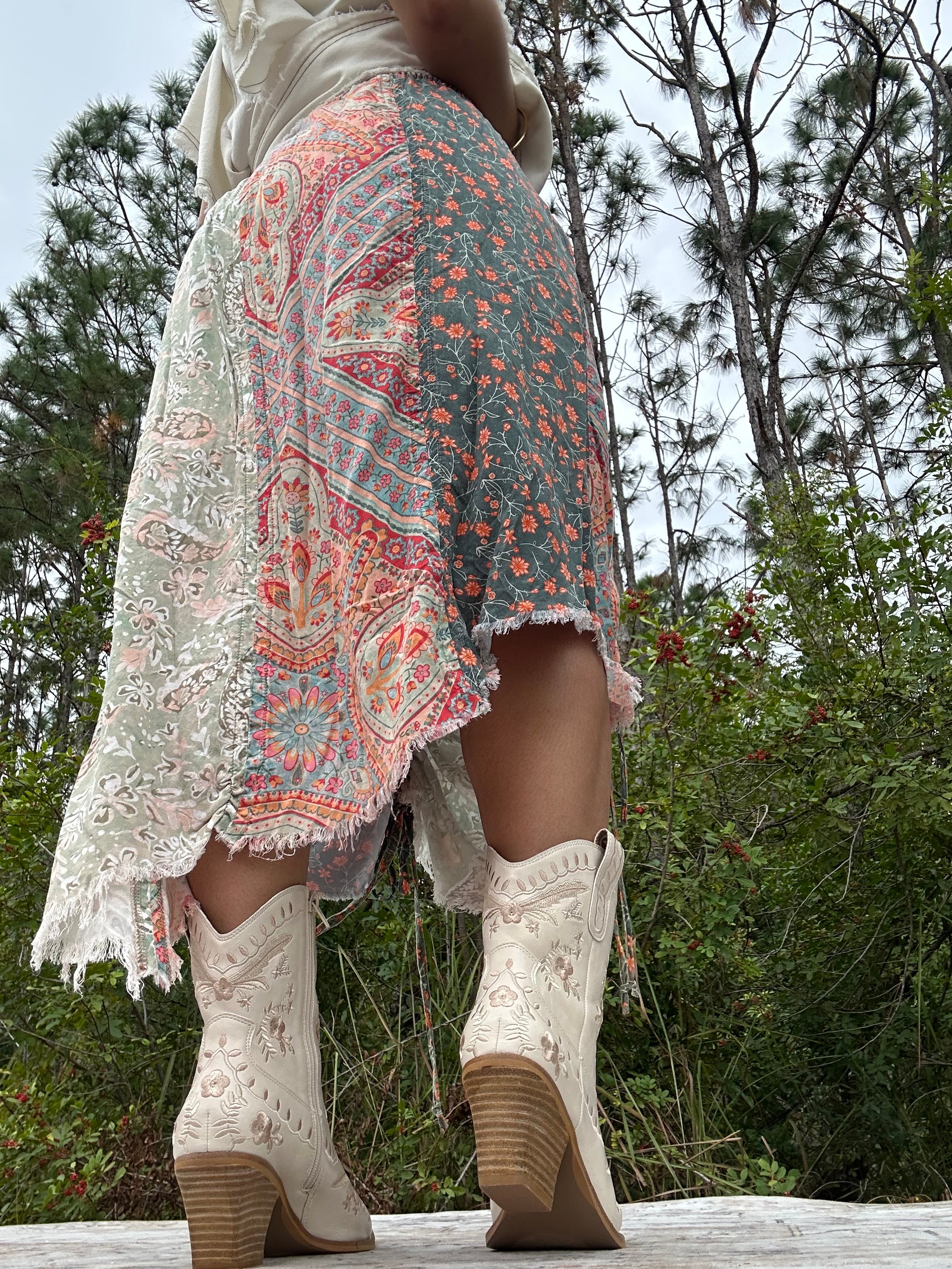Embrace your eclectic side with this eye-catching patchwork midi skirt from Oli & Hali. Featuring a vibrant mix of prints that dance across the fabric, the cinched hem can be drawn from the hem for a fabulous, boho look! Perfect for adding personality to any outfit, this skirt transitions effortlessly from casual weekend vibes to dressed-up occasions. A playful piece that celebrates bold style and individuality.