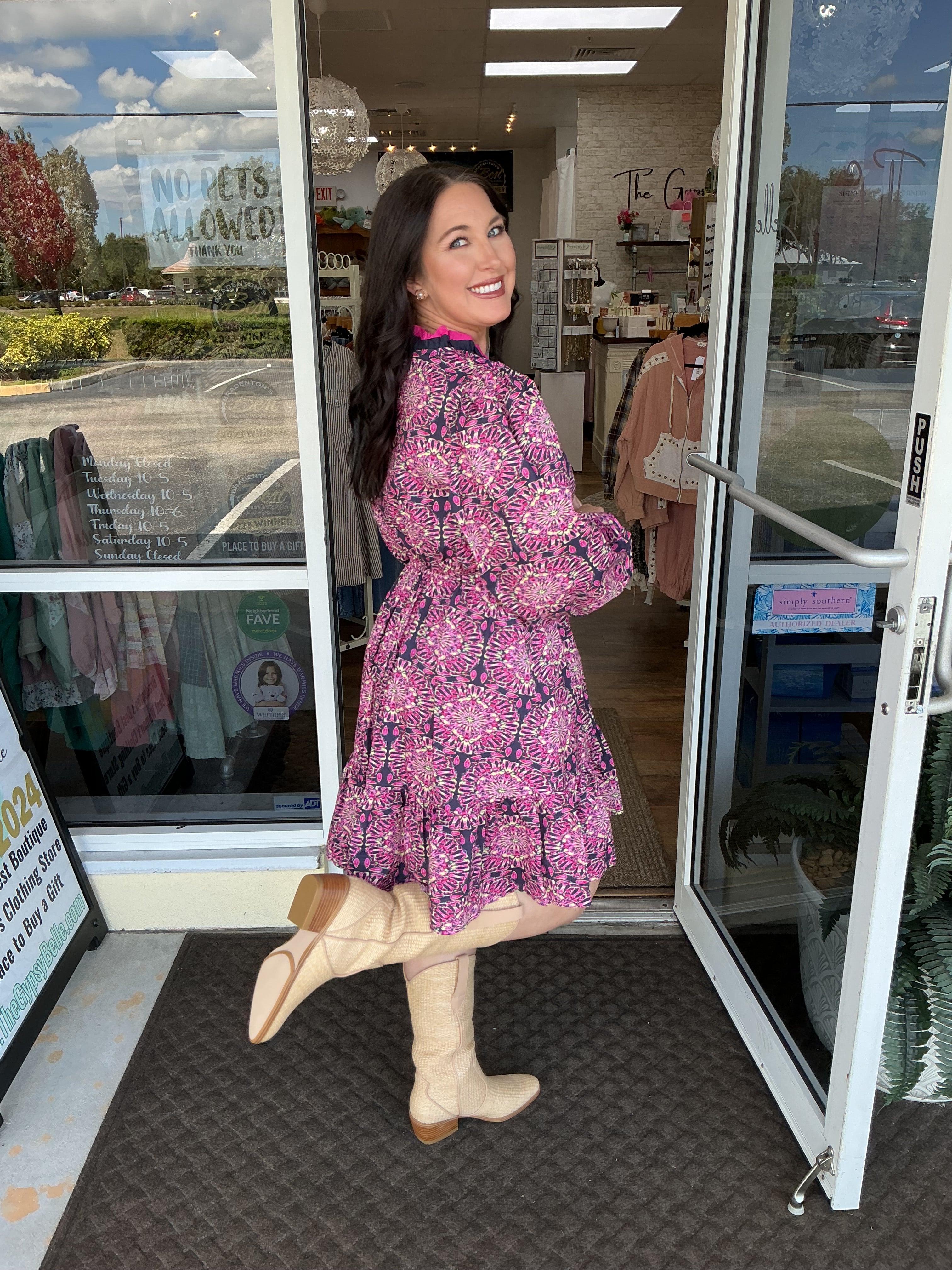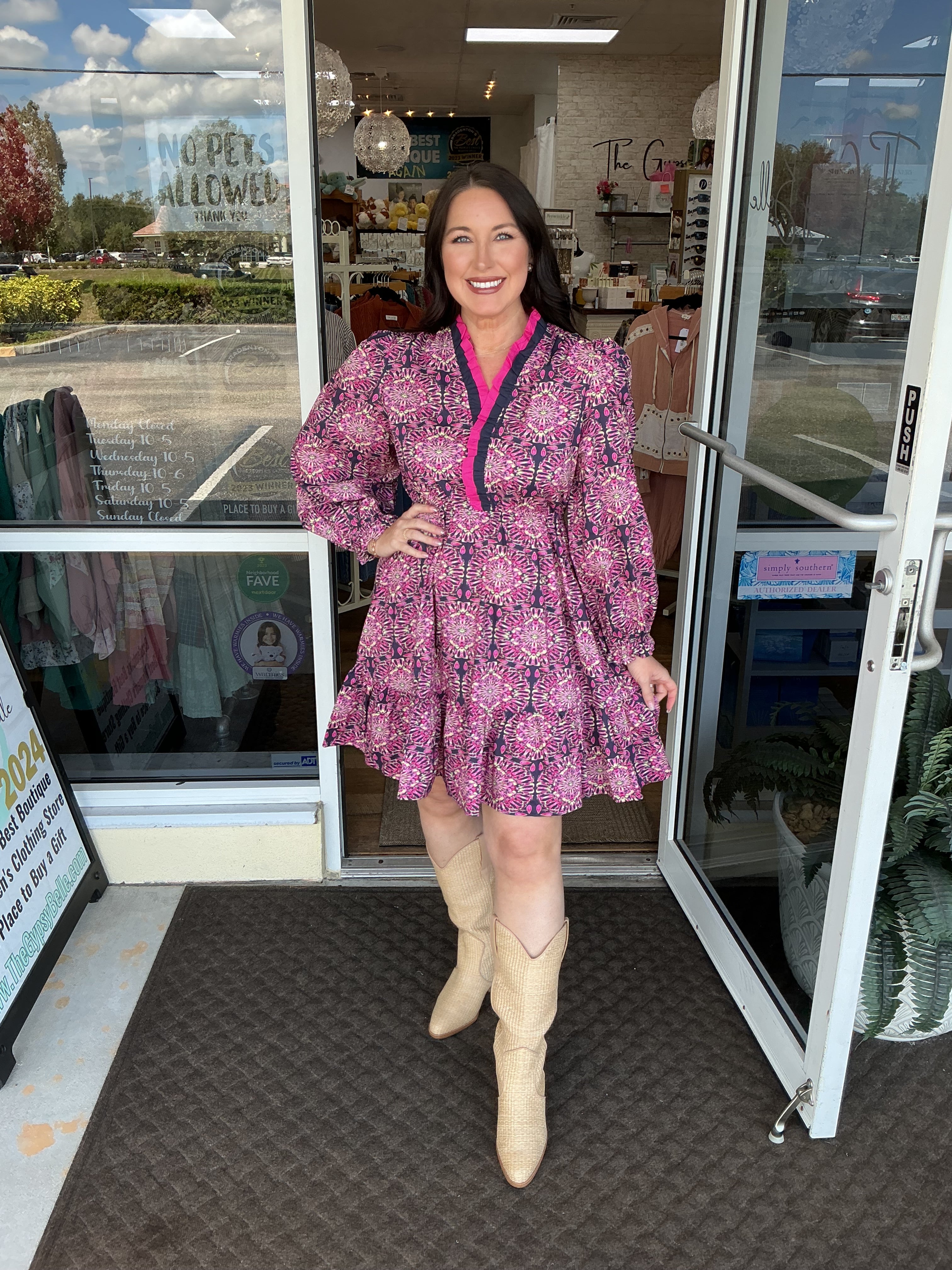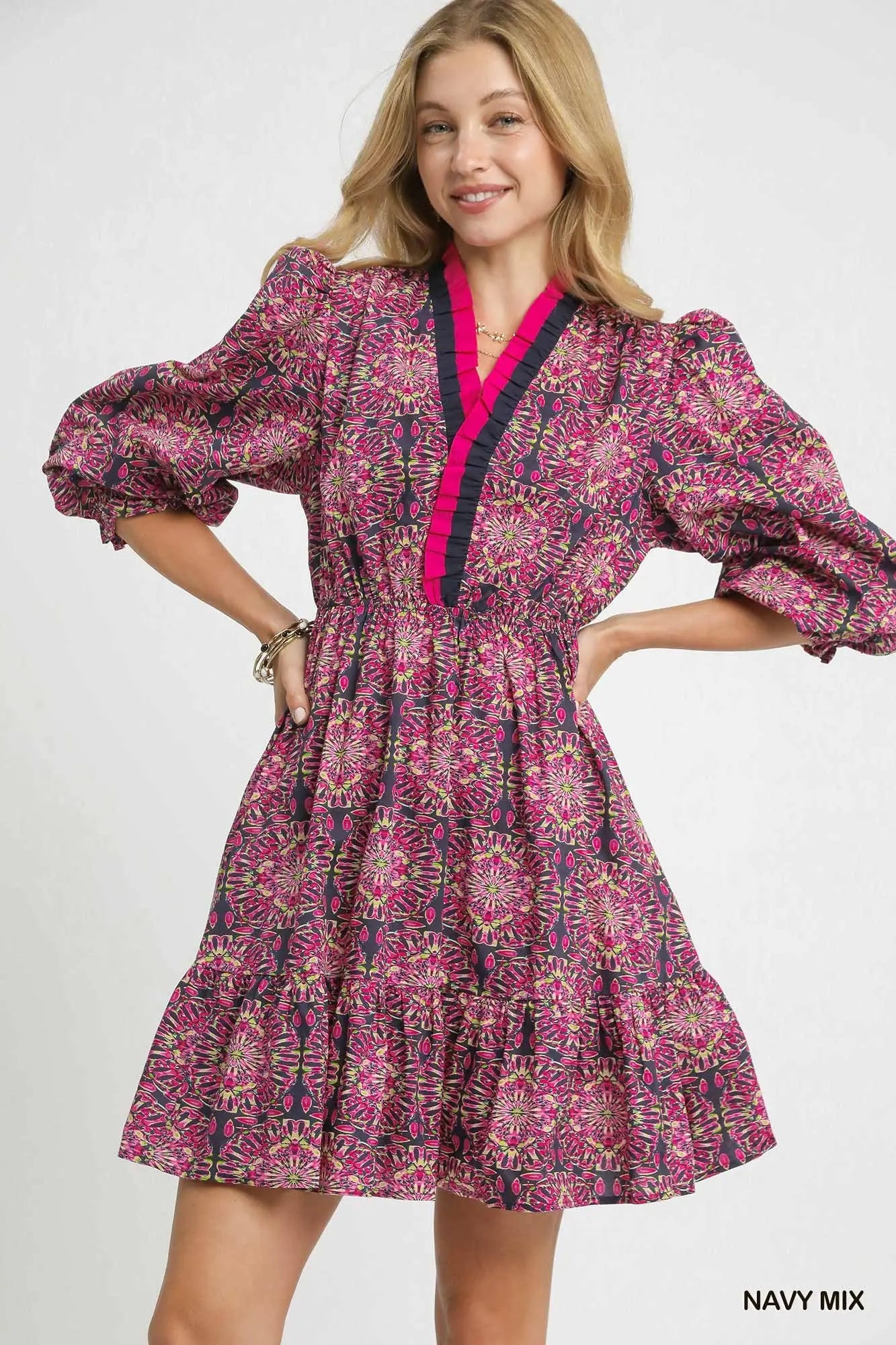 This adorable baby doll dress combines textured fabric with delightful ruffle trim for a whimsical touch. Smocked sleeves provide a flexible fit, while the flattering V-neck adds a dash of charm. Offered in two lively colors, it’s designed for fun days and effortless style. Perfect colors for holidays!