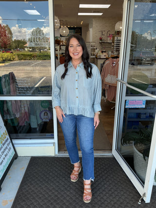 Oddi Striped Button Top w/ Drop Shoulders & High Low Hem (2 COLORS)