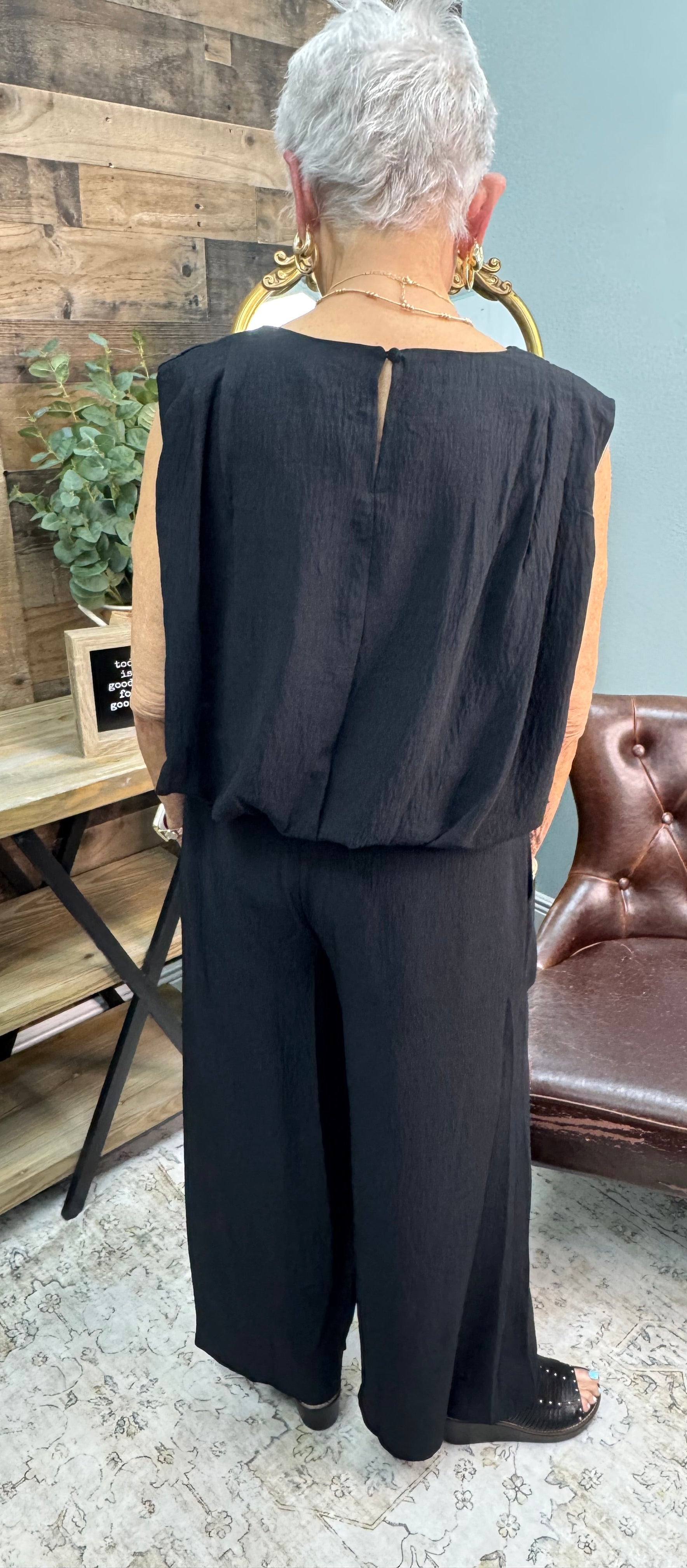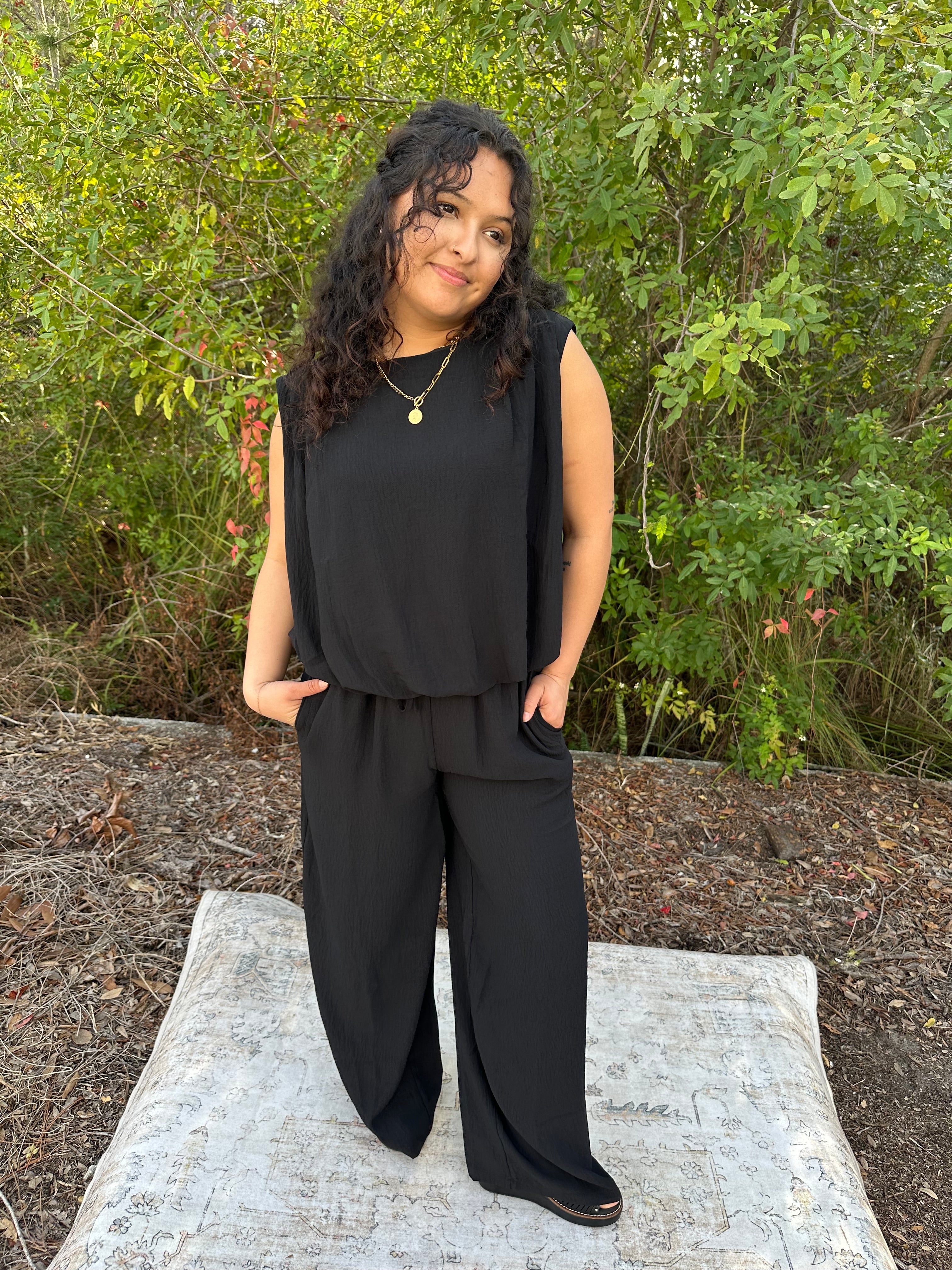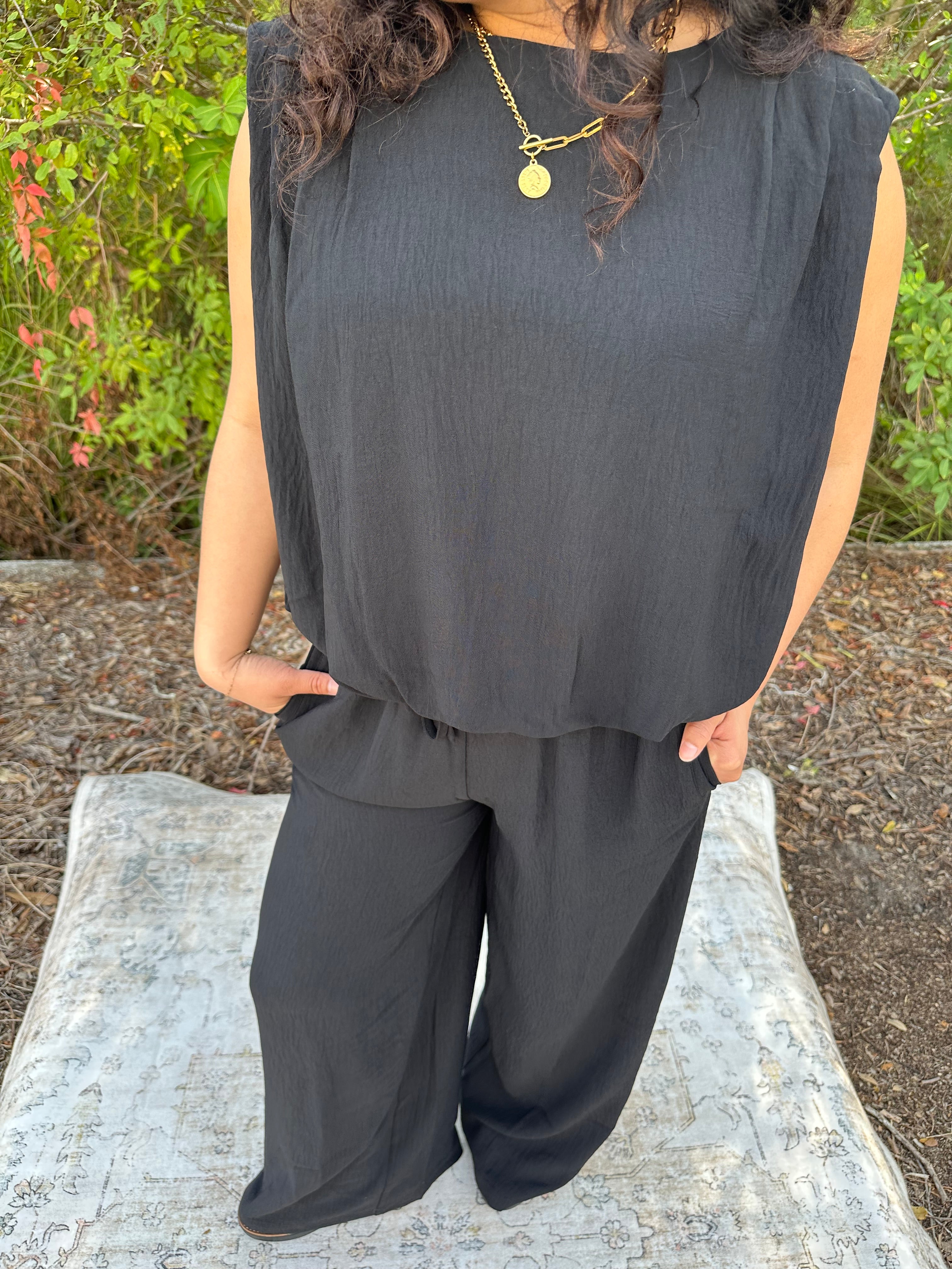 Classic black never misses! This sleek two-piece set pairs a chic sleeveless top with relaxed wide-leg pants for a look that transitions seamlessly from day to night. Lightweight fabric keeps you cool while the minimalist silhouette flatters every frame. Available in sizes Small through 3XLarge!