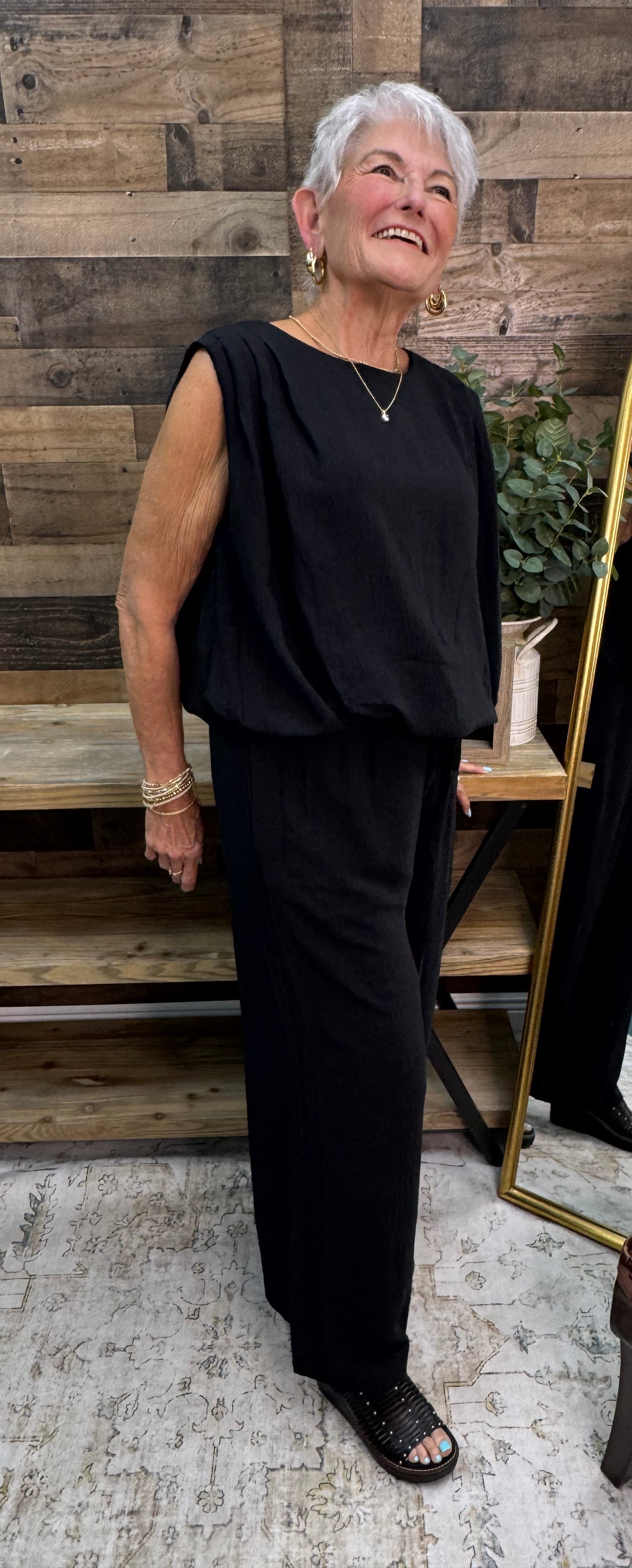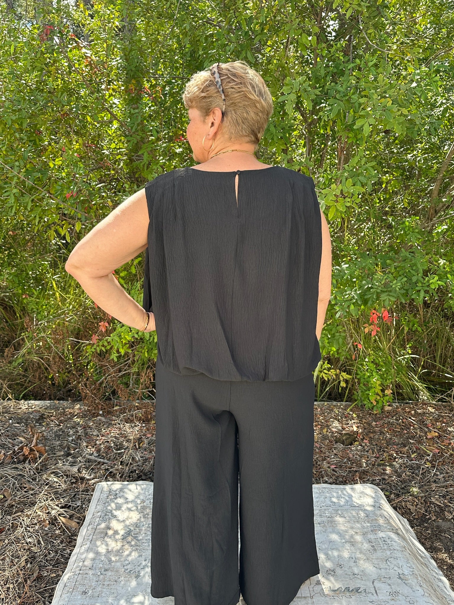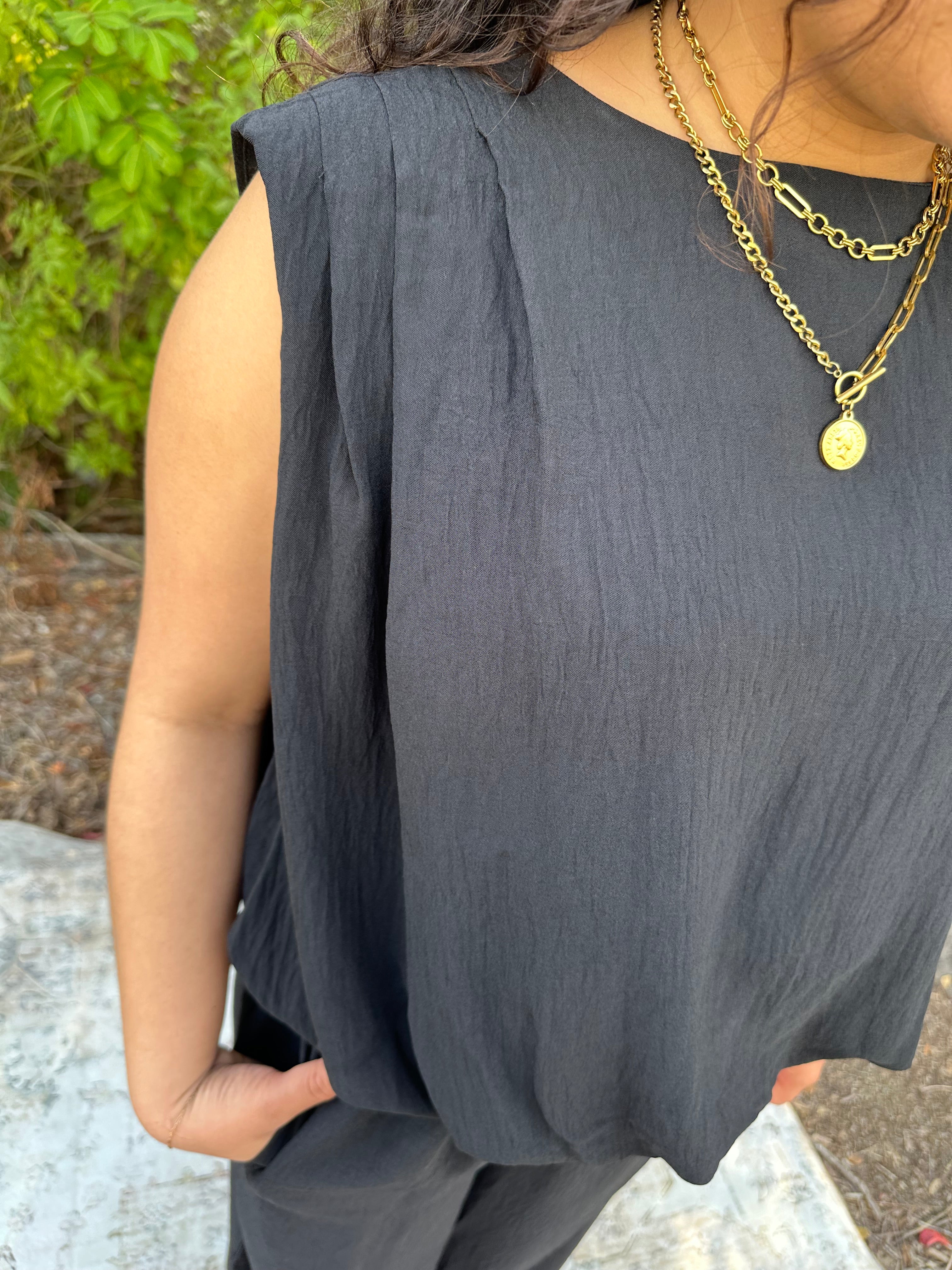 Classic black never misses! This sleek two-piece set pairs a chic sleeveless top with relaxed wide-leg pants for a look that transitions seamlessly from day to night. Lightweight fabric keeps you cool while the minimalist silhouette flatters every frame. Available in sizes Small through 3XLarge!