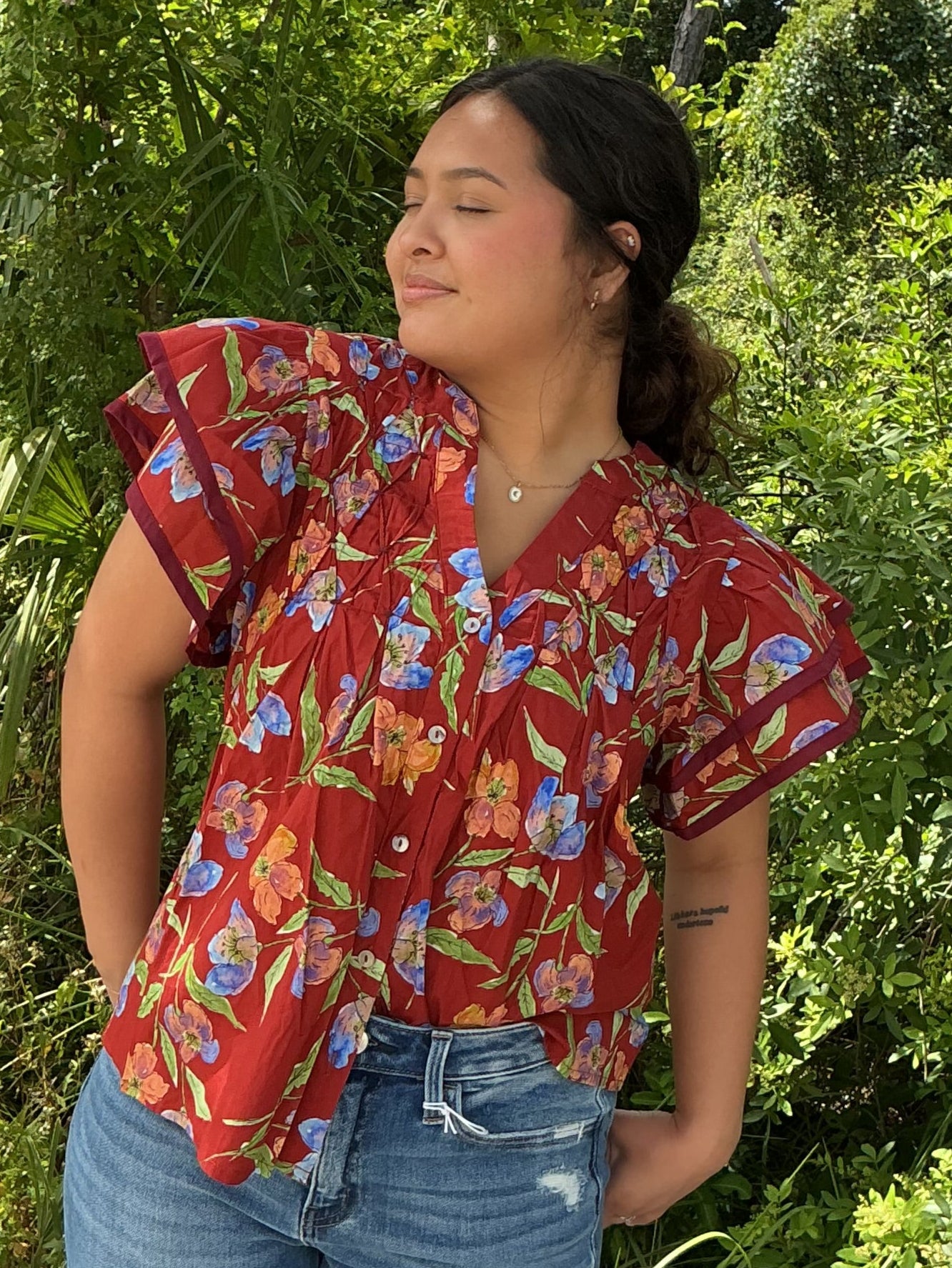 Add a splash of charm to your wardrobe with the Entro Olive Patchwork Ditsy Floral Top. This playful printed v-neck features 3/4 sleeves adorned with fun puff details and delicate ruffles at the cuffs, creating a flirty, feminine vibe. Perfect for breezy days or layering up, it brings effortless style to your everyday look.