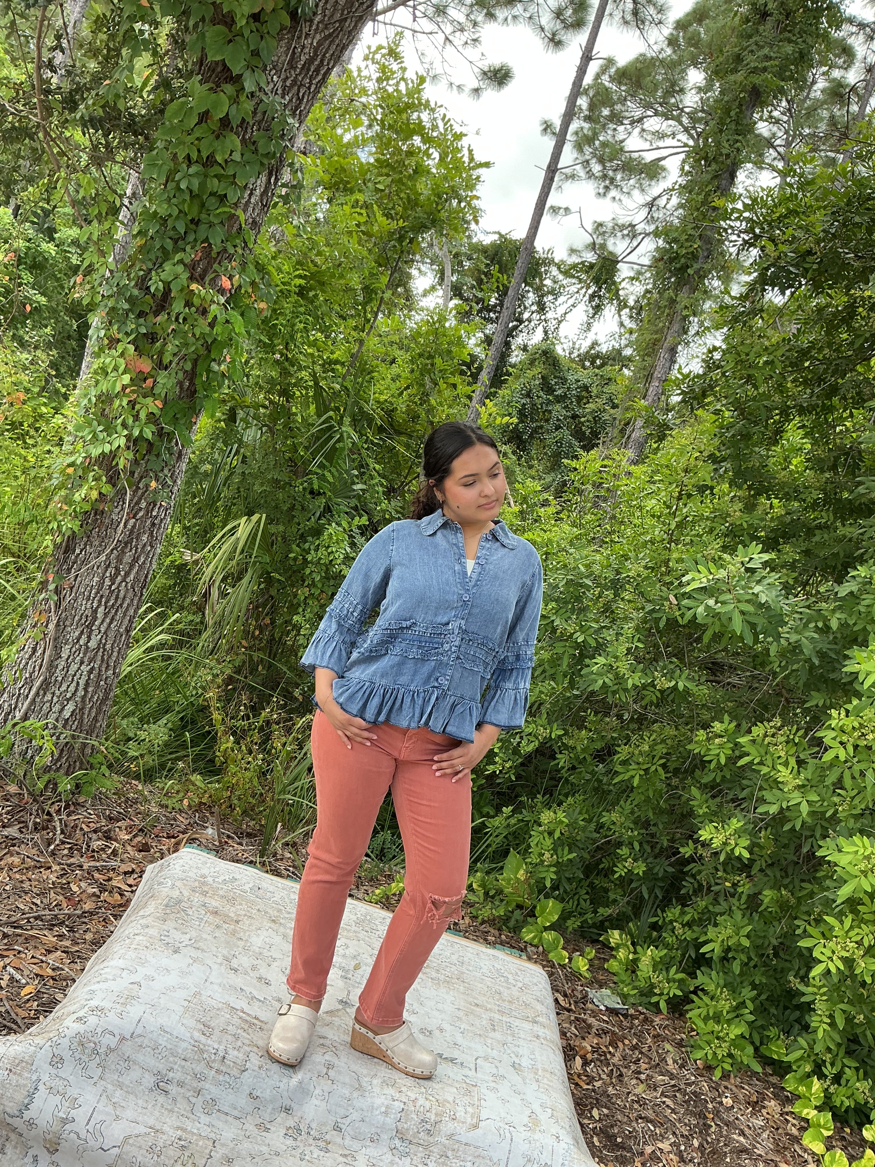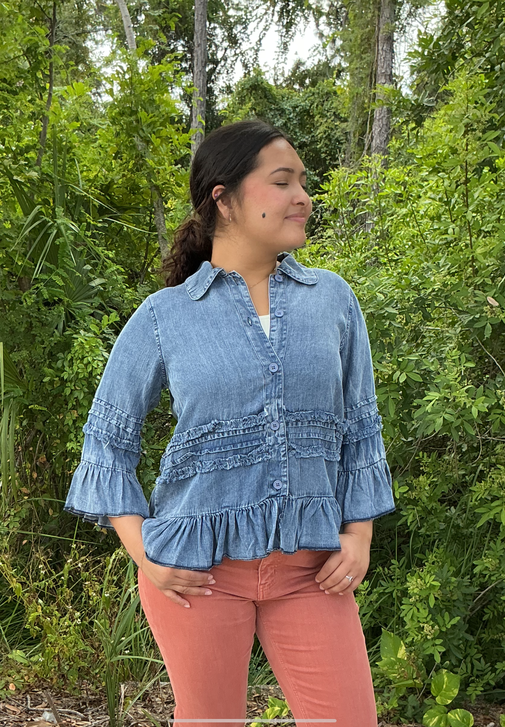 Origami Chambray Ruffles 3/4 Slv Shacket Top