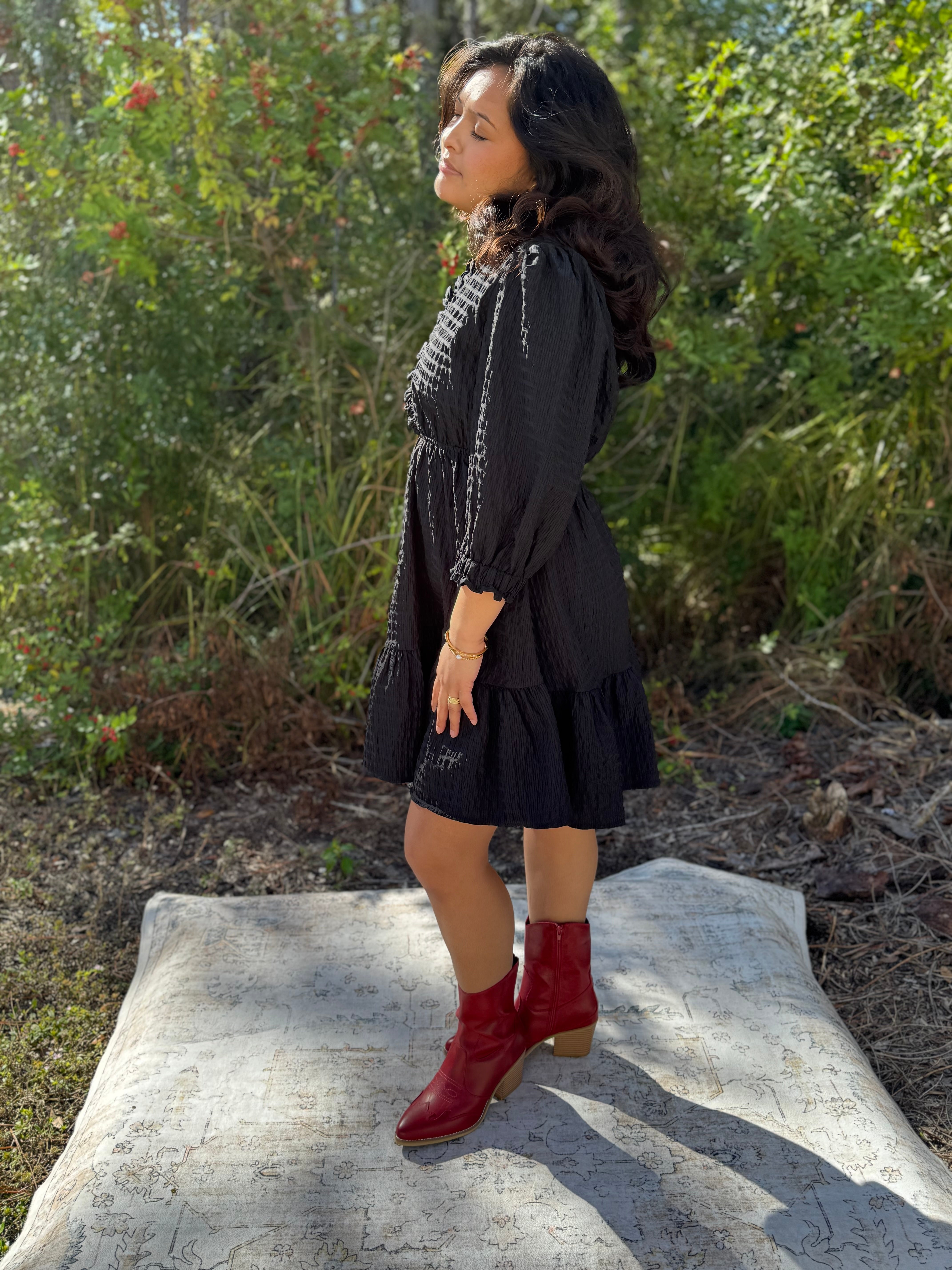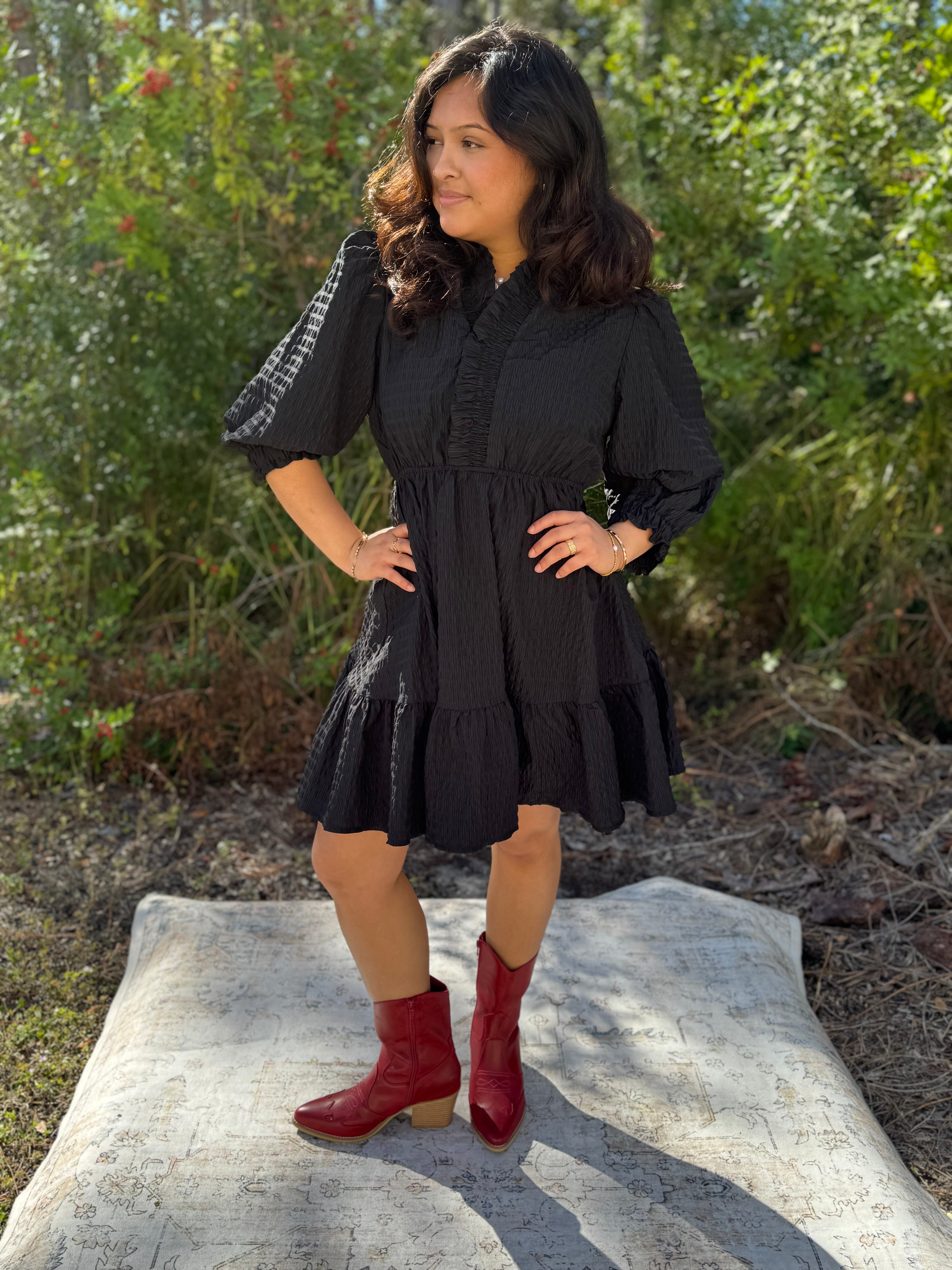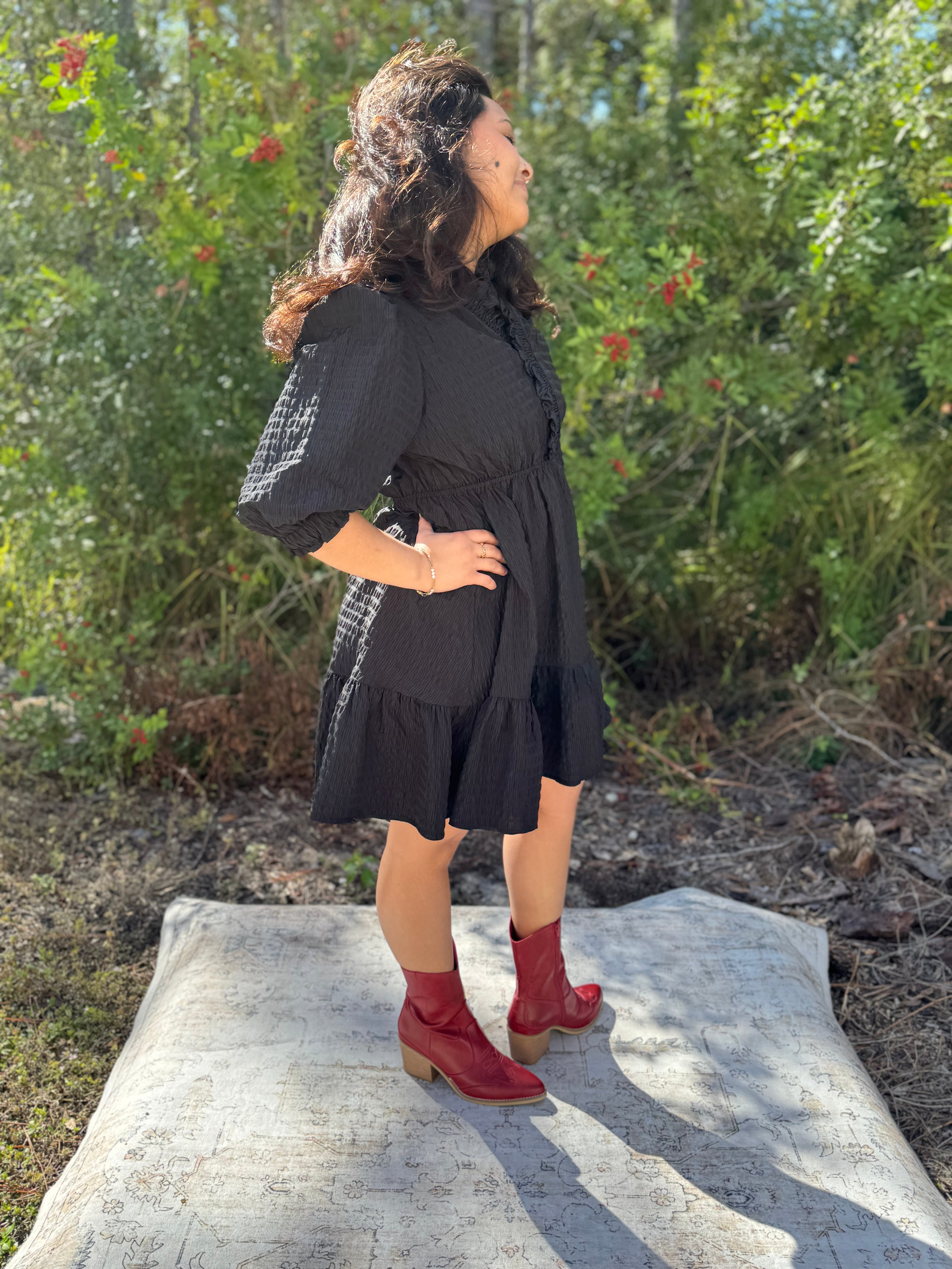 This adorable baby doll dress combines textured fabric with delightful ruffle trim for a whimsical touch. Smocked sleeves provide a flexible fit, while the flattering V-neck adds a dash of charm. Offered in two lively colors, it’s designed for fun days and effortless style. Perfect colors for holidays!