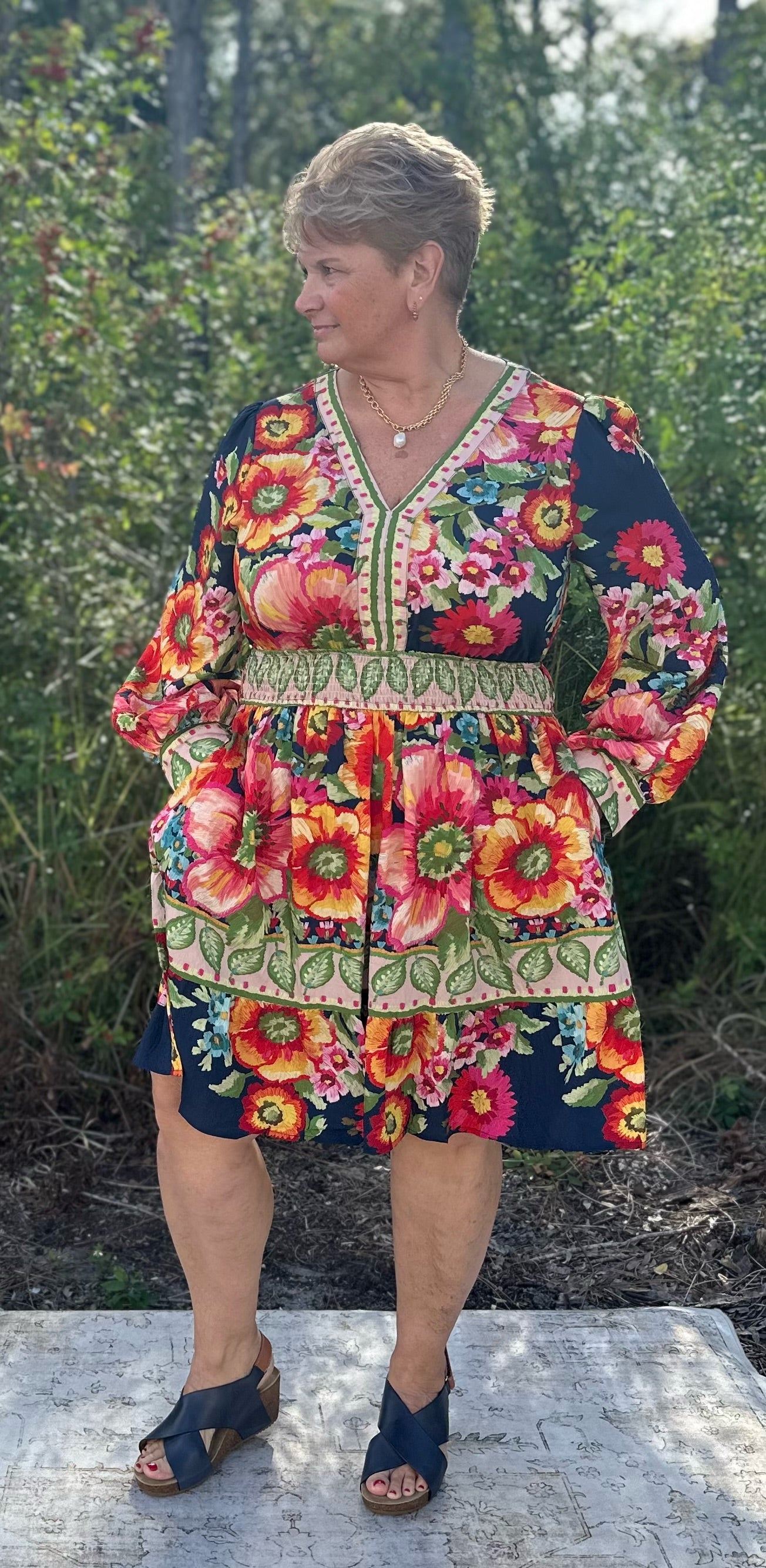 Twirl into any occasion in this charming Oddi dress that's equal parts whimsical and wearable. The navy base features a gorgeous floral border print that frames the neckline and hem, while delicate balloon sleeves add a touch of romantic flair. The smocked waist cinches beautifully to create a flattering silhouette that moves with you. Perfect for brunch dates, garden parties, or whenever you want to feel effortlessly put-together with personality to spare.