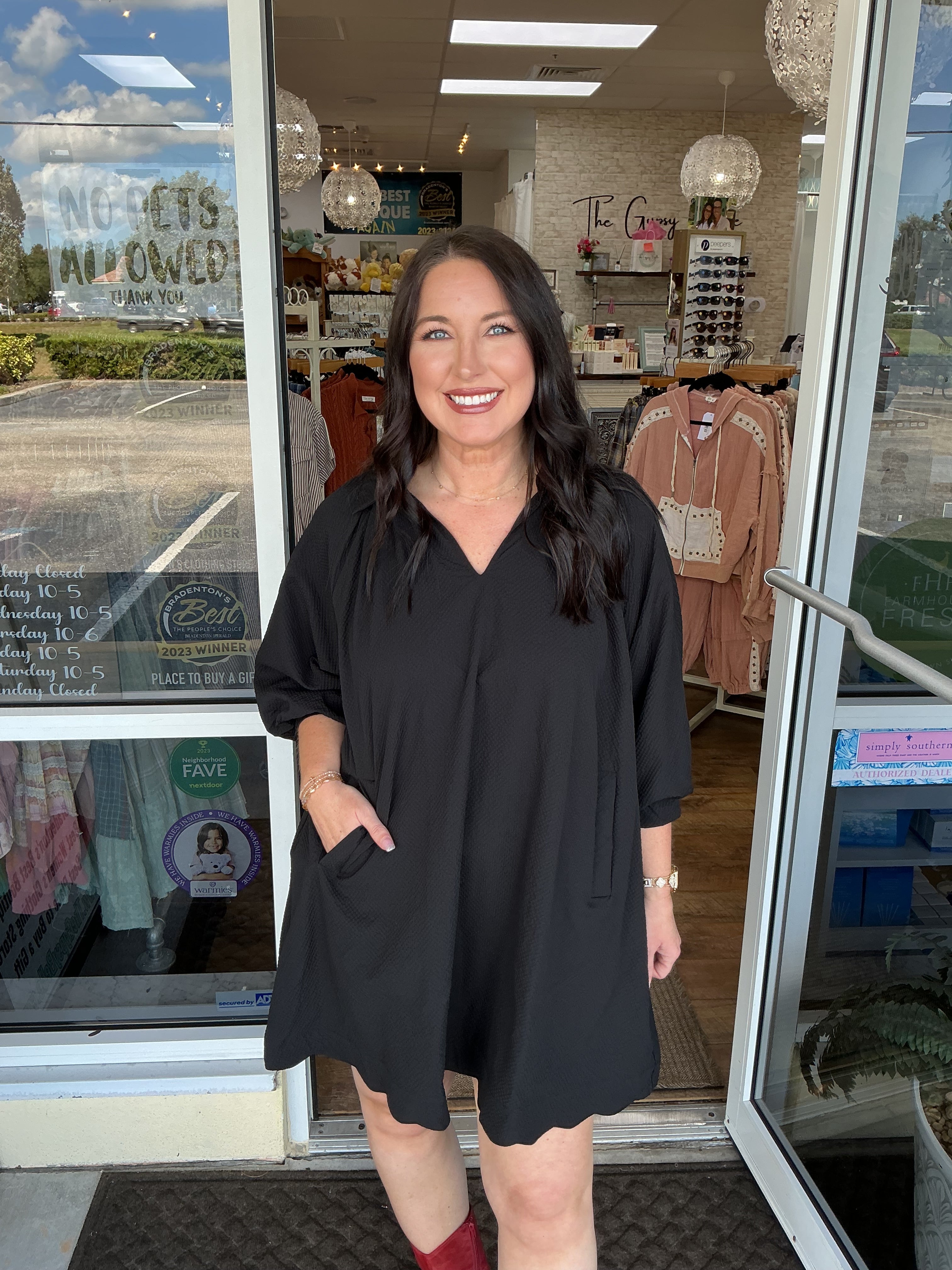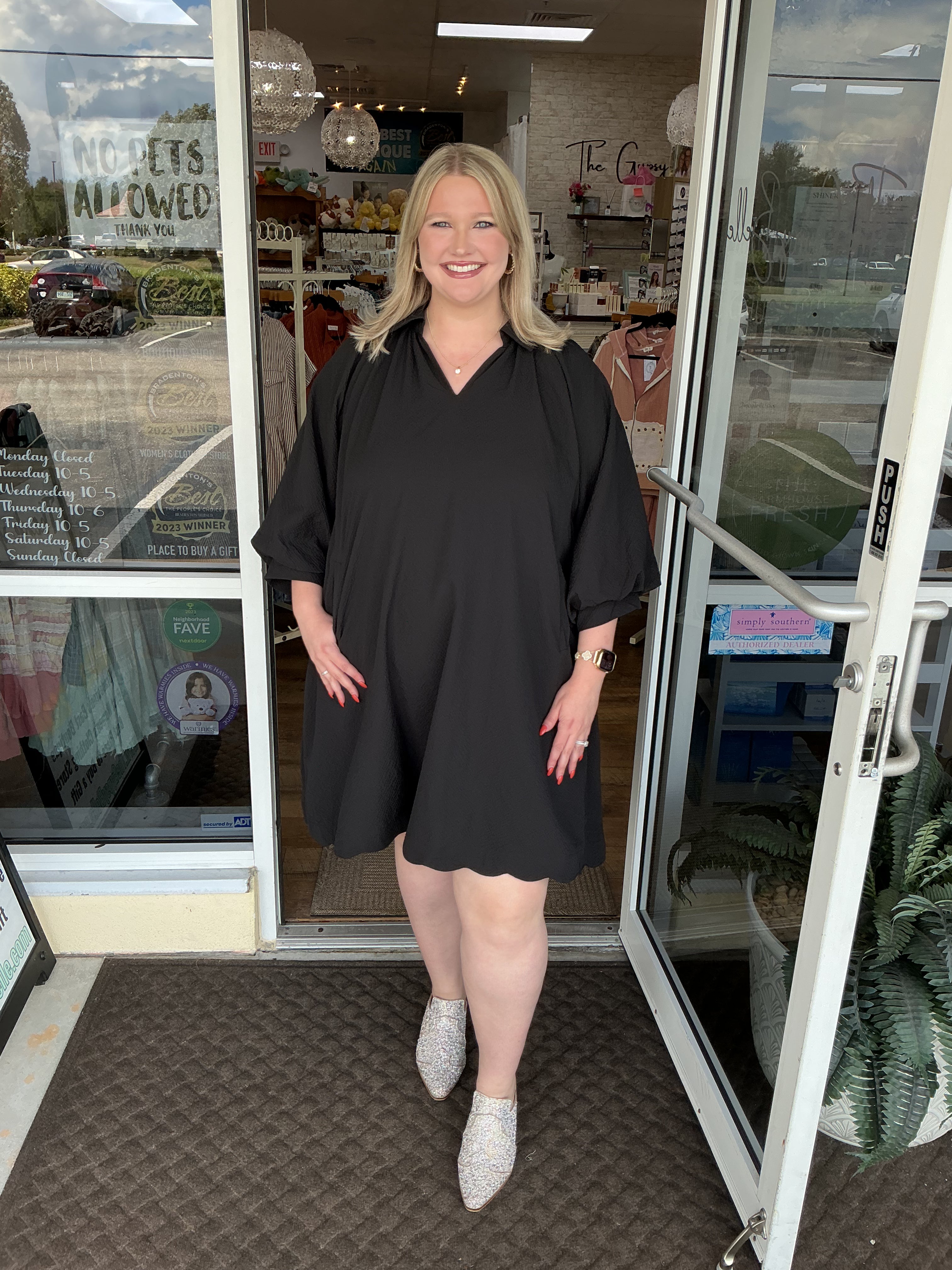 This Umgee Black Dress features charming 3/4 bubble sleeves and a delicate scalloped detail for a whimsical touch. The split neckline with a flat collar adds a flirty edge, and it has pockets! Perfect for adding playful sophistication to your wardrobe!