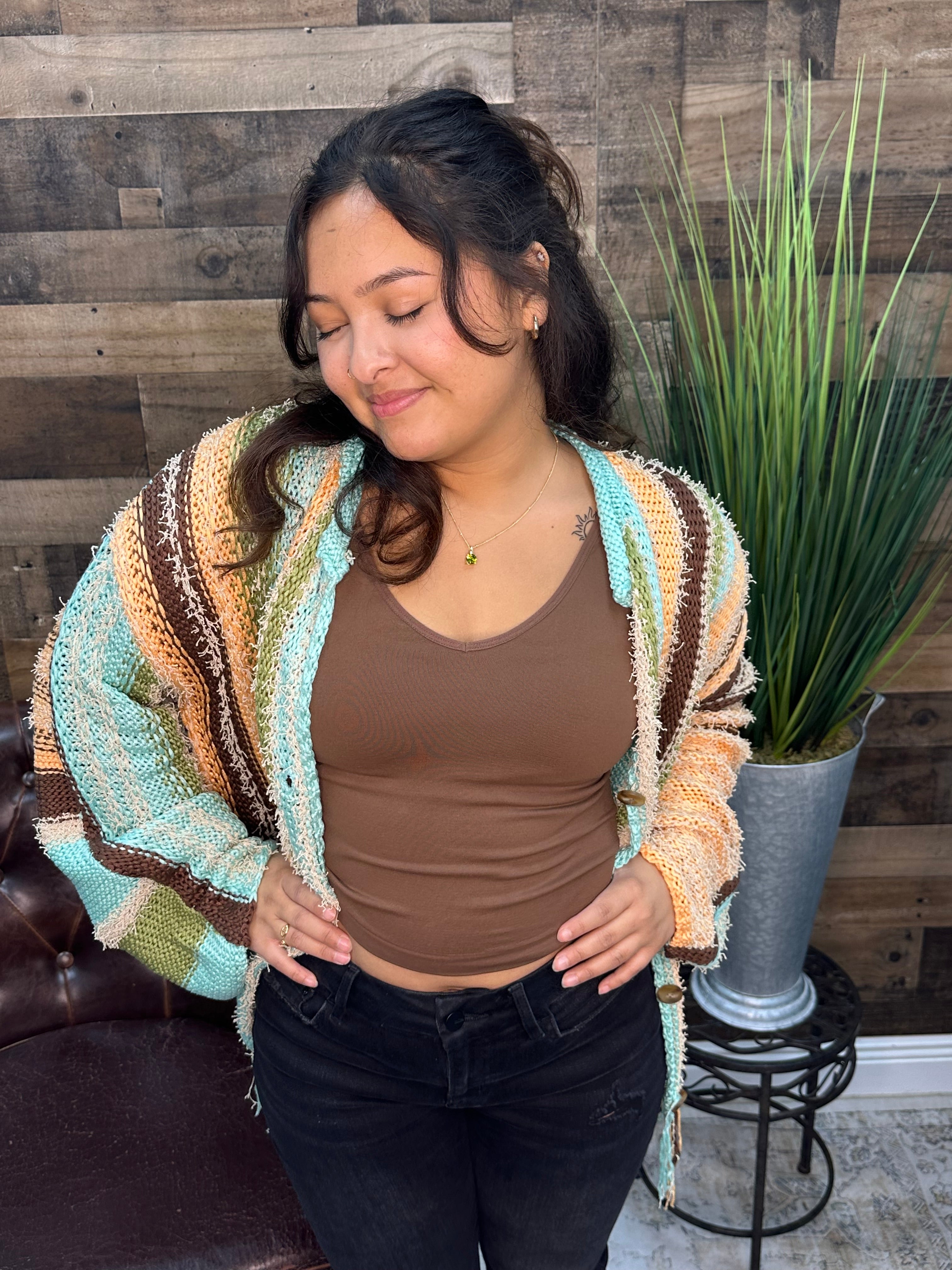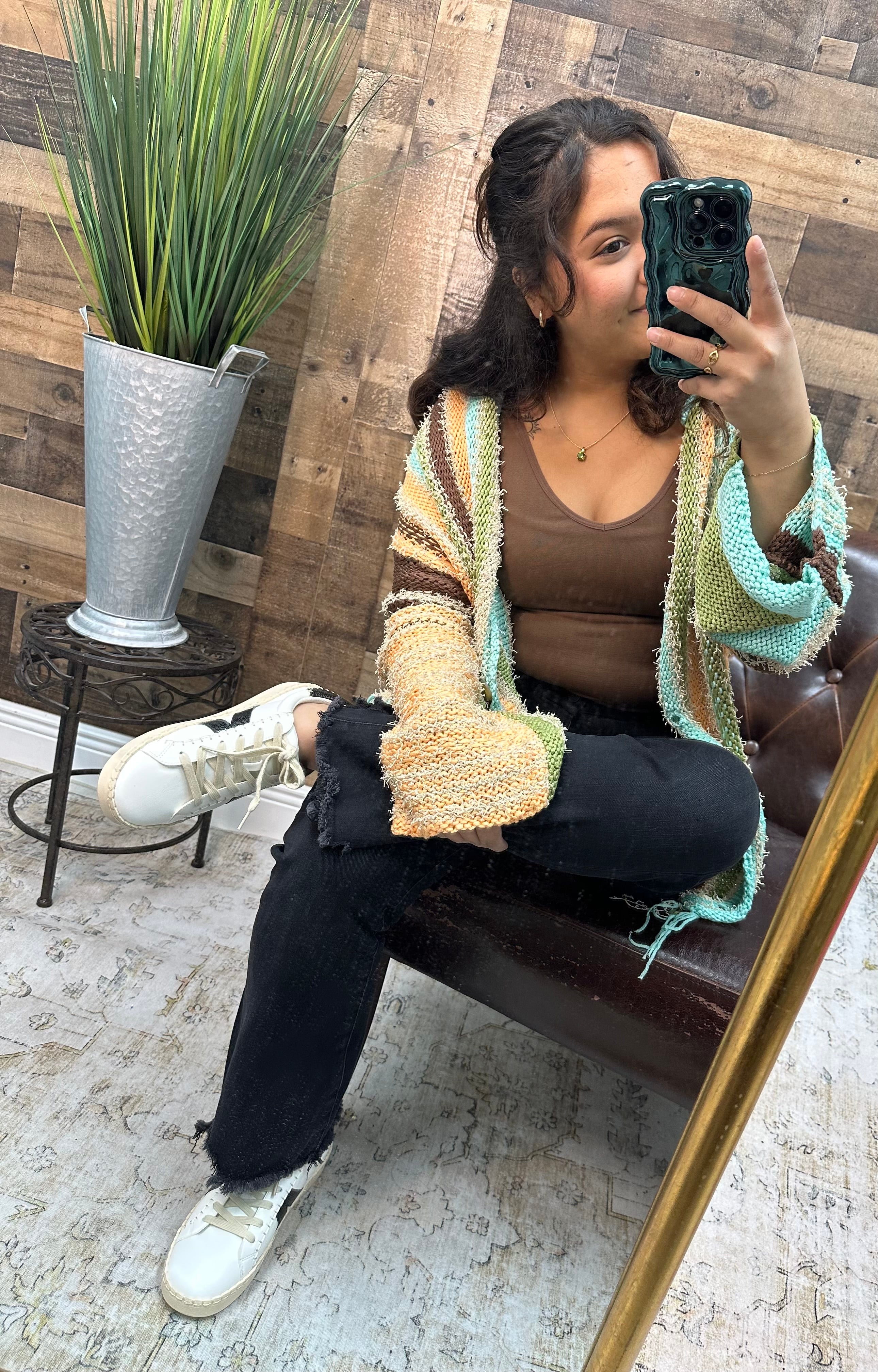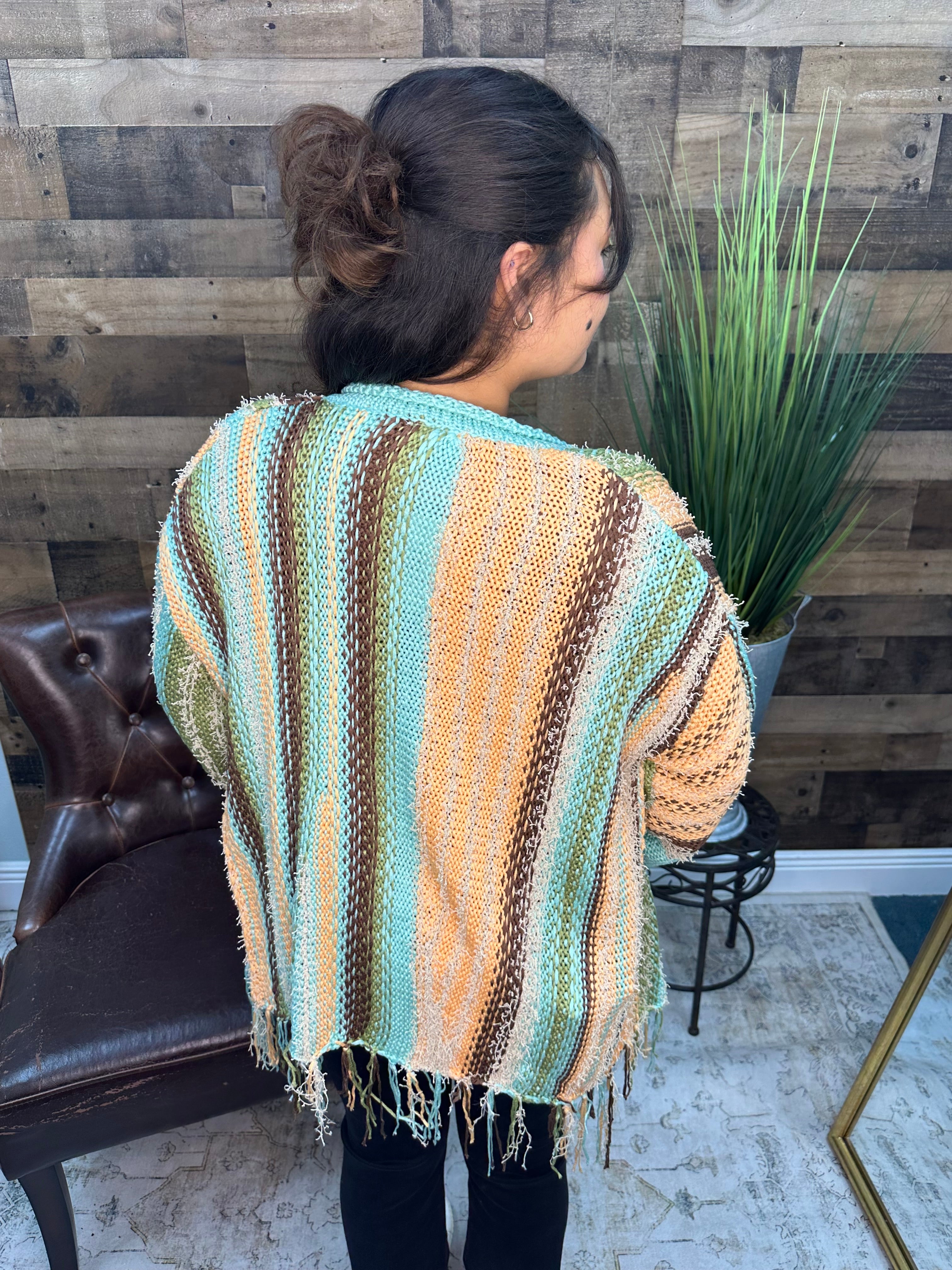 Wrap yourself in fun and color with the Easel Aqua Peach Multi Stripe Fringe Cardigan Sweater. Its cheerful stripes and breezy fringe add a playful touch to any outfit, perfect for layering on cooler days. Whether you're out for brunch or a casual stroll, this cardigan keeps your look lively and comfy all day long.