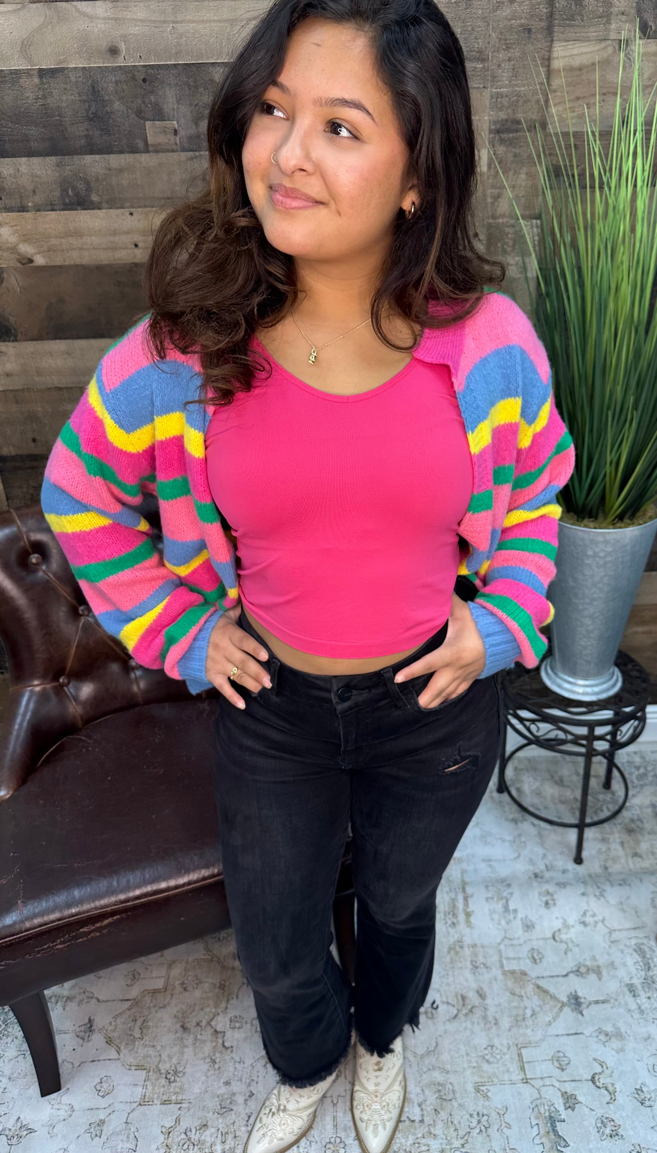Bring a burst of fun to your wardrobe with this Hot Pink Stripe Color Block Cardigan Sweater Top. The bold pink stripes paired with contrasting blocks create a lively, eye-catching look perfect for brightening any day. Soft and cozy, it’s great for layering and adding a pop of color to your casual outfits. Whether out with friends or lounging at home, this cardigan keeps things cheerful and comfortable.