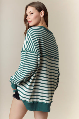 Peach Love Cream & Green Stripe Contrast Placket Sweatshirt