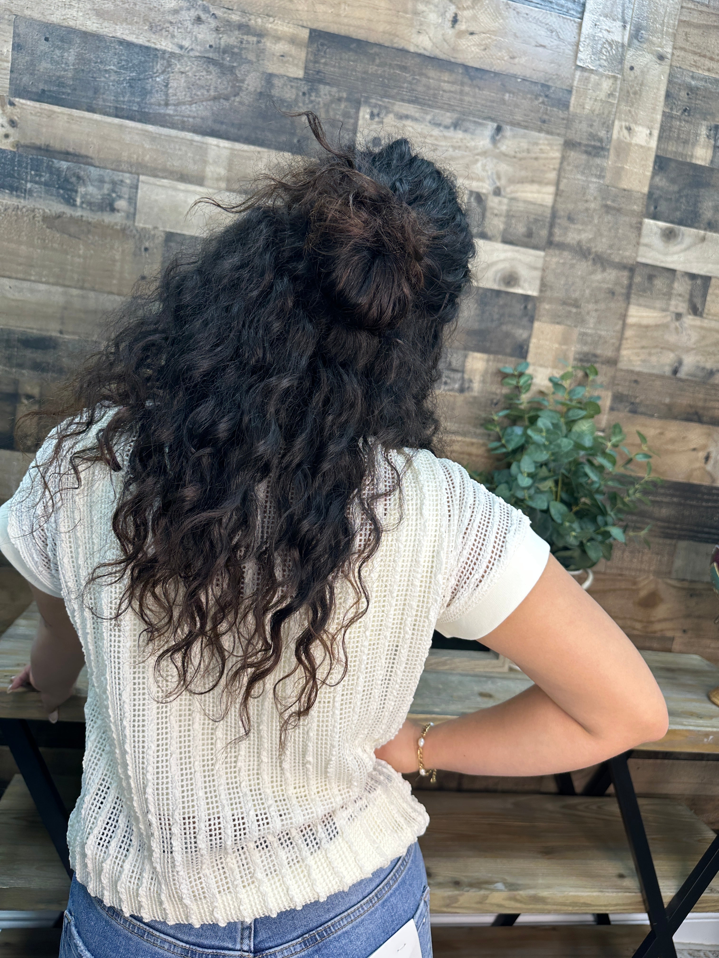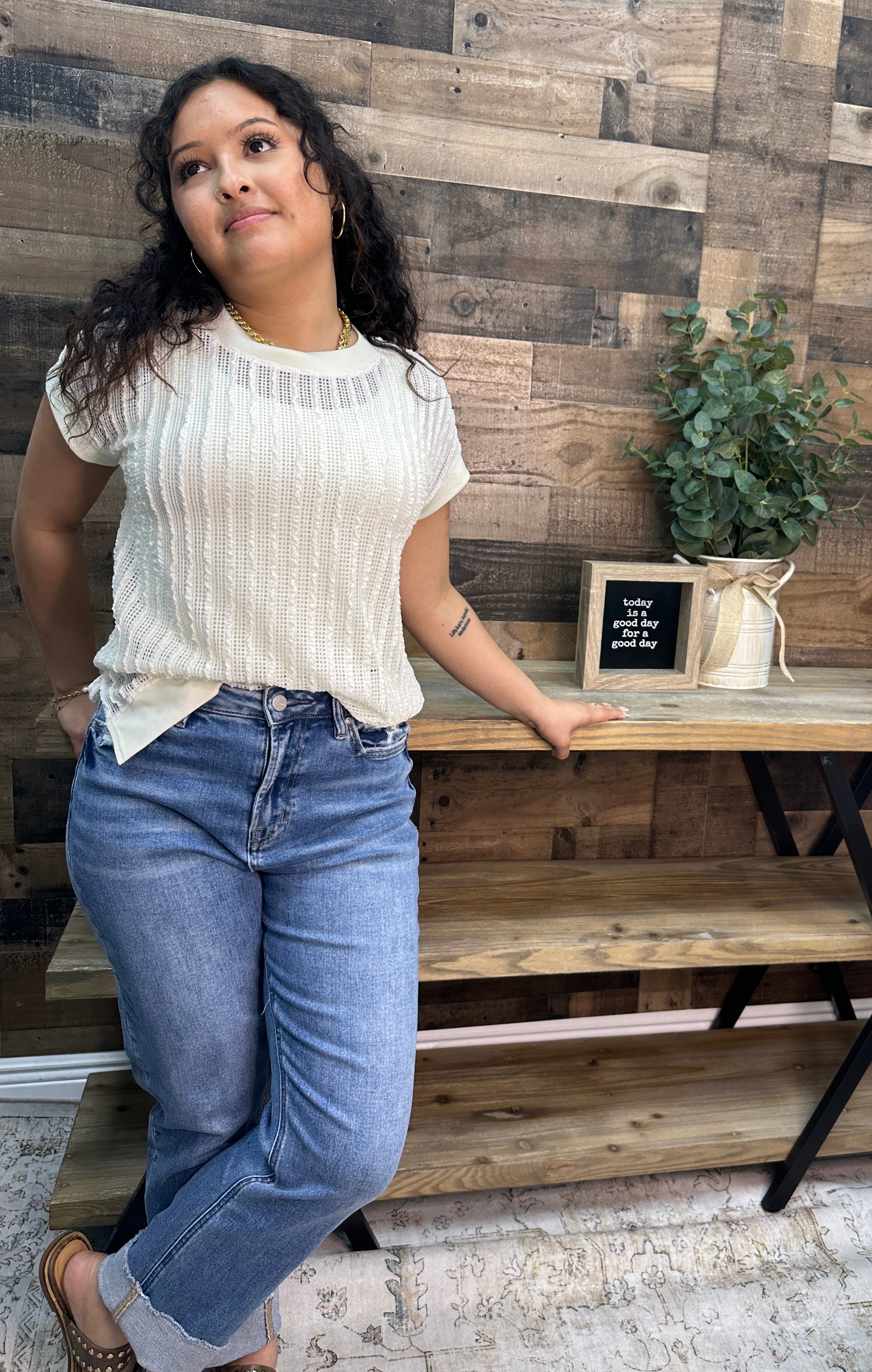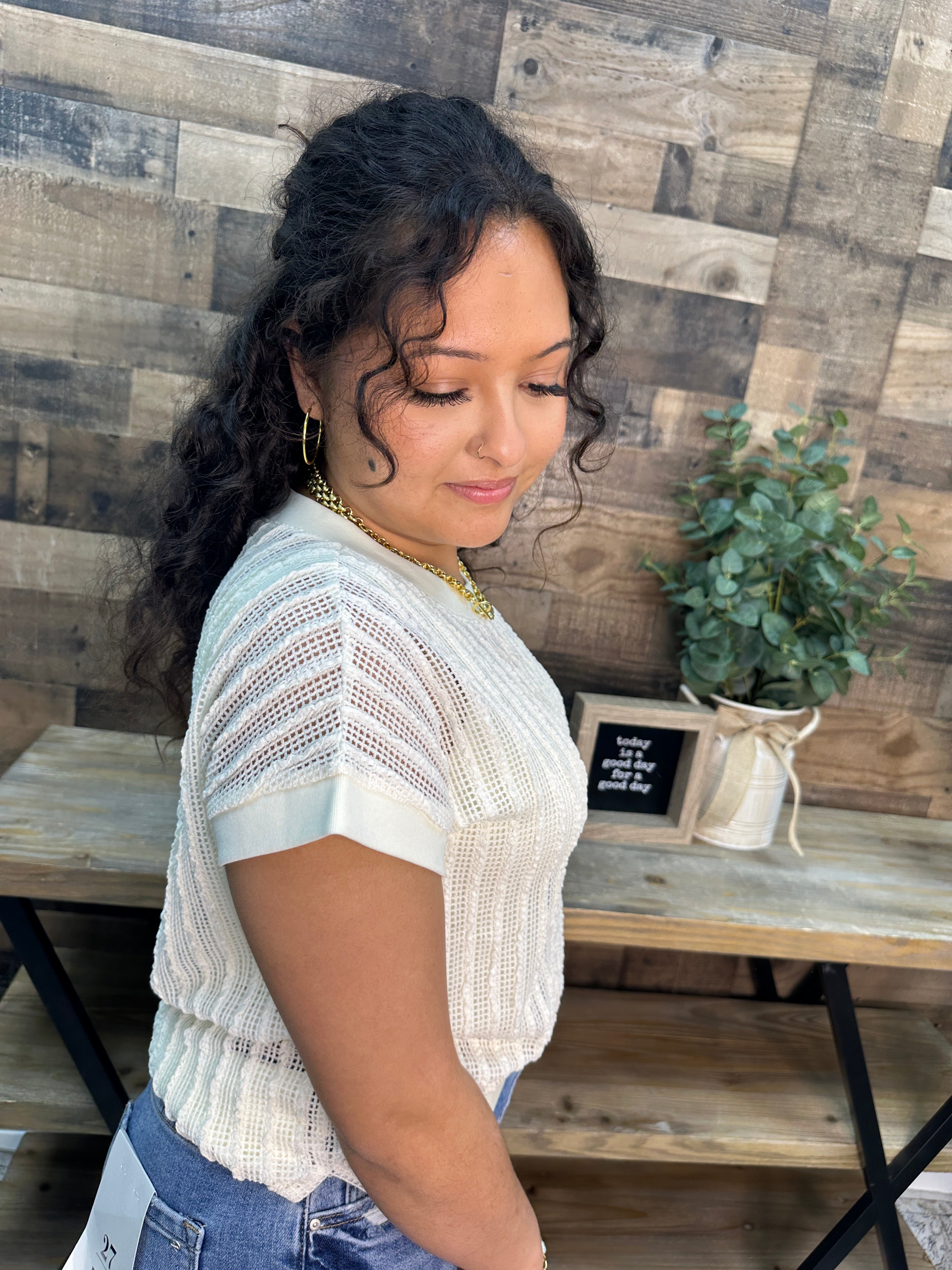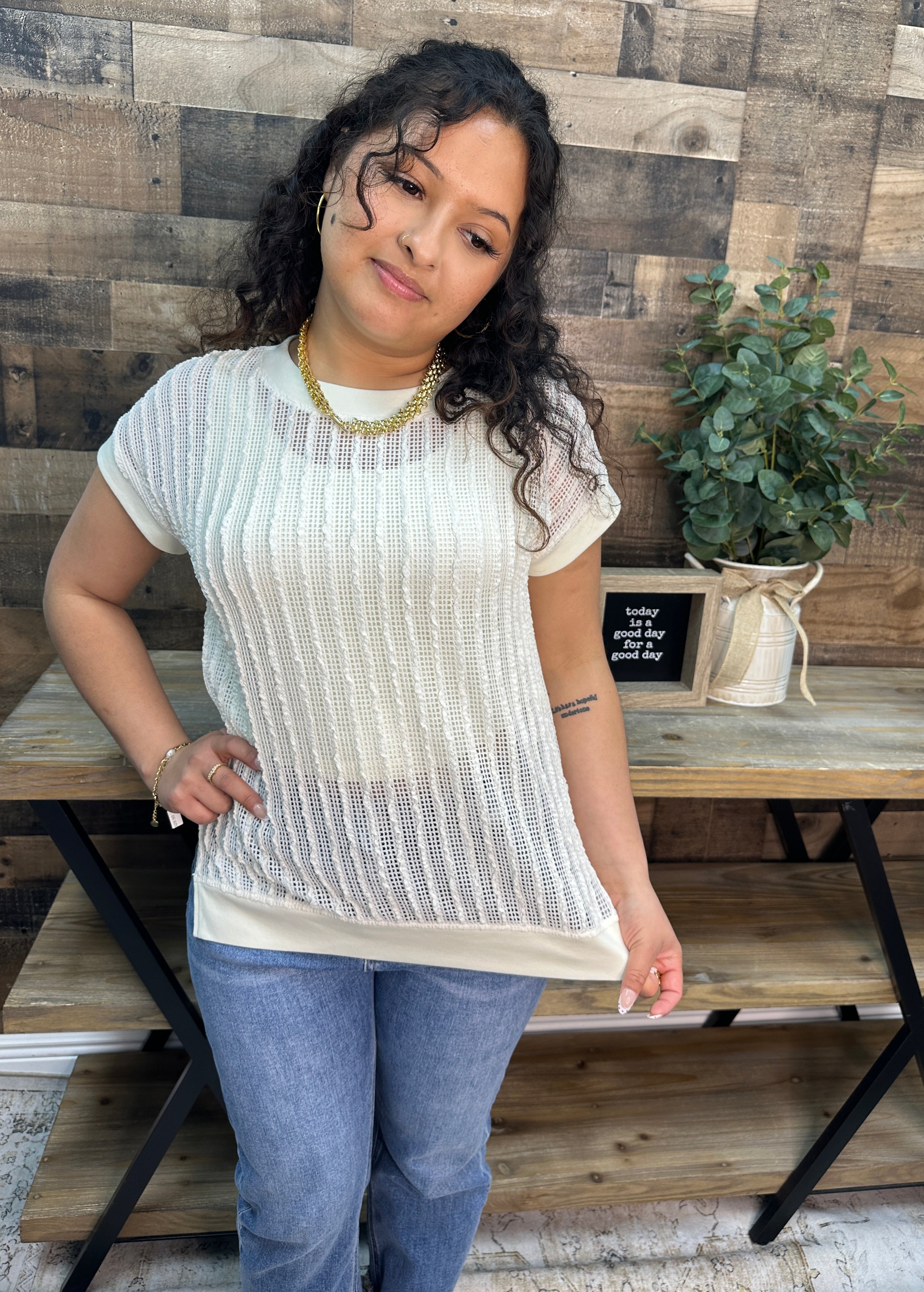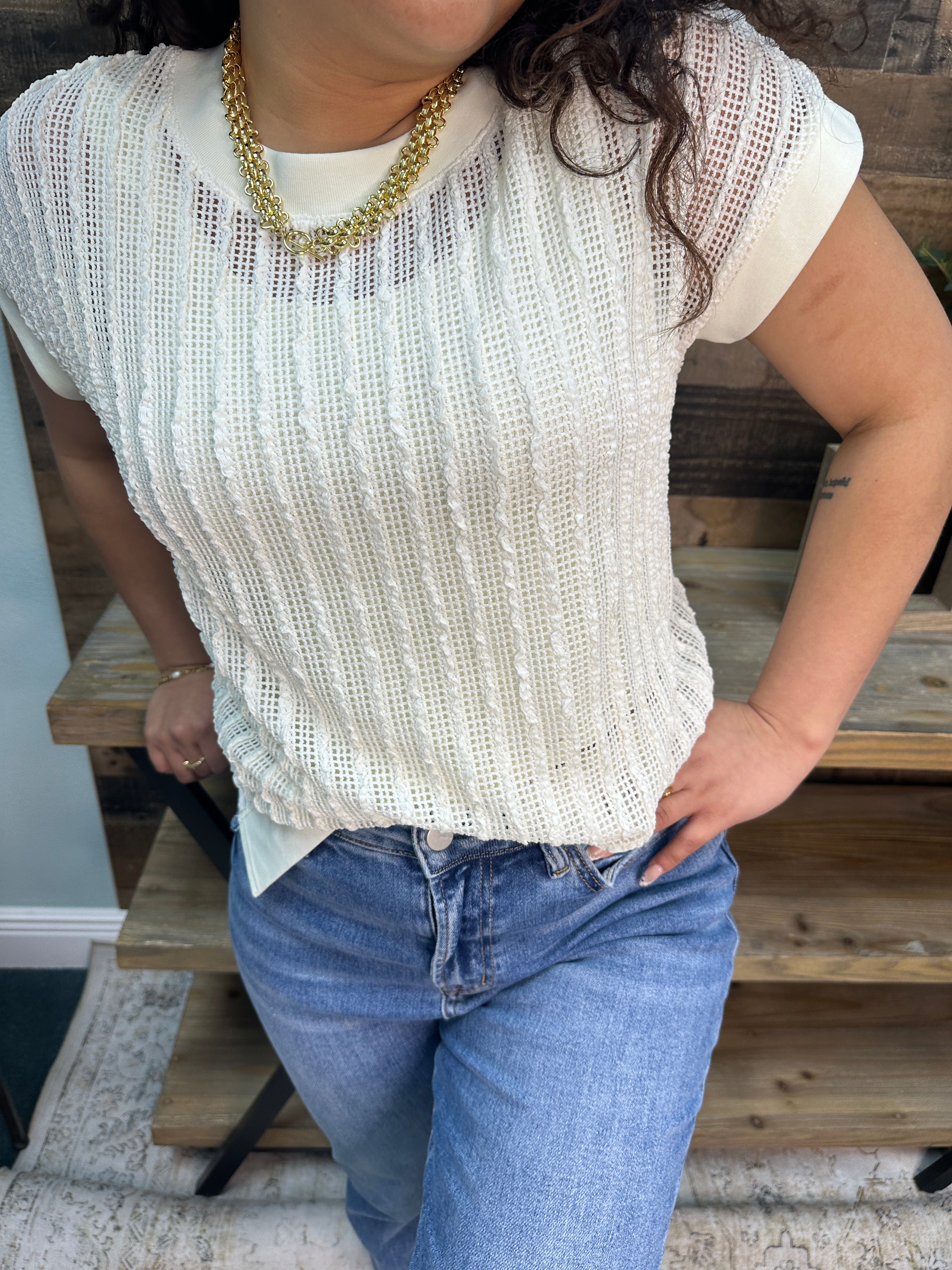 Effortlessly chic meets breathable comfort in this open weave top. The vertical striped texture creates visual interest while the see-through knit keeps things light and airy—perfect for layering or showing off your favorite bralette. Short sleeves and flattering side slits add movement and dimension to your everyday look. In crisp ivory, it's the versatile piece your wardrobe has been waiting for.